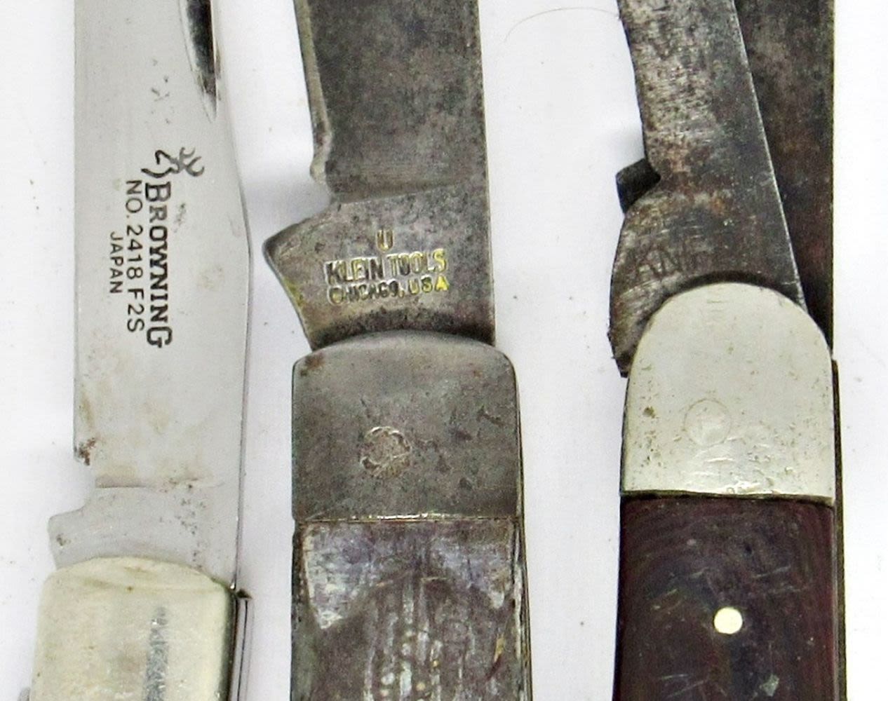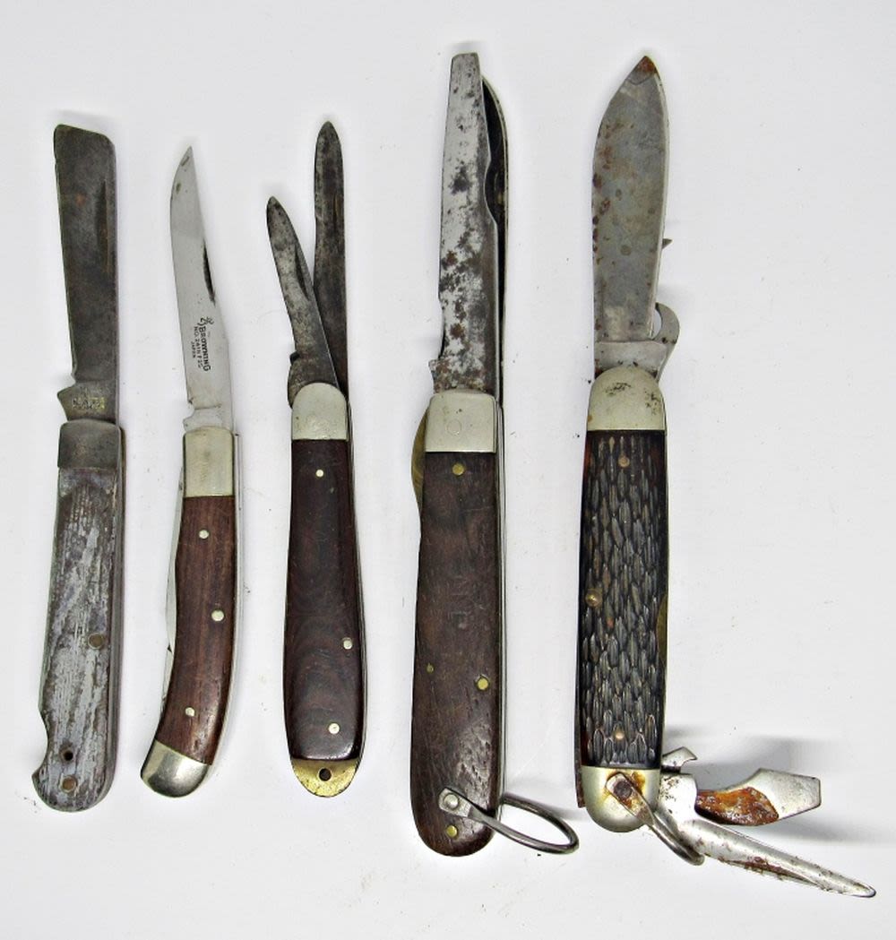 2-Blade Ulster Knife USA, 4-Blade Ulster USA, 2-Blade Prov. RI, Single Blade Klein Tools, 3-Blade Browning No. 2418F2S; All Used Conditions.