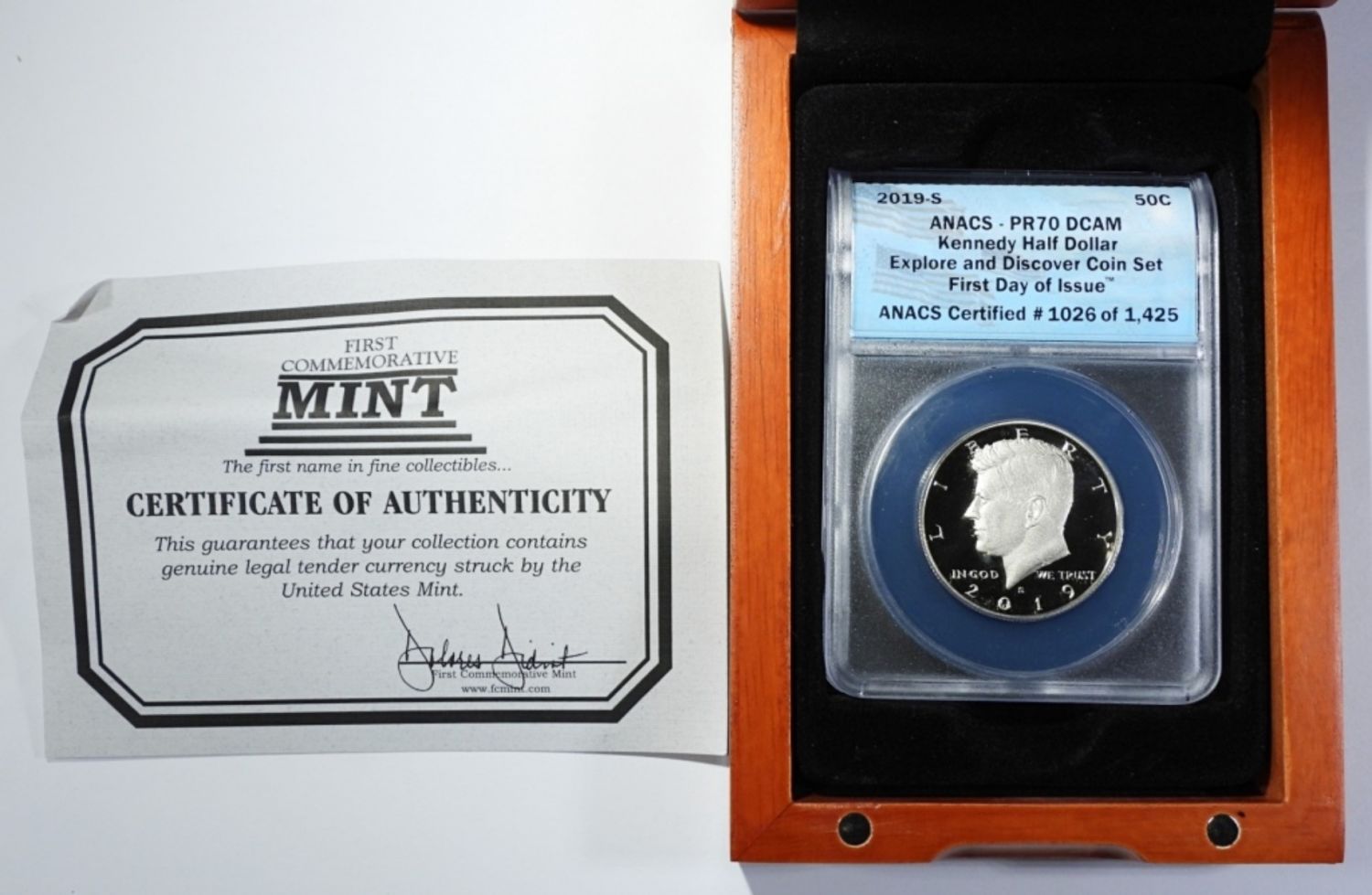 FIRST DAY OF ISSUE, FROM EXPLORE AND DISCOVER COIN SET. IN WOODEN DISPLAY BOX WITH FIRST COMMEMORATIVE MINT COA.