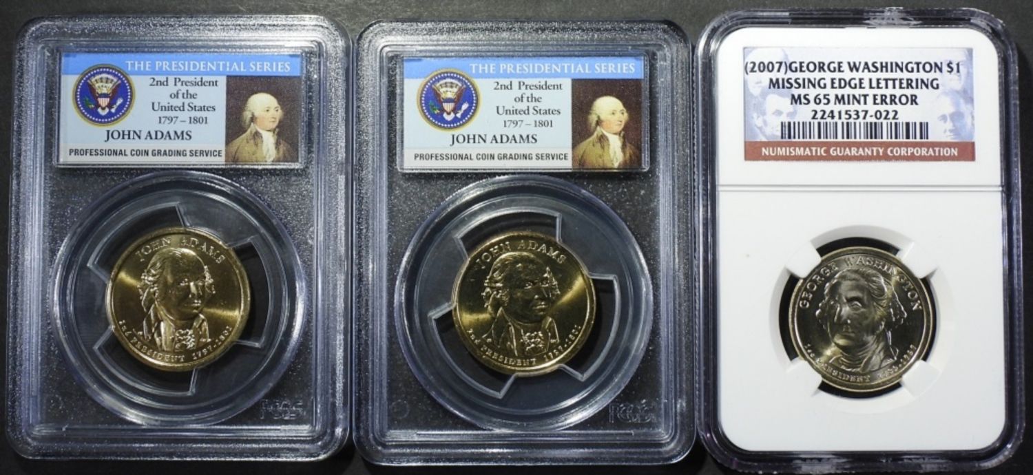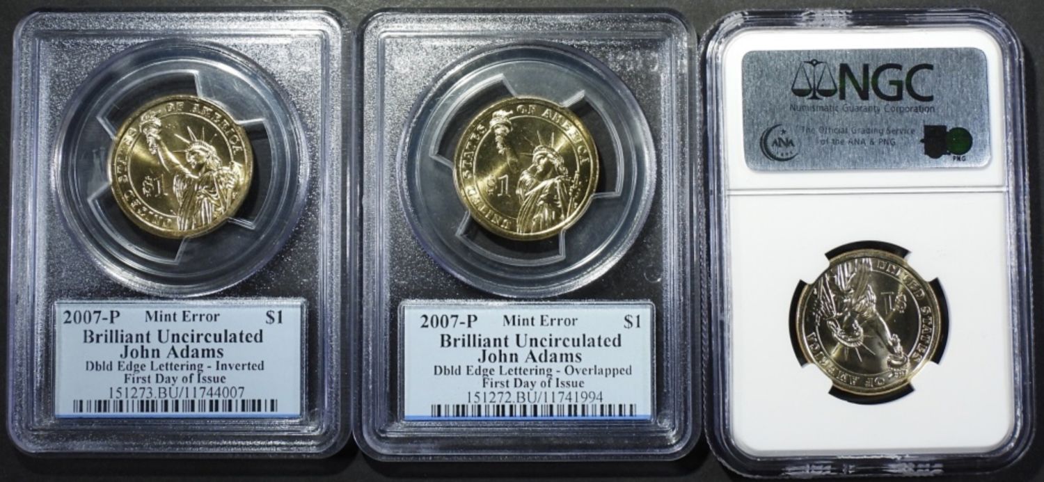 (2007) GEORGE WASHINGTON NGC MS-65 MISSING EDGE LETTERING, 2007-P JOHN ADAMS PCGS BU FDOI DOUBLED EDGE LETTERING-OVERLAPPED, & 2007-P JOHN ADAMS PCGS BU FDOI DOUBLED EDGE LETTERING- INVERTED.