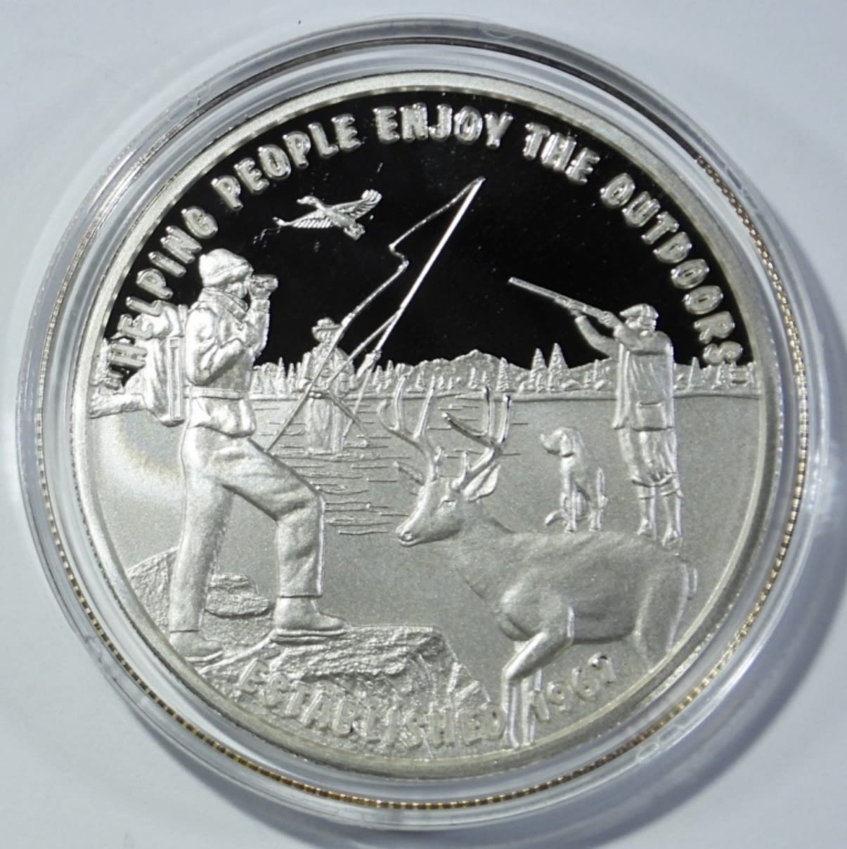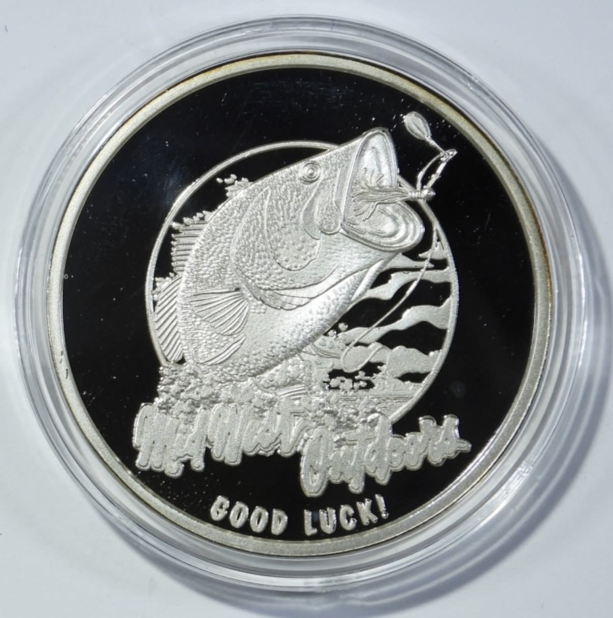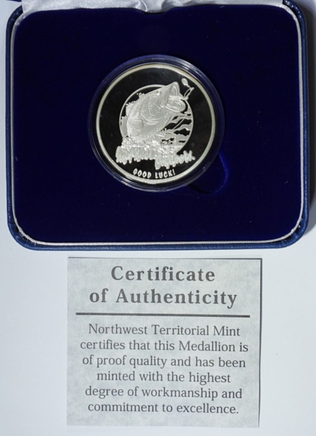 MIDWEST OUTDOORS GOOD LUCK MEDALLION “HELPING PEOPLE ENJOY THE OUTDOORS” IN DISPLAY BOX WITH COA. NORTHWEST TERRITORIAL MINT.
