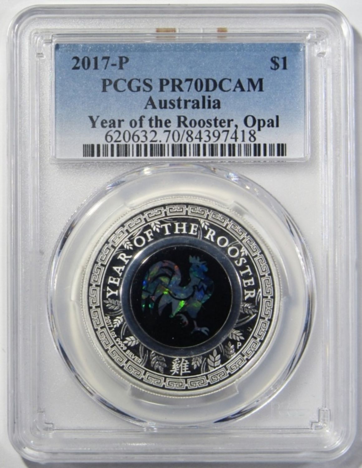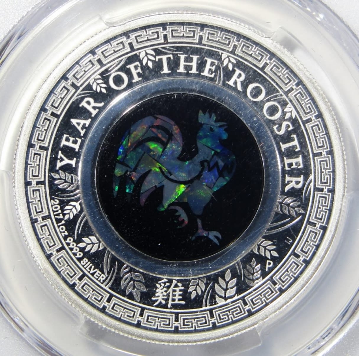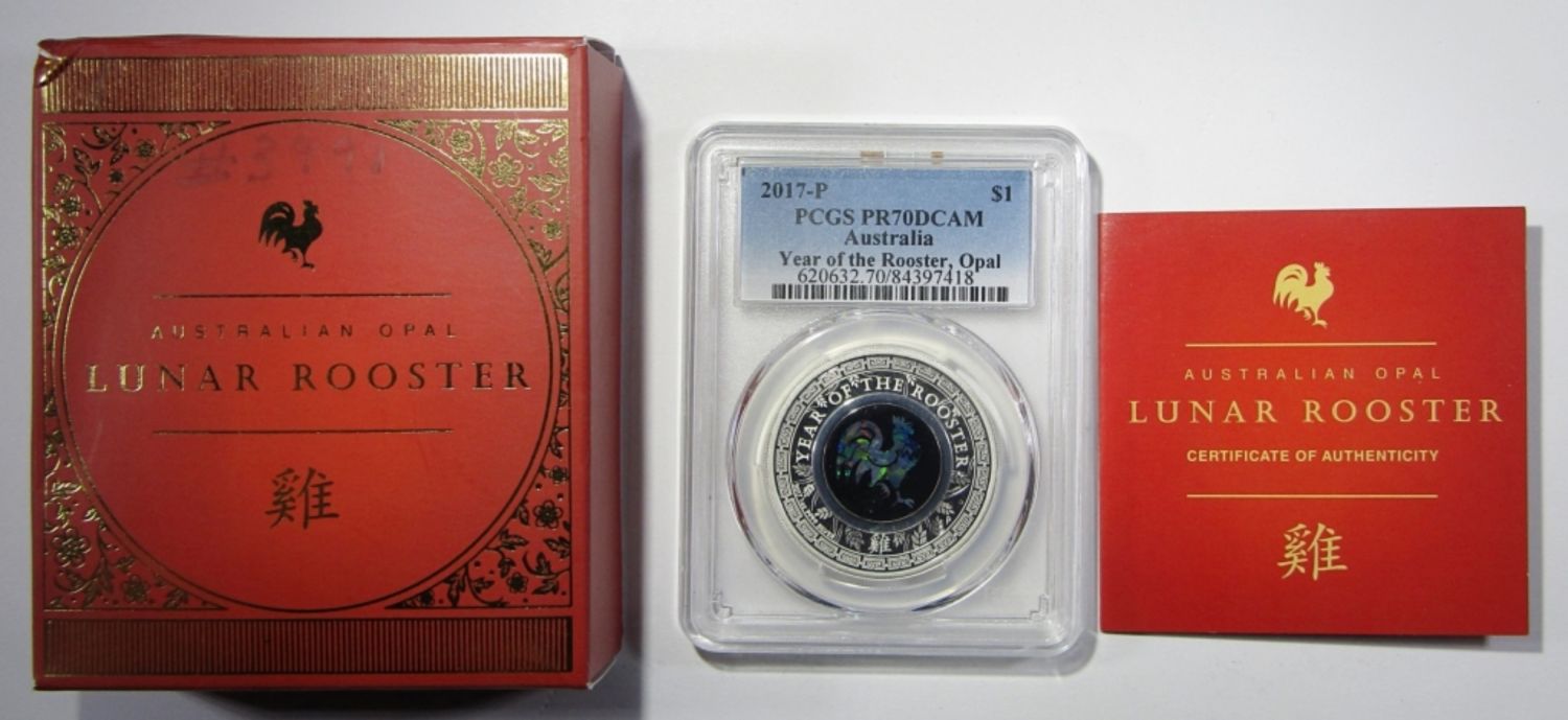 YEAR OF THE ROOSTER, OPAL. 1oz .999 SILVER AUSTRALIAN OPAL LUNAR ROOSTER WITH OGP & COA, DAMAGED CASE.
