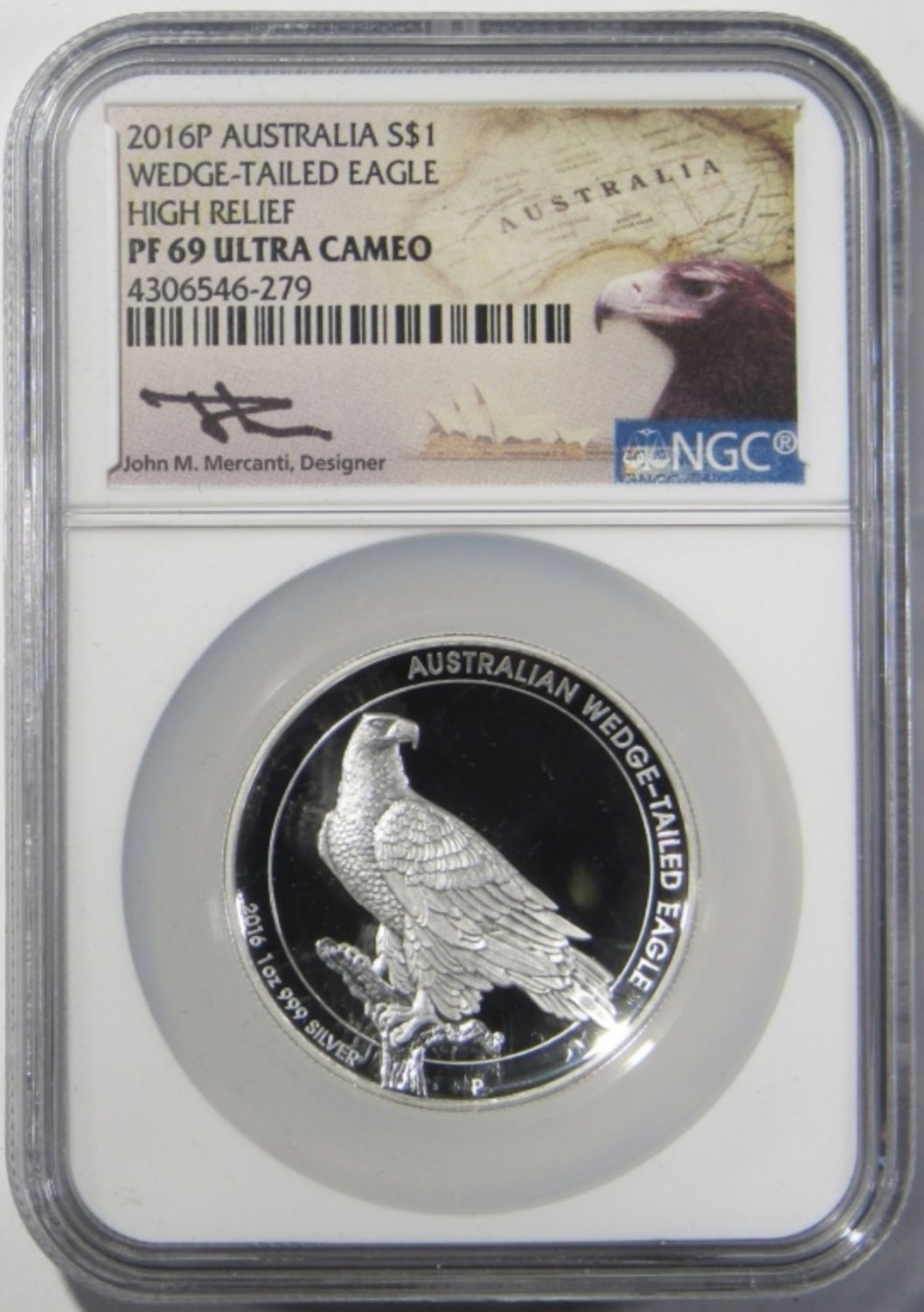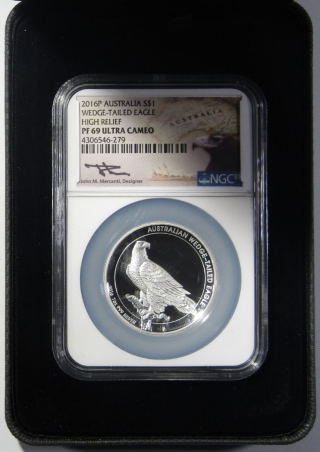 AUSTRALIA HIGH RELIEF 1oz .999 SILVER, JOHN MERCANTI SIGNED. IN OGP, MISSING COA.