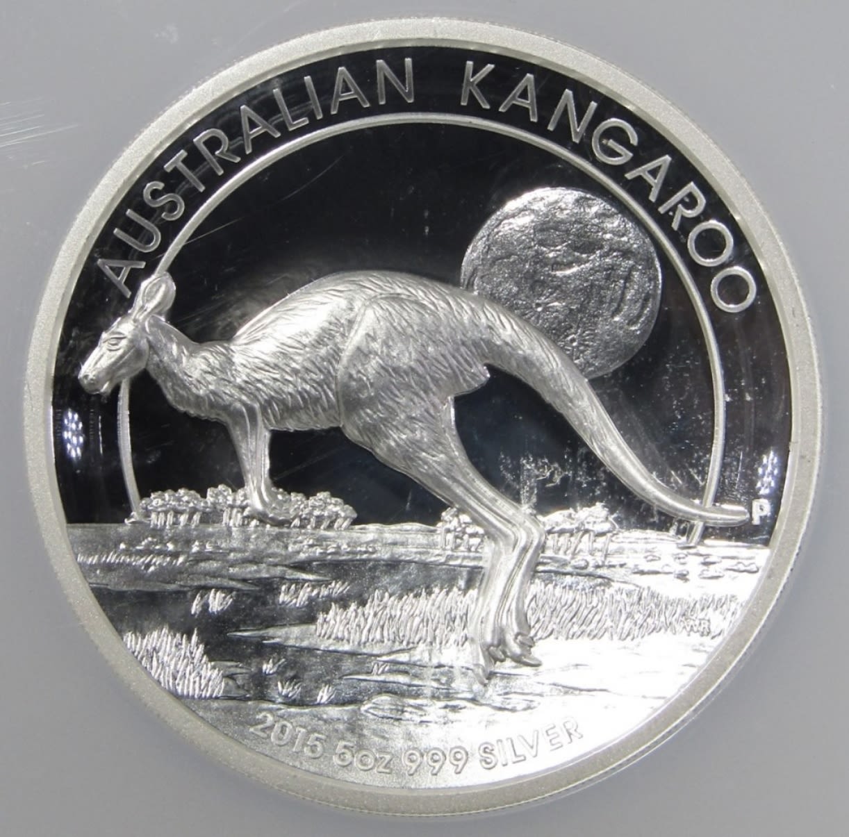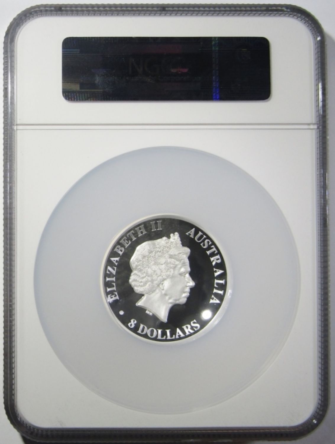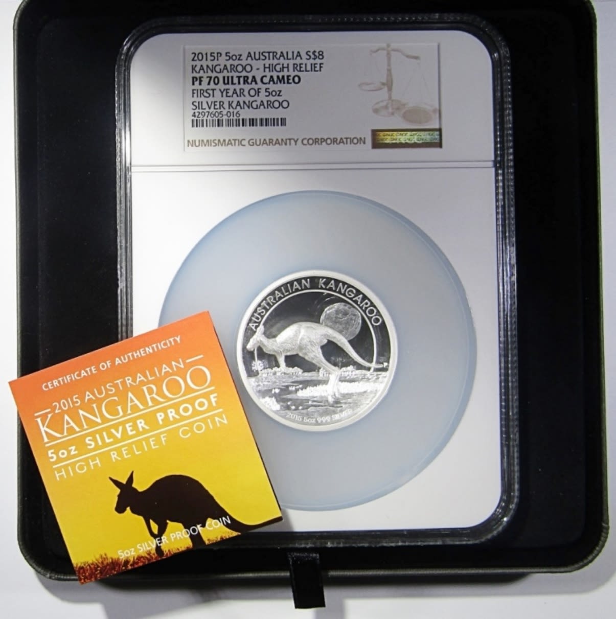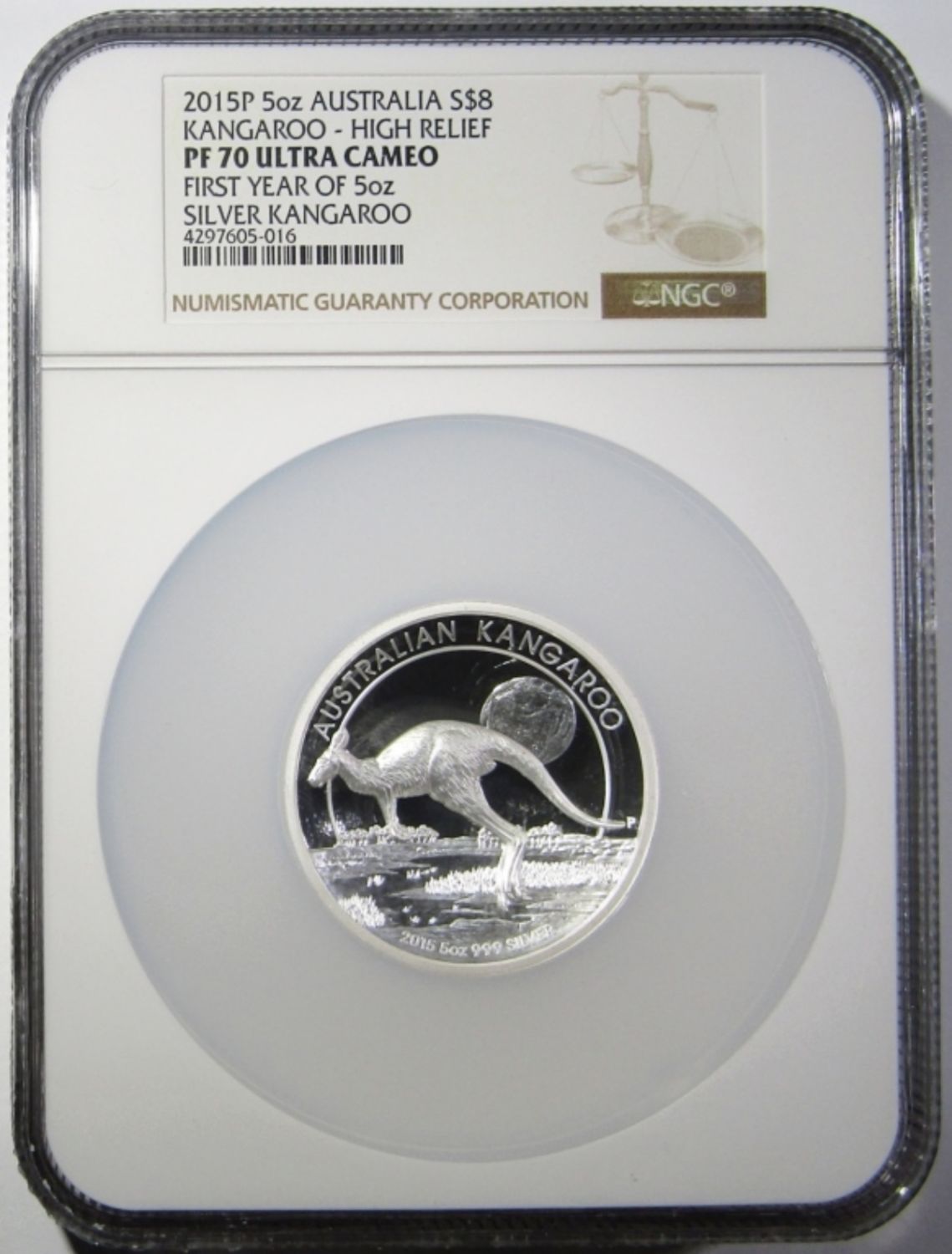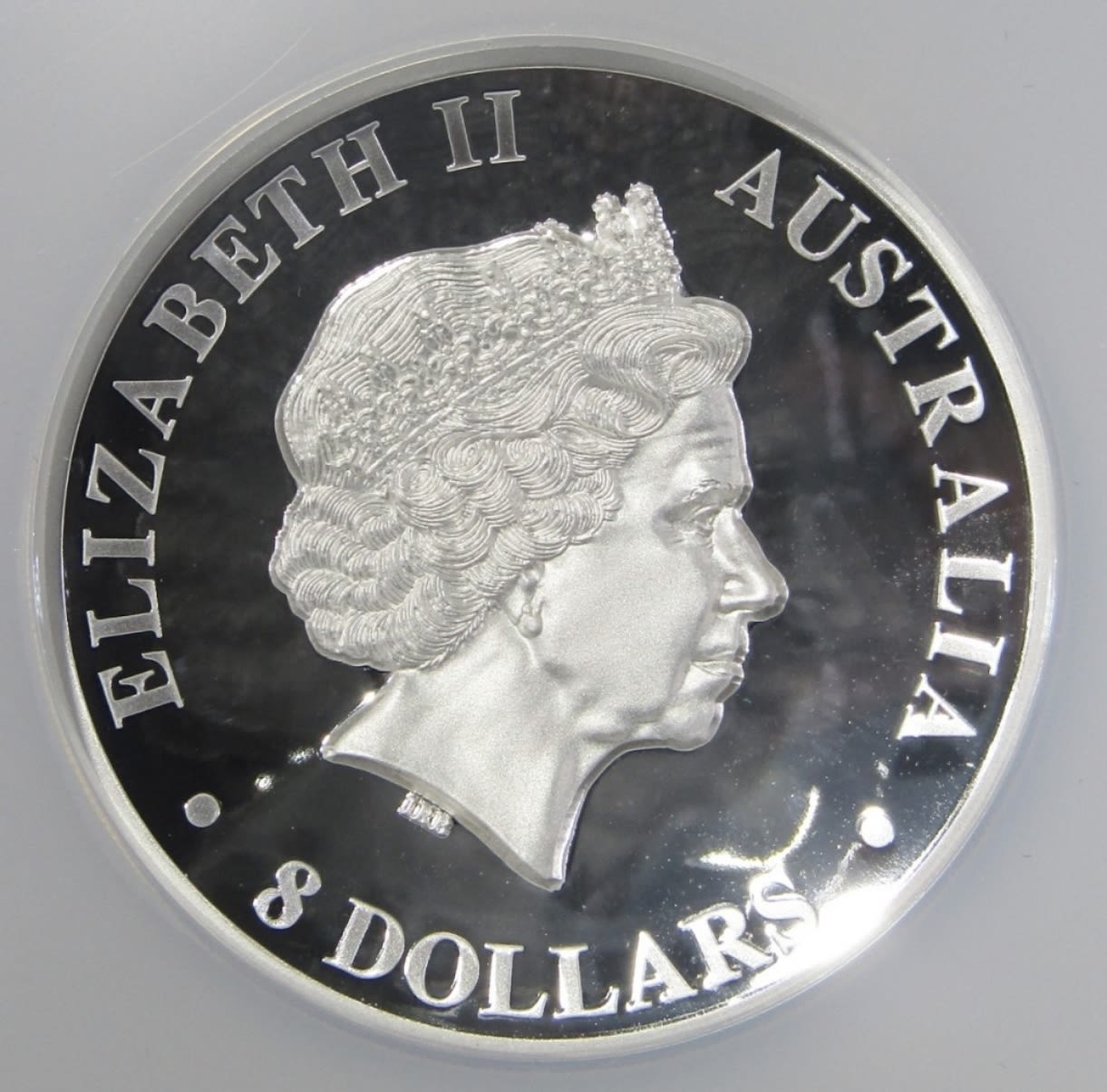 AUSTRALIA $8 HIGH RELIEF 5oz .999 SILVER, FIRST YEAR OF 5oz. IN DISPLAY CASE WITH COA.