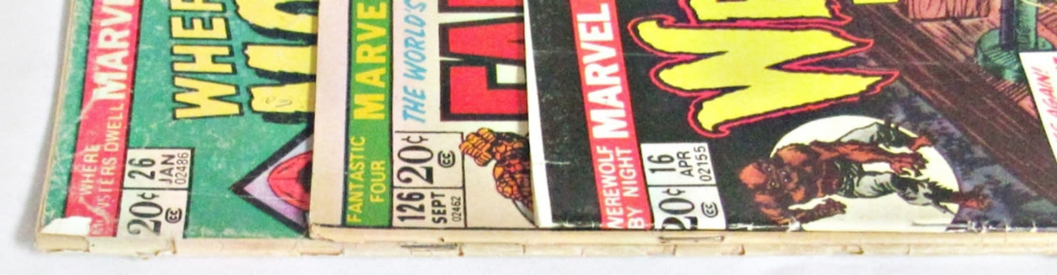 1972 #126 FANTASTIC FOUR VG+, 1974 #16 WEREWOLF GOOD, 1974 #26 WHERE MONSETERS DWELL FAIR