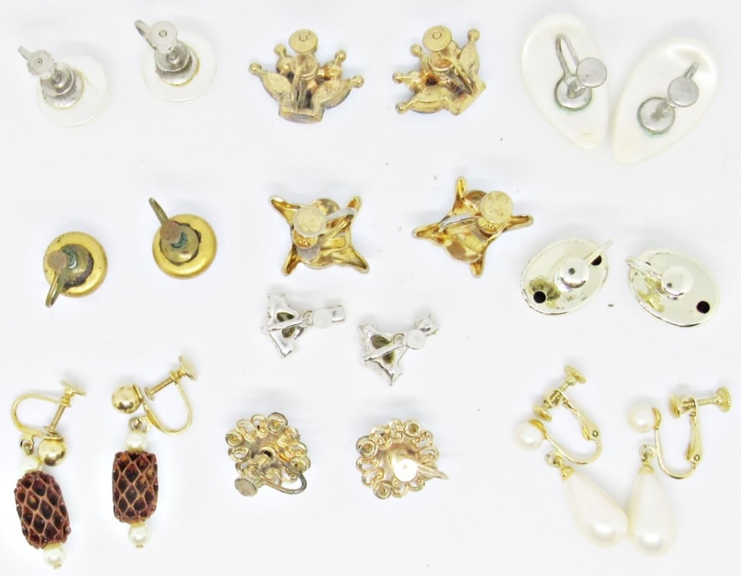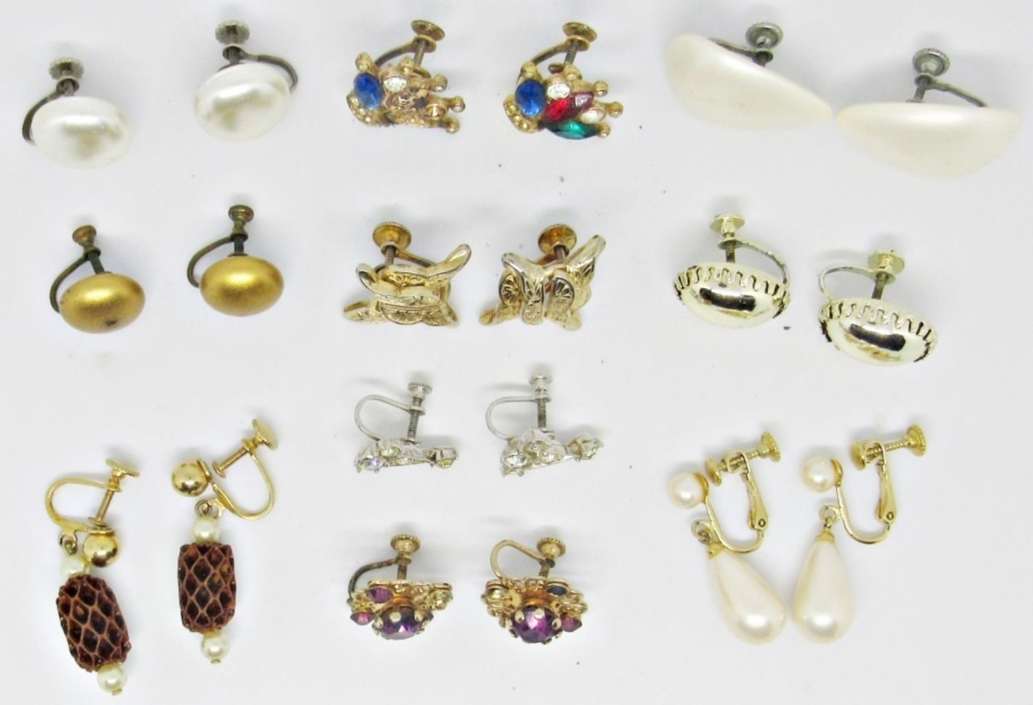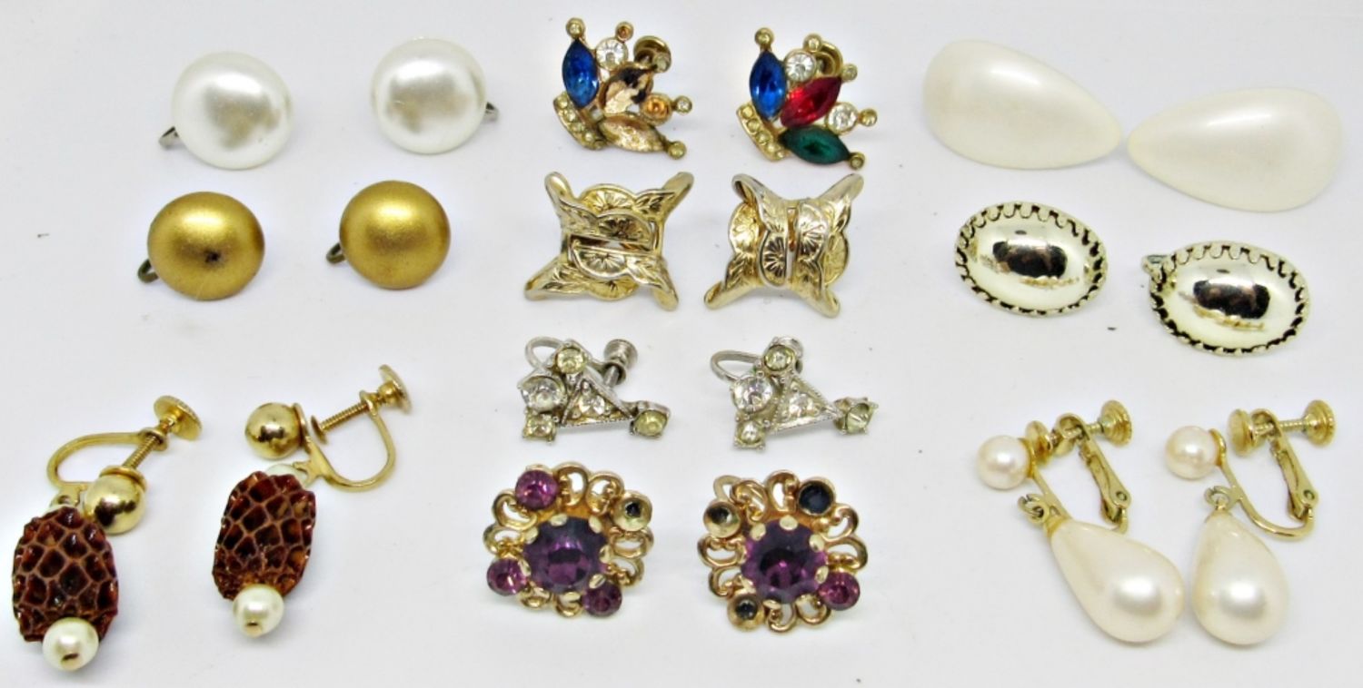 3- FAUX PEARL STYLE, 1- BUTTERFLY, OVAL, 1 CLEAR RHINESTONE SET, 1- PINECONE SET, 1- ROUND SET, PURPLE STONE SET AND, CROWN SET W/ RED, BLUE, GREEN STONES, (A RED AND GREEN STONE IS MISSING FROM ONE EARRING FOR REAPAIR
