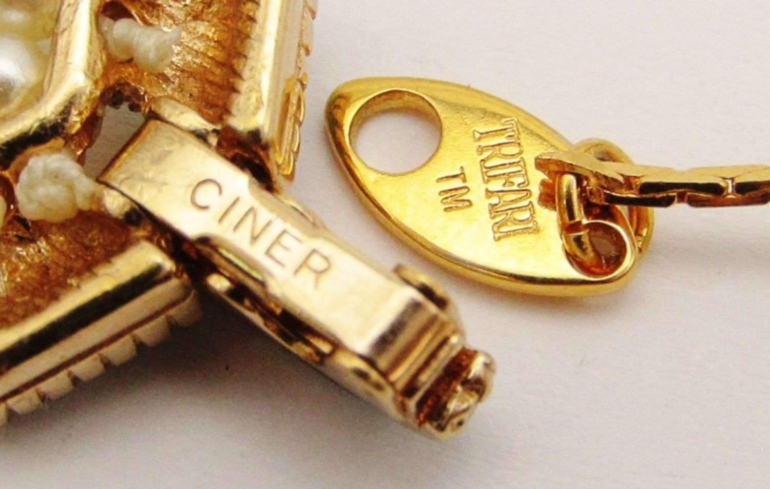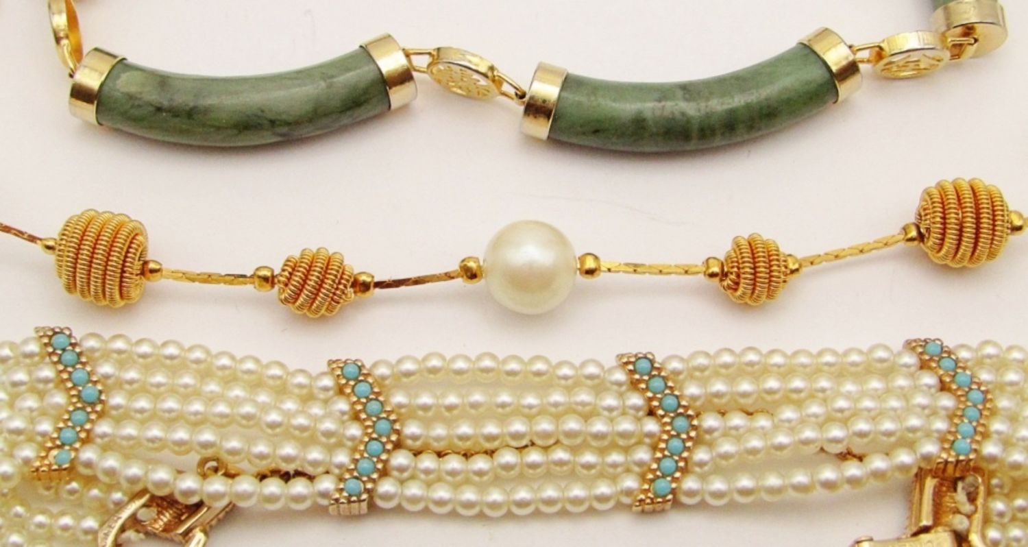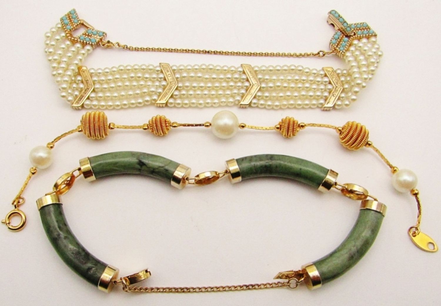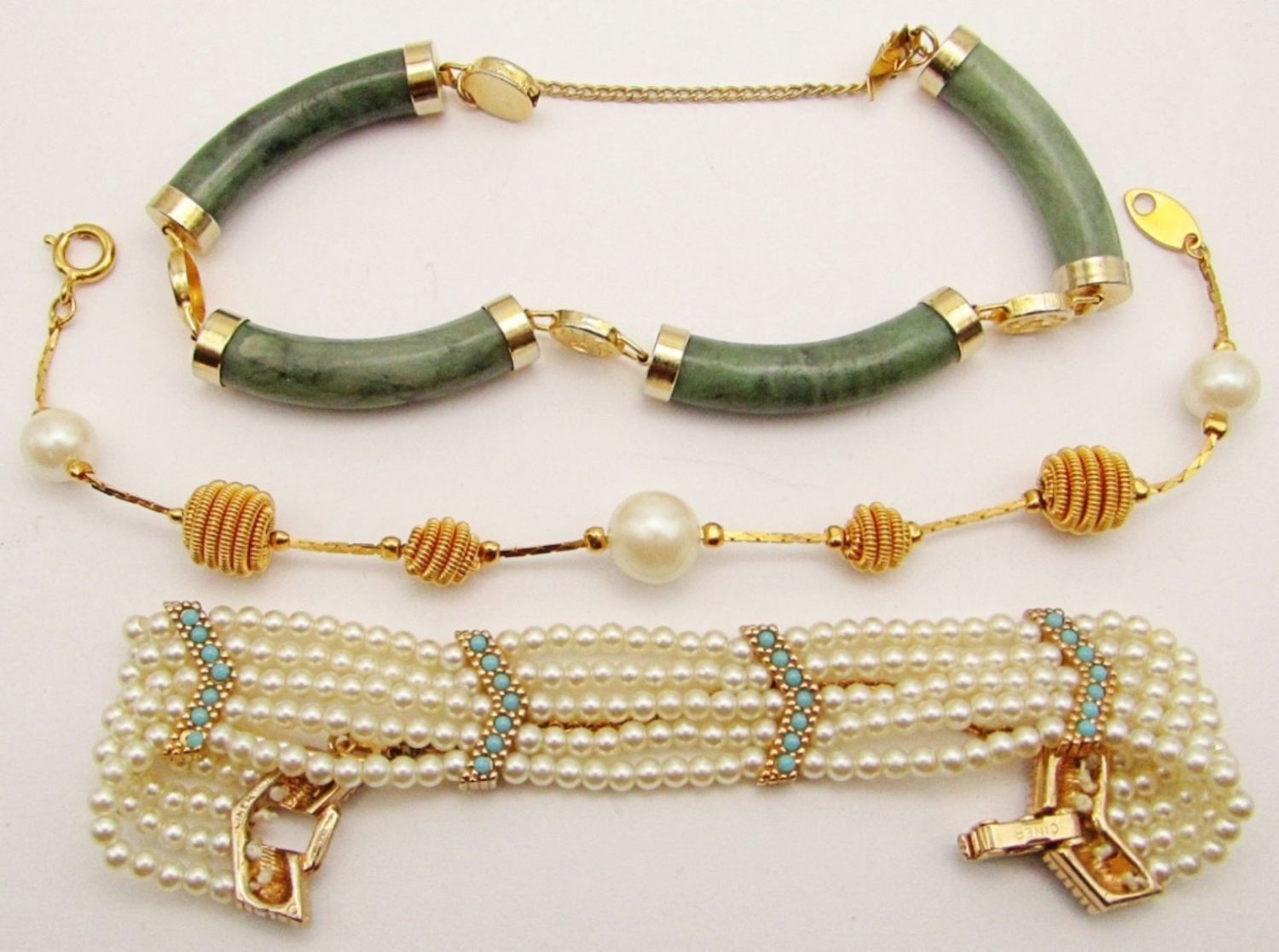 Faux Jade Gold Tone Chinese Characters, Ciner Faux Pearl & Turquoise Beaded Multi-Strand, Trifari Faux Pearl and Gold Tone Beads;