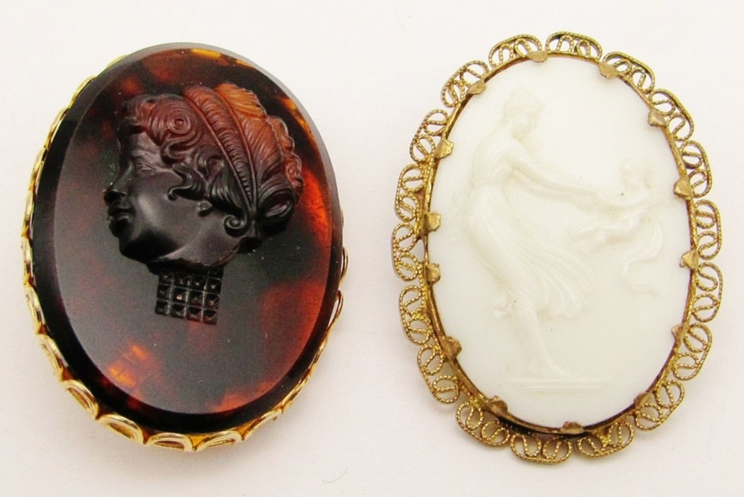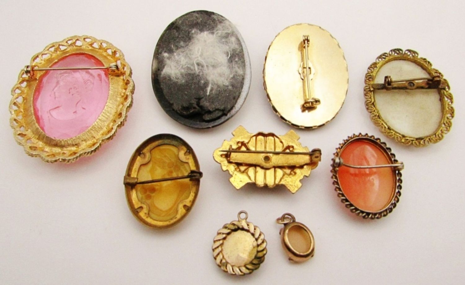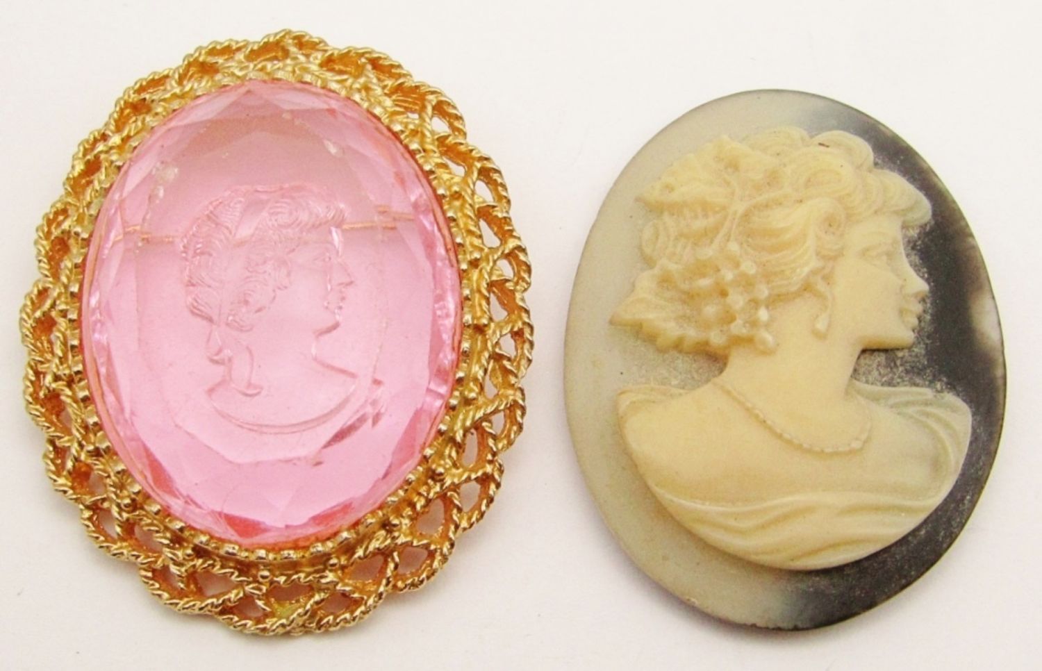 Reverse Carved Pink Filigree Brooch, Porcelain Victorian Brooch, Hand Carved Shell (Pin Broke on Back), Victorian German Cameo Brown Topaz Amber Guilloche Brooch (Neck Broken Off), White on Black Ornate Frame