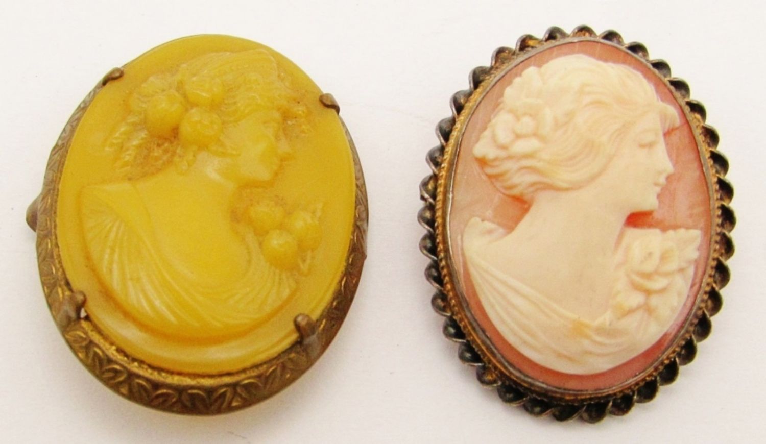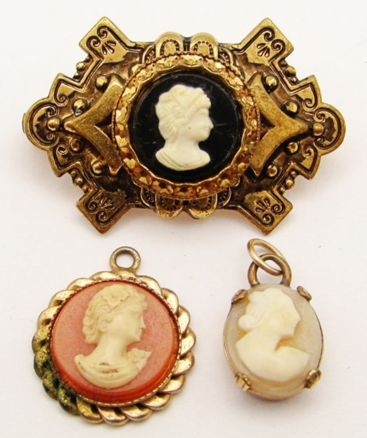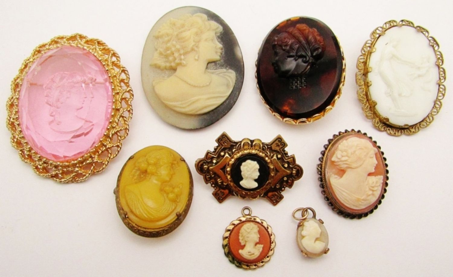 Reverse Carved Pink Filigree Brooch, Porcelain Victorian Brooch, Hand Carved Shell (Pin Broke on Back), Victorian German Cameo Brown Topaz Amber Guilloche Brooch (Neck Broken Off), White on Black Ornate Frame