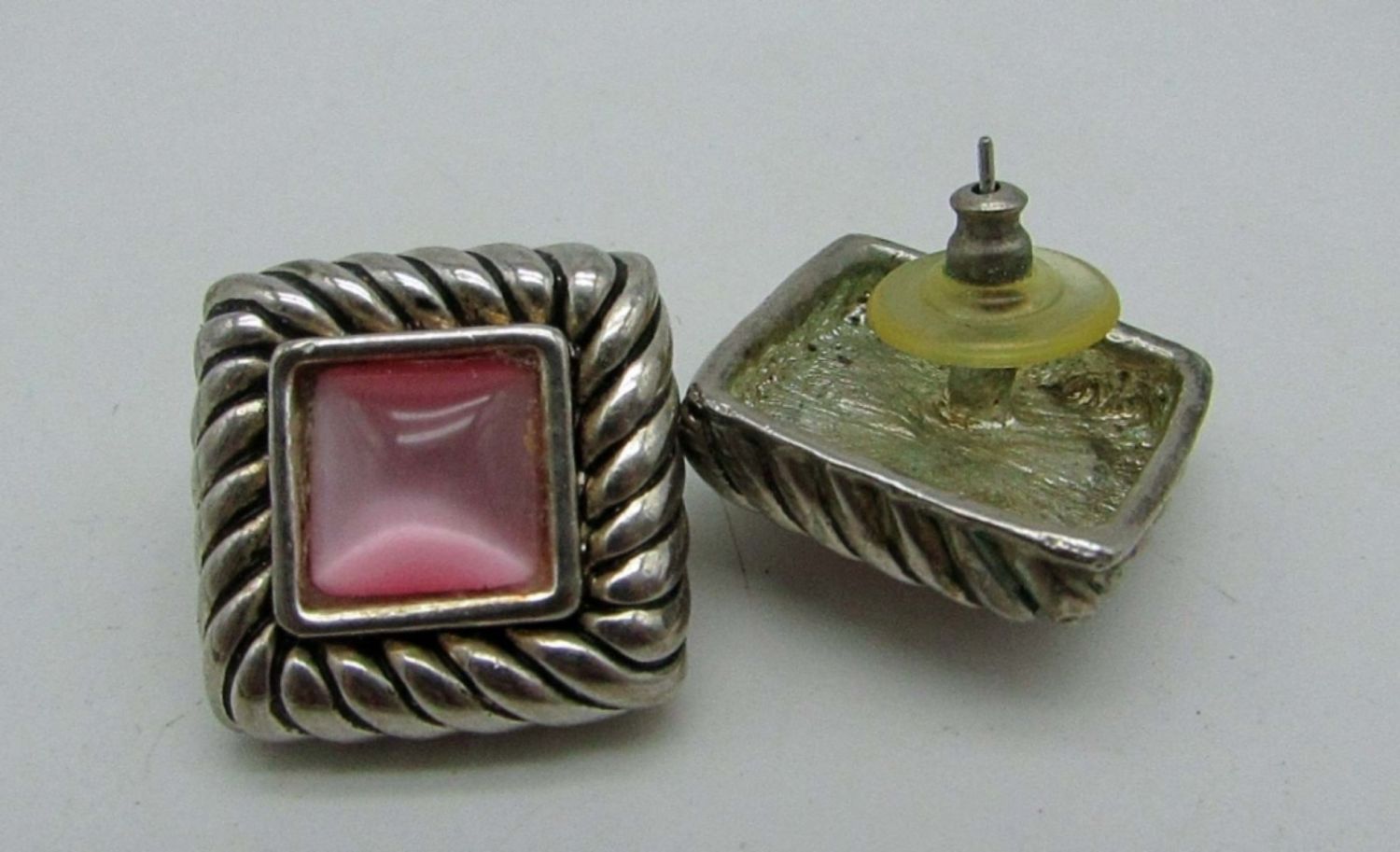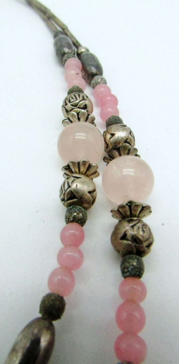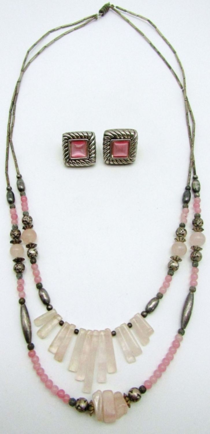 23IN LENGTH, DIFFERENT BEADING ALL AROUND, SCREW CLASP, PINK INLAY PIERCED EARRINGS, EARRING ARE NOT STERLING SLIVER TONE