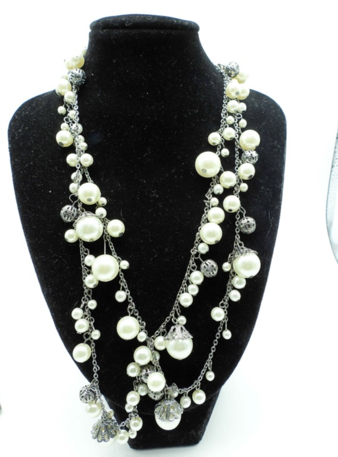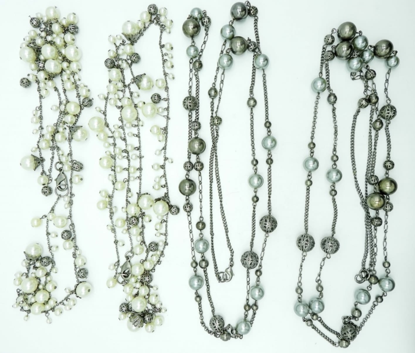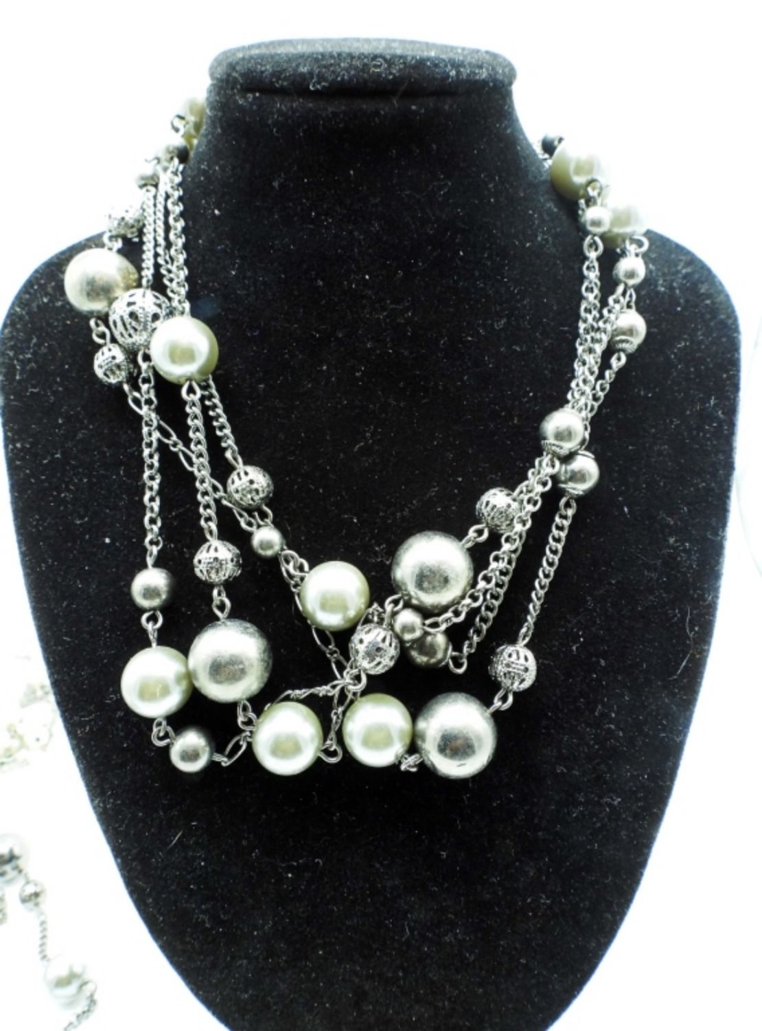 2- 38IN LONG SILVER BEADS ALONG WITH FAUX WHITE PEARLS ALL ALONG THE NECKLACES, 2- 60IN LONG WITH SILVER BEADS ALL ALONG, GREAT FOR LAYERING