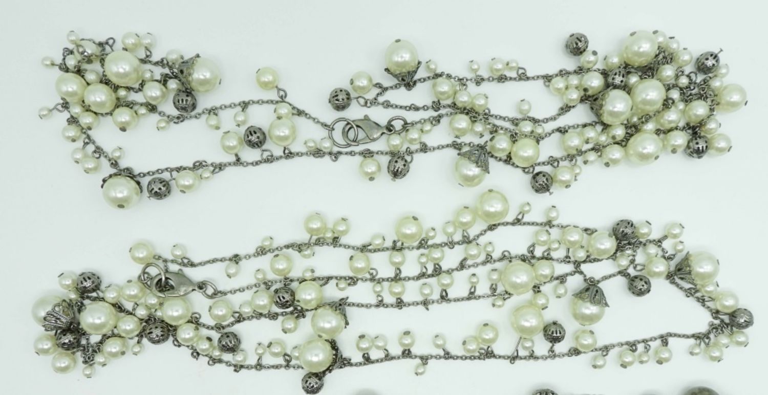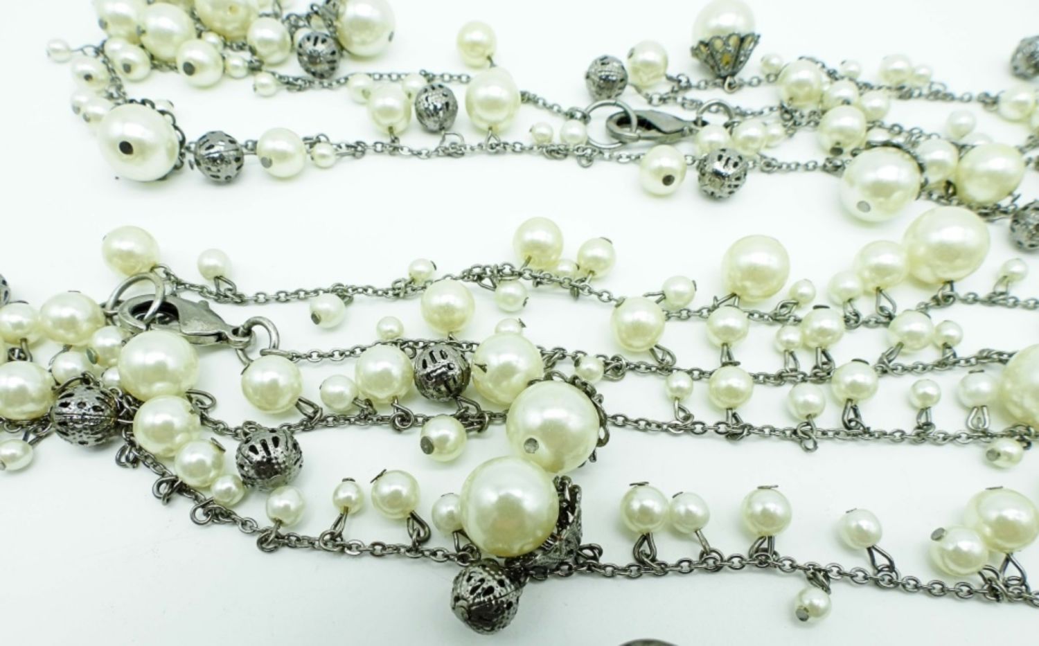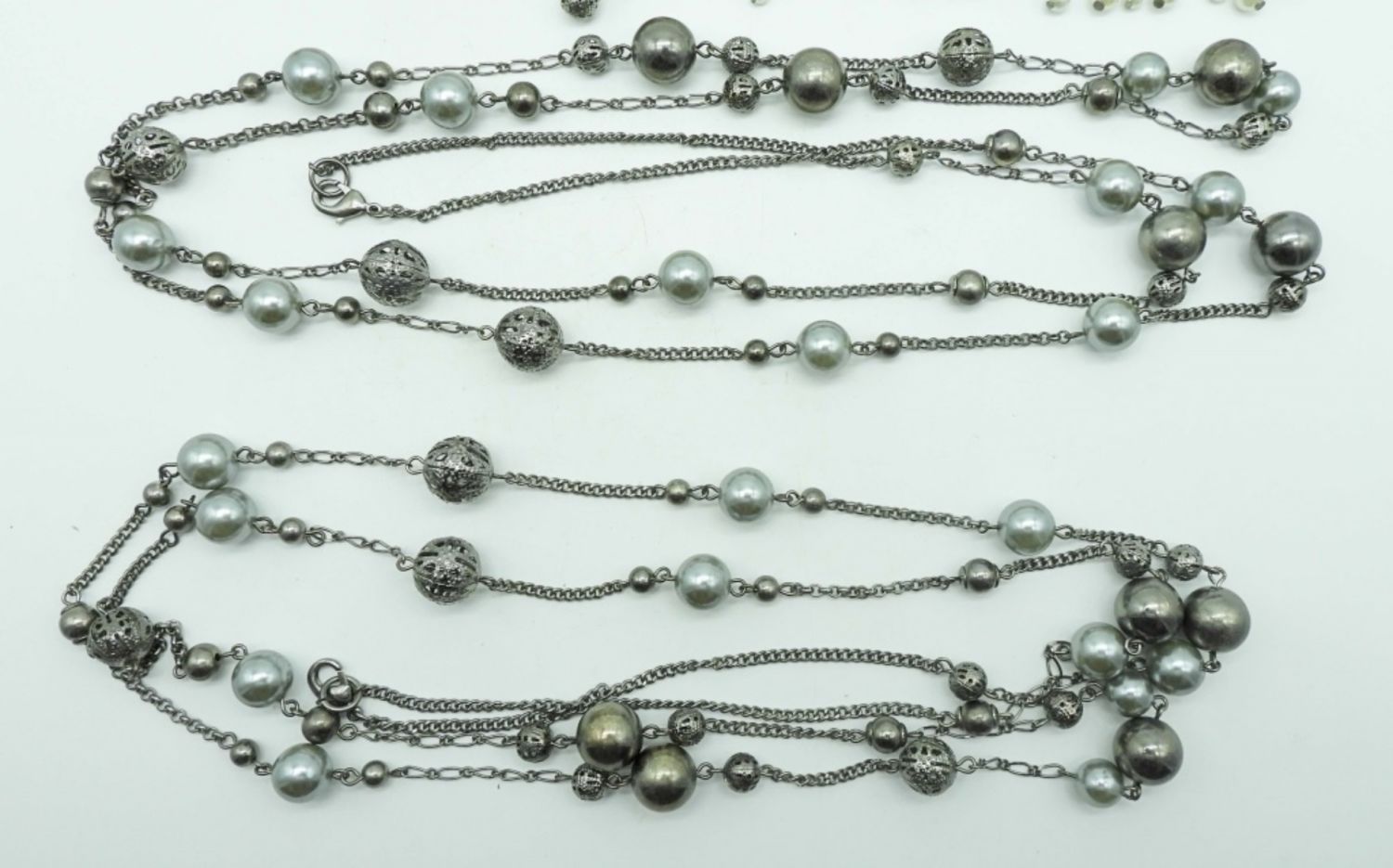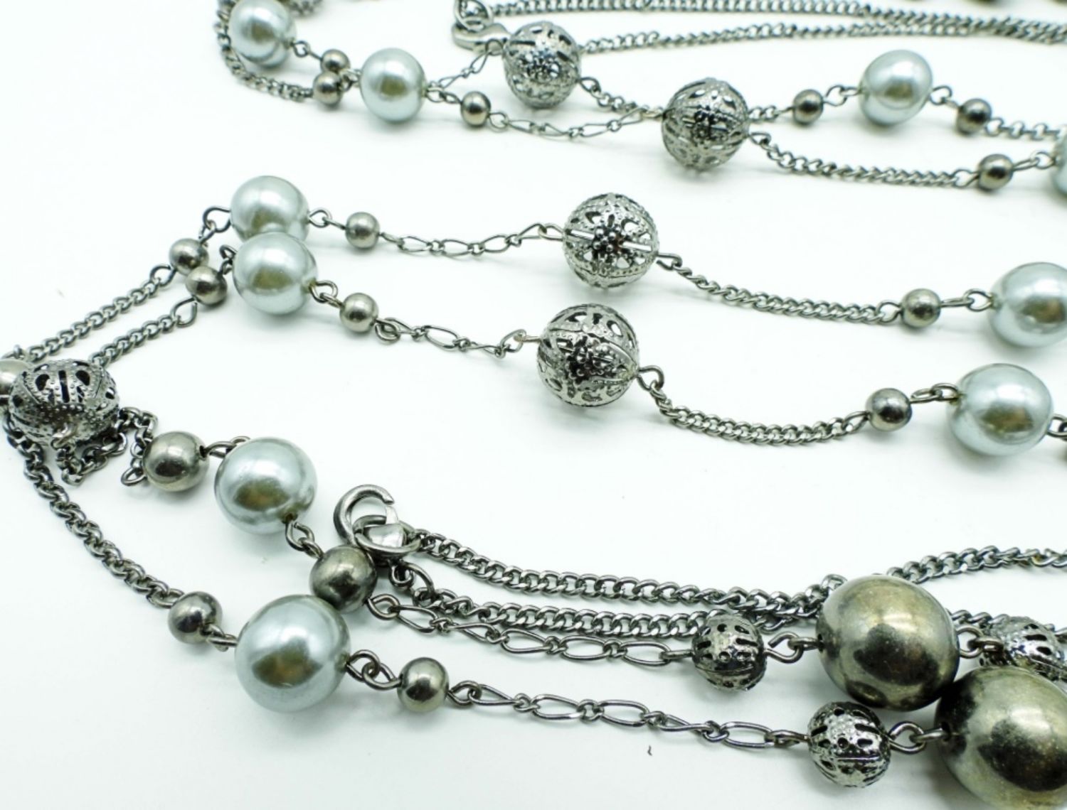 2- 38IN LONG SILVER BEADS ALONG WITH FAUX WHITE PEARLS ALL ALONG THE NECKLACES, 2- 60IN LONG WITH SILVER BEADS ALL ALONG, GREAT FOR LAYERING