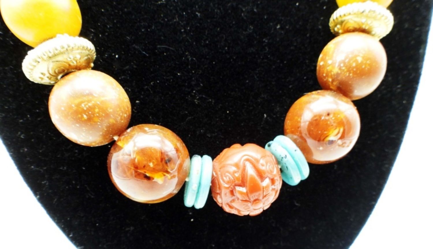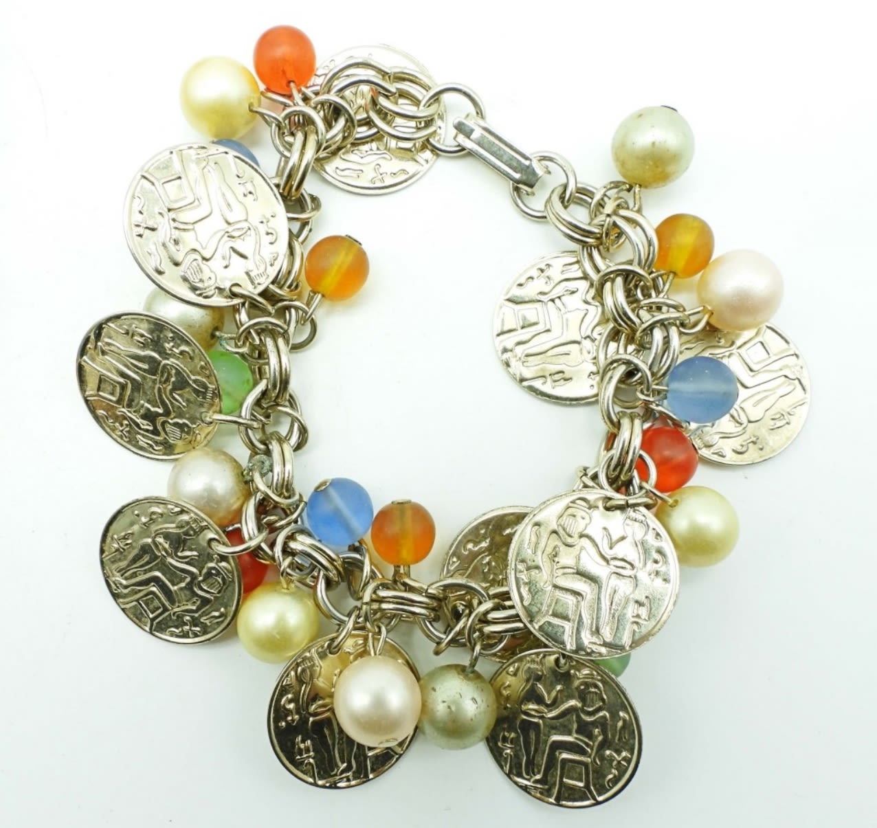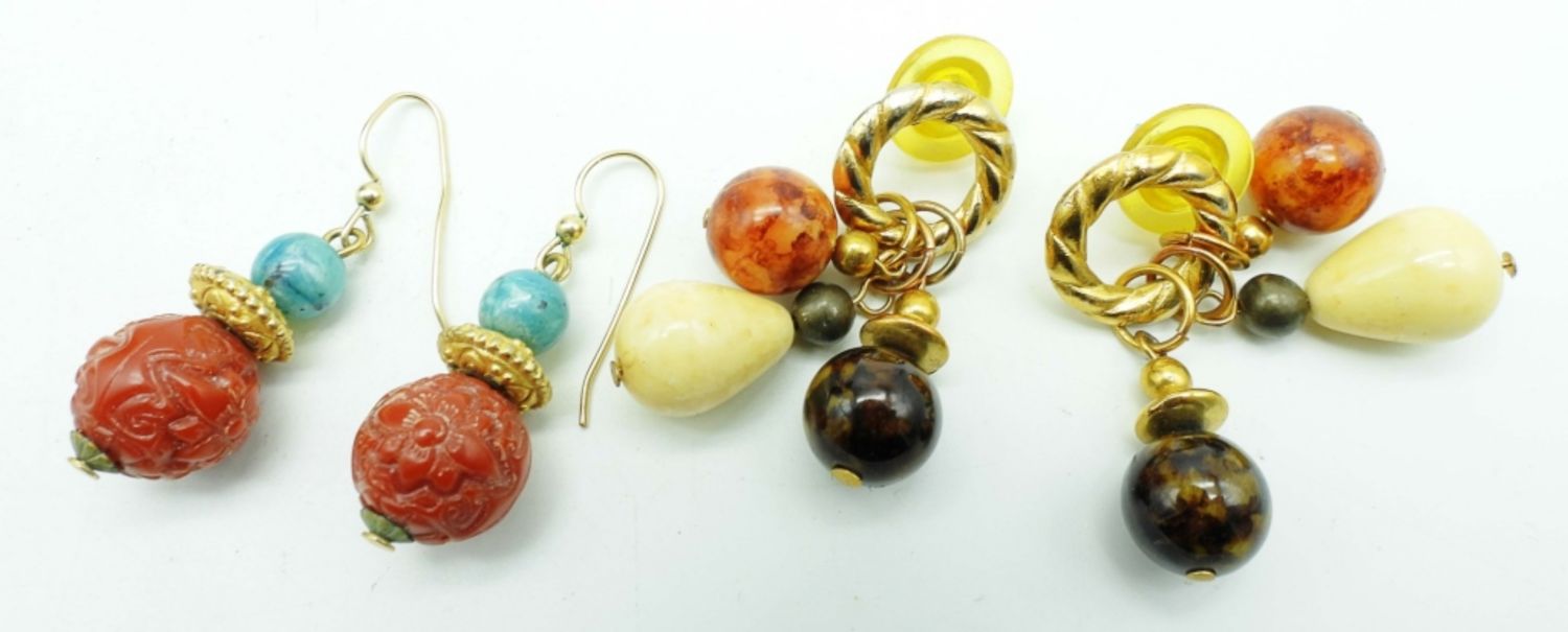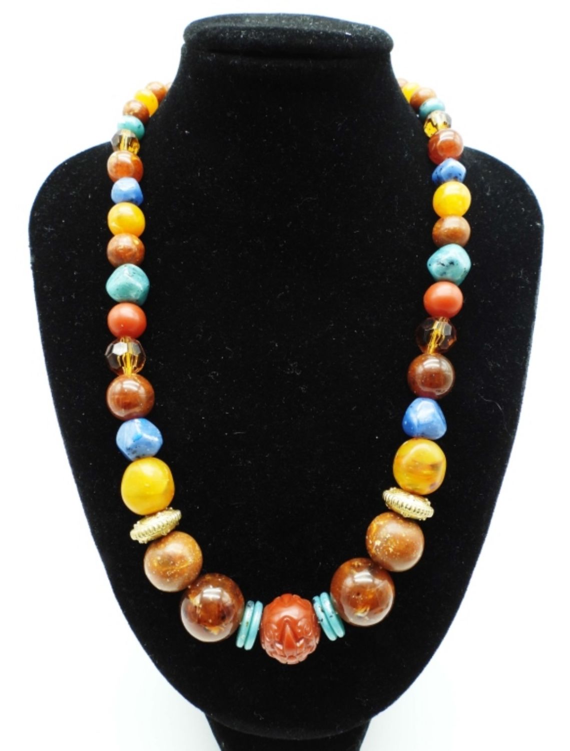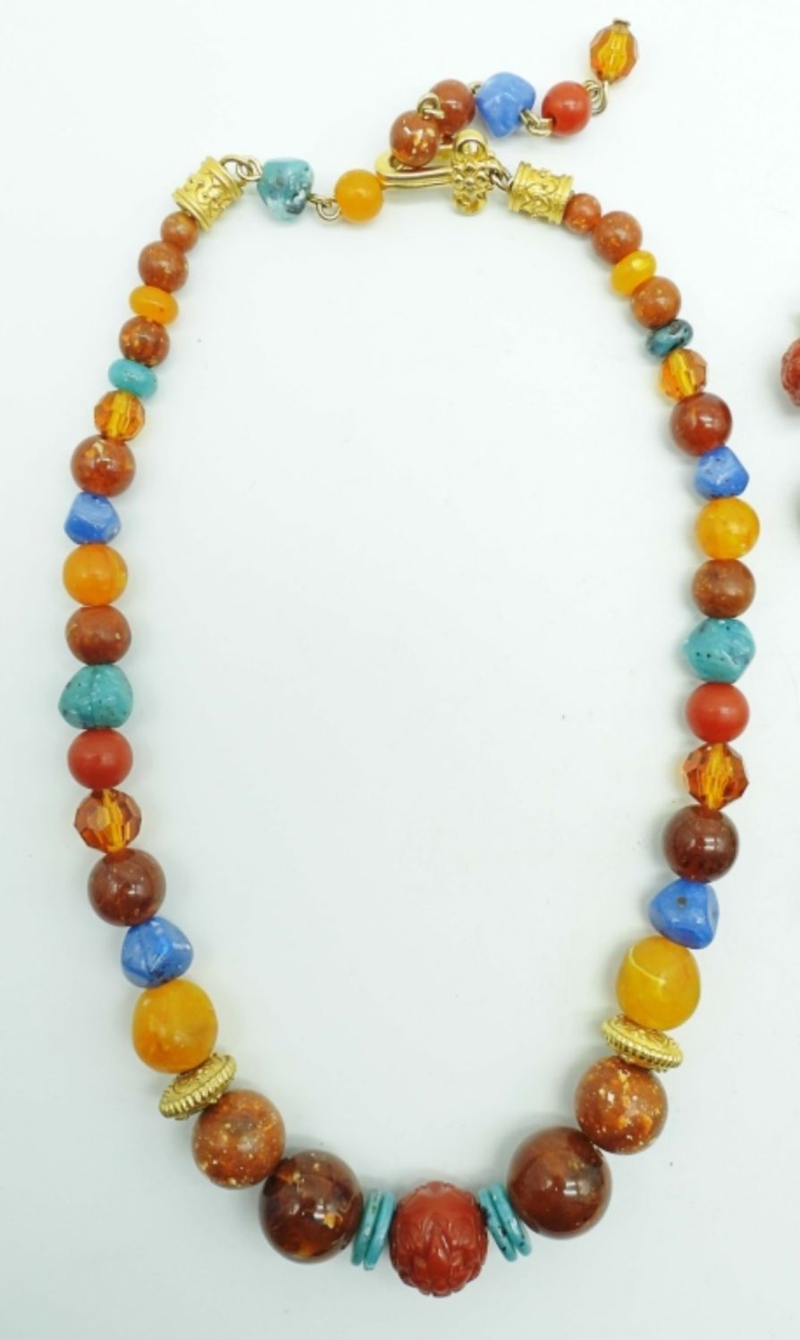 20IN LONG WITH A HOOK CLASP, THE NECKLACE HAS BROWN, BLUE, ORANGE, AND GOLD TONE BEADS AND CRAVED FLOWER BEADS, MATCHING PIERCED DANGLES, THE BRACELET HAS BEADS AND SILVER CIRCLES ALL AROUND 8IN LENGTH, AND ANOTHER