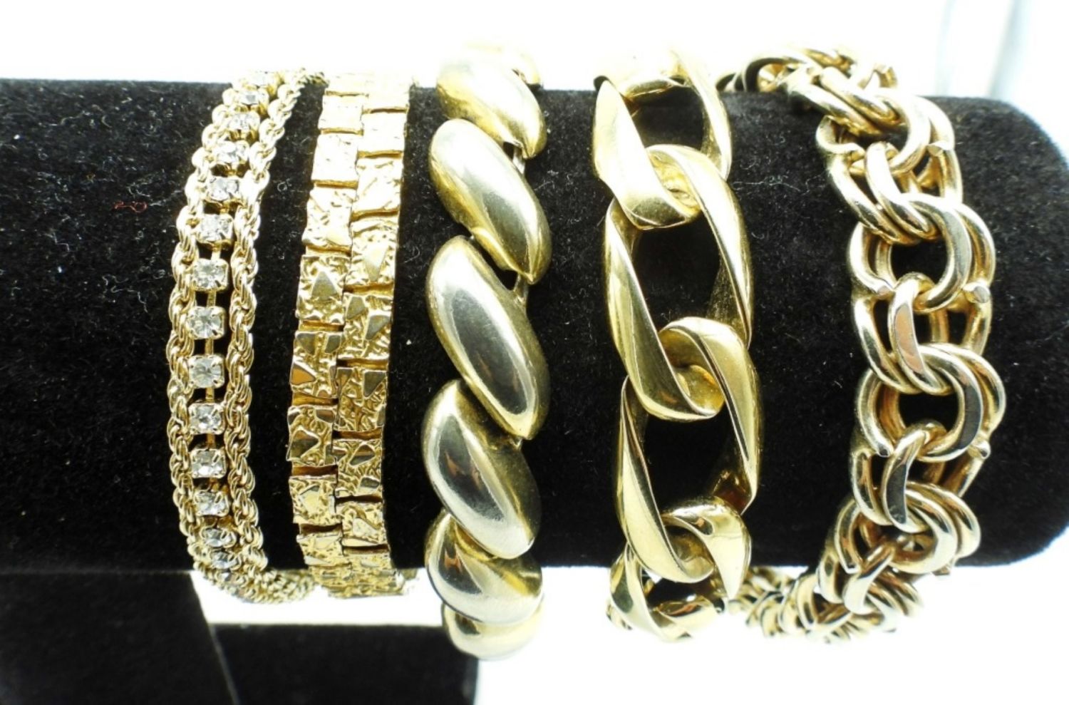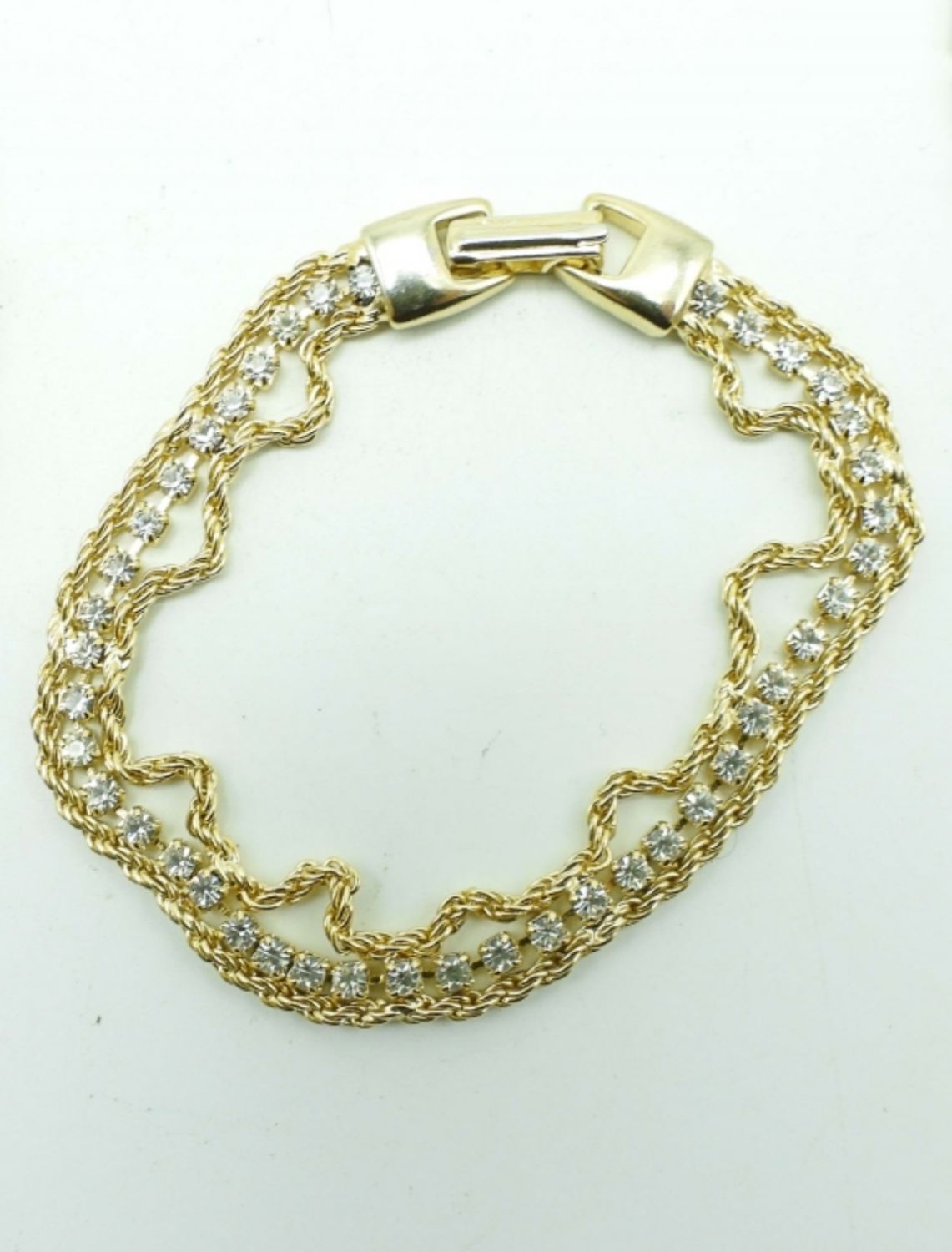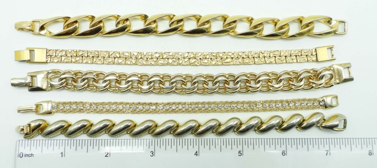 ALL 8IN LONG, HAVE OPEN BOX CLASP, 1-HAS CLEAR STONES WITH ROPE CHAIN ON EACH SIDE, 2 LINK CHAINS, 1 NUGGET STYLE, AND 1 SAN MARCO