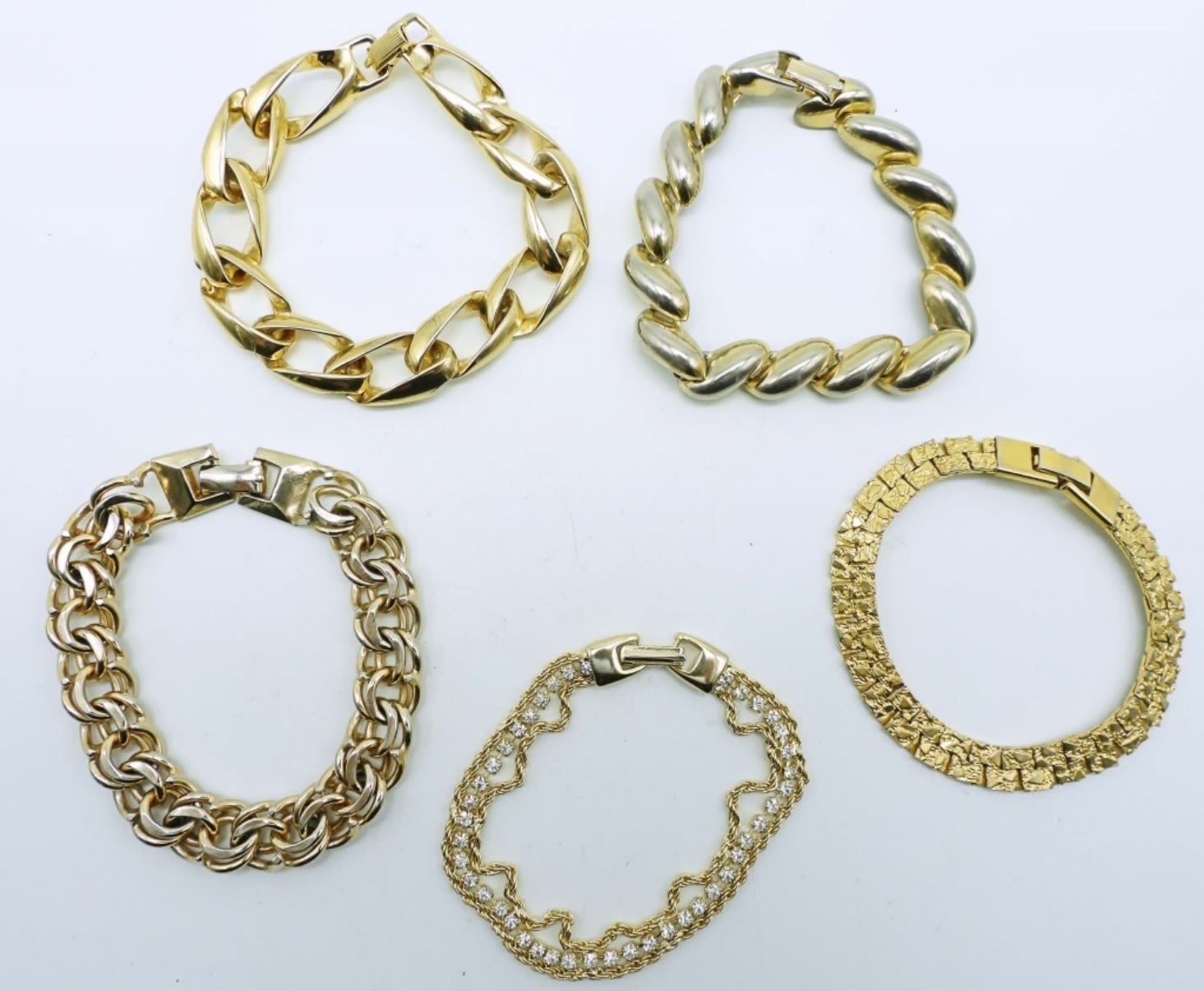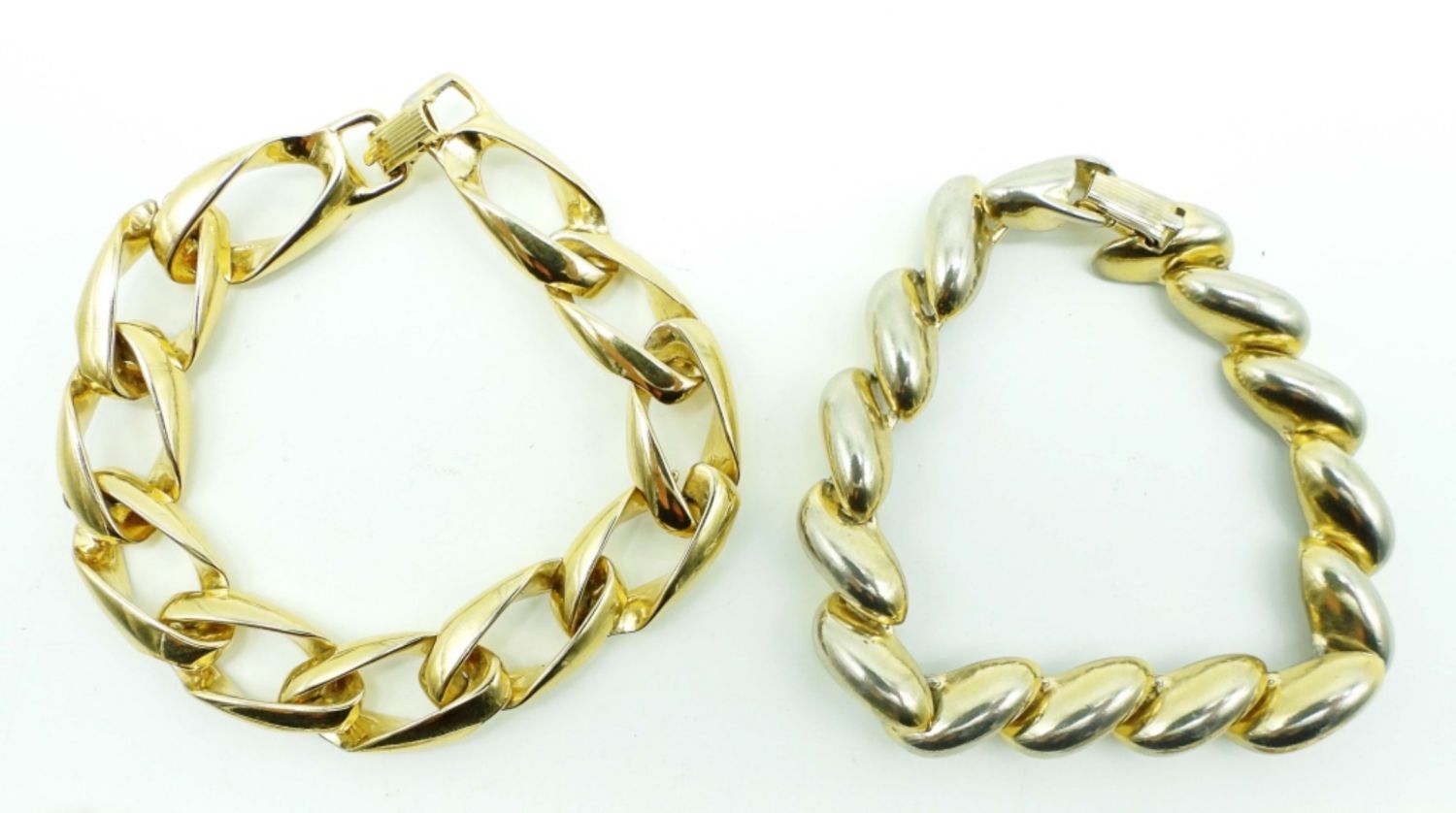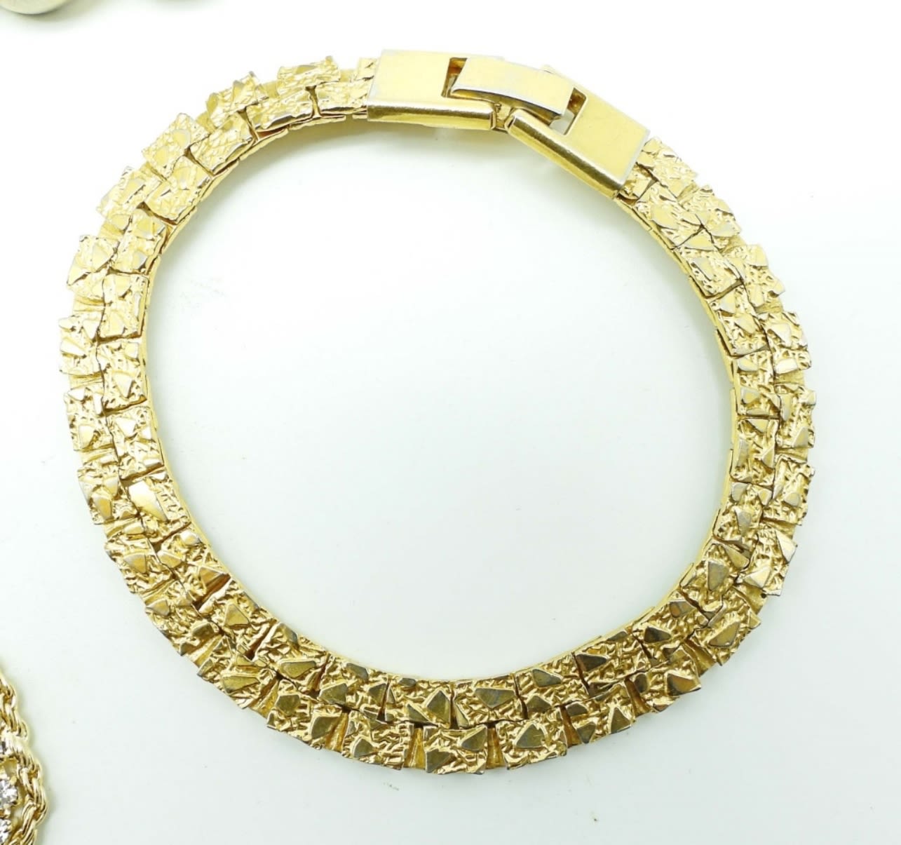 ALL 8IN LONG, HAVE OPEN BOX CLASP, 1-HAS CLEAR STONES WITH ROPE CHAIN ON EACH SIDE, 2 LINK CHAINS, 1 NUGGET STYLE, AND 1 SAN MARCO