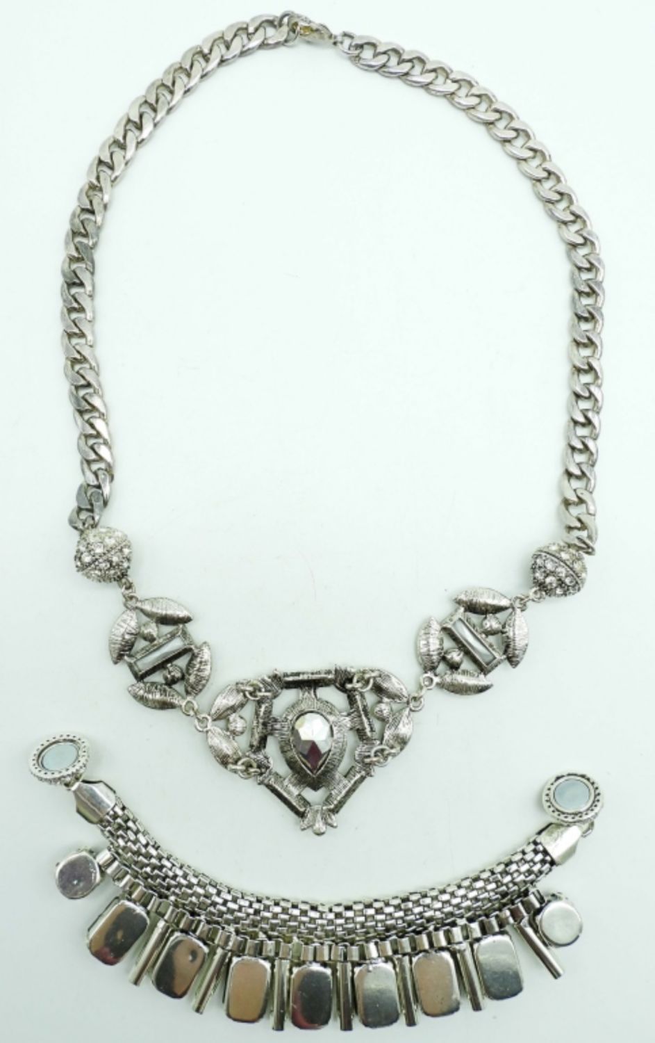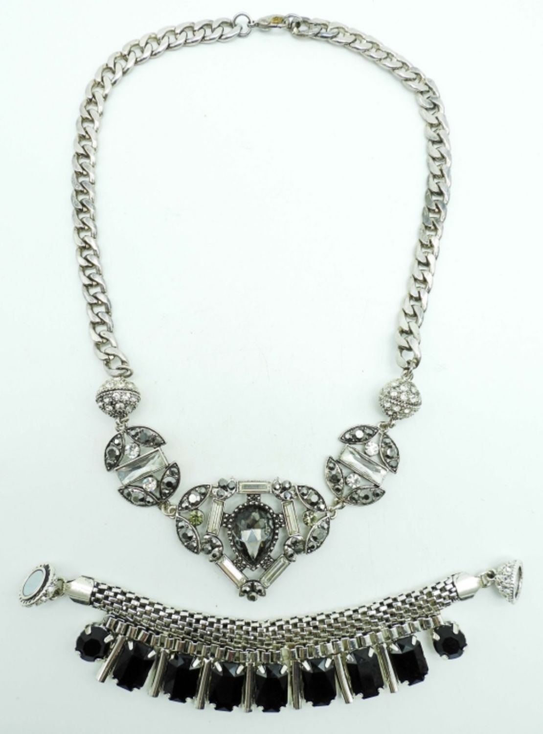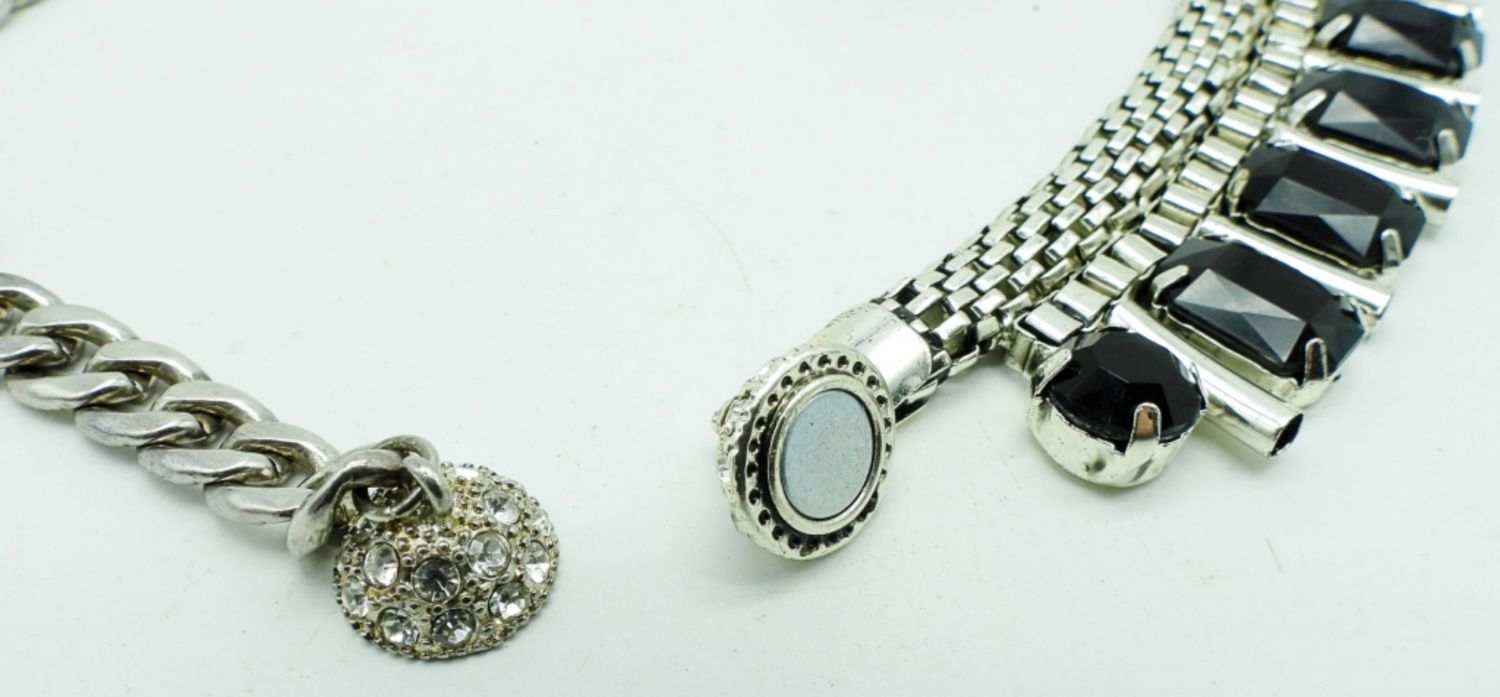 19IN LONG, THE CENTER ON THE NECKLACE IS HELD BY MAGNETS THAT CAN BE CHANGED, 1 CENTER HAD BLACK CLEAR STONES, THE OTHER IS BLACK ONXY STONES, STUNNING UNQIUE