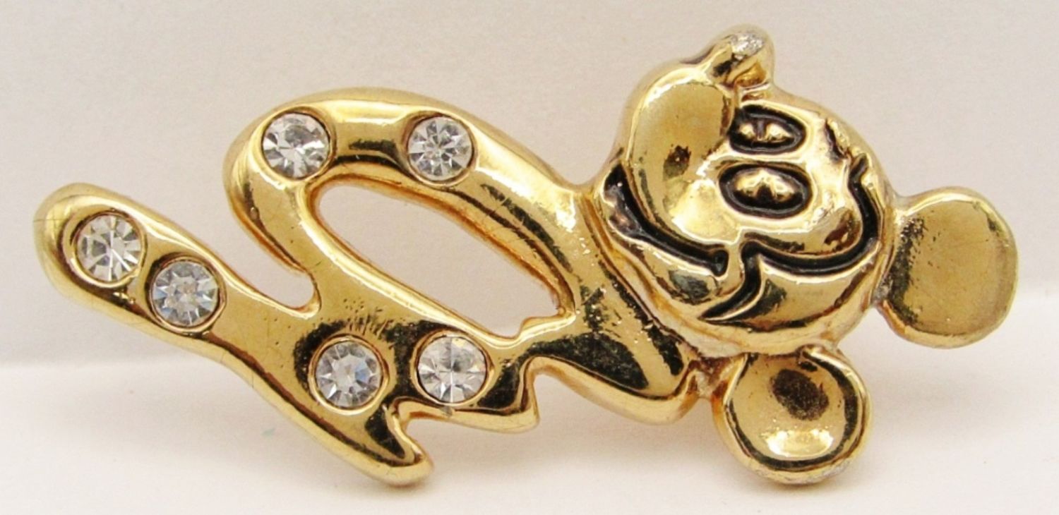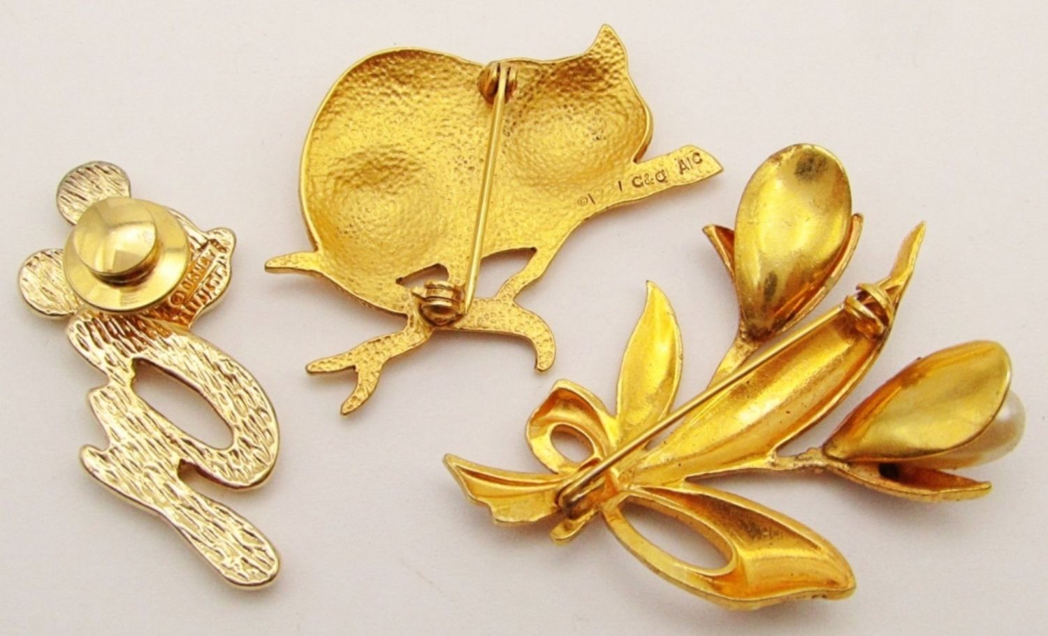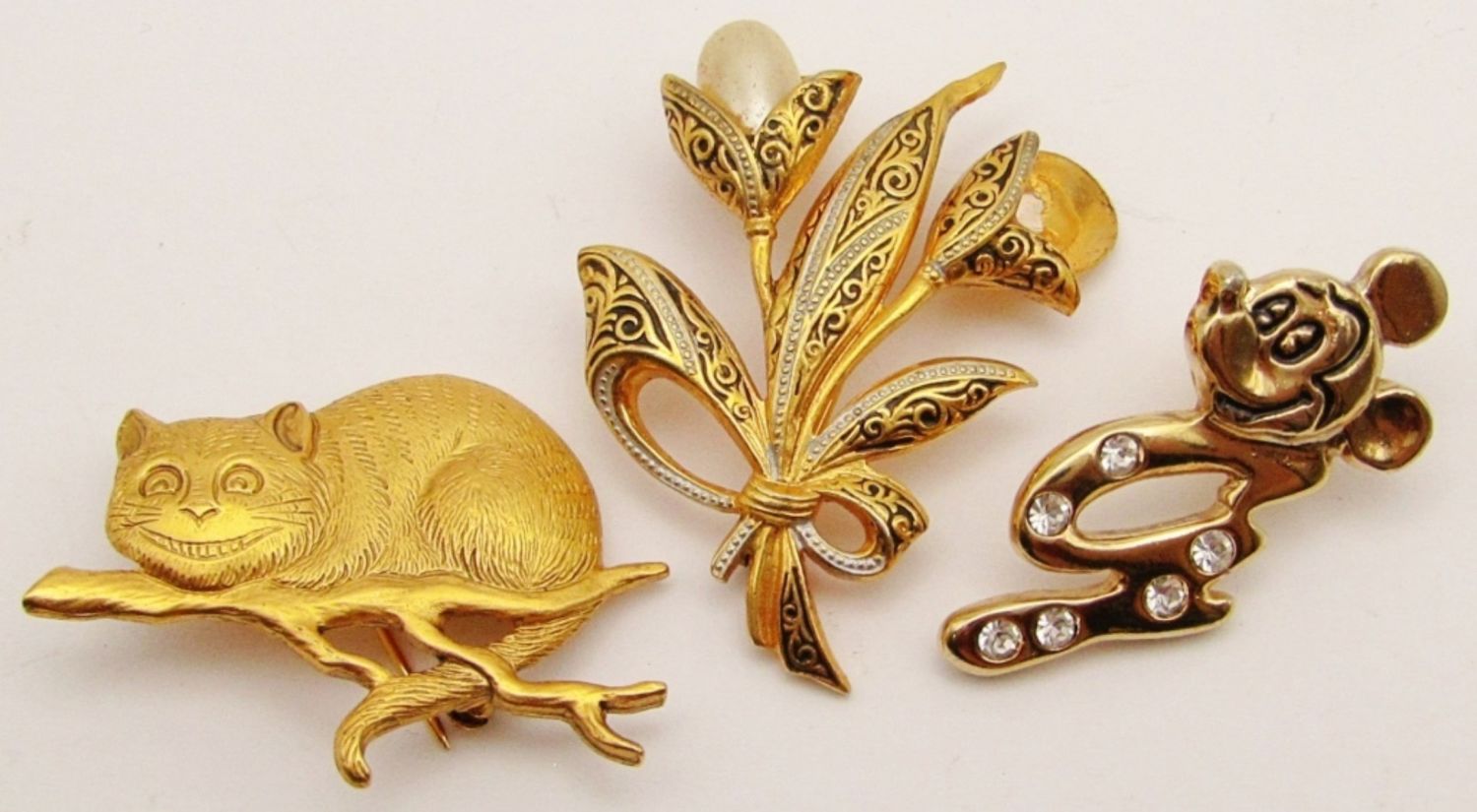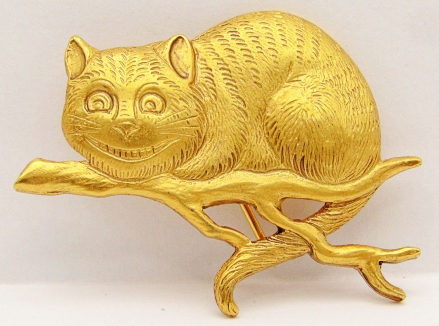 Initial Pin, 1991 C&G Alice in Wonderland Cheshire Cat, Damascene Flower With Faux Pearls (1 Missing).