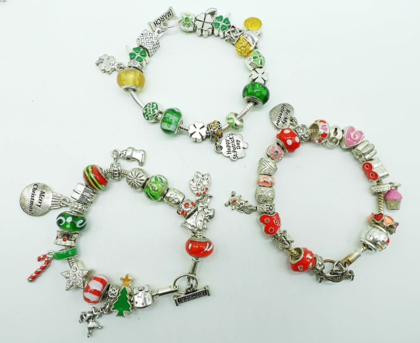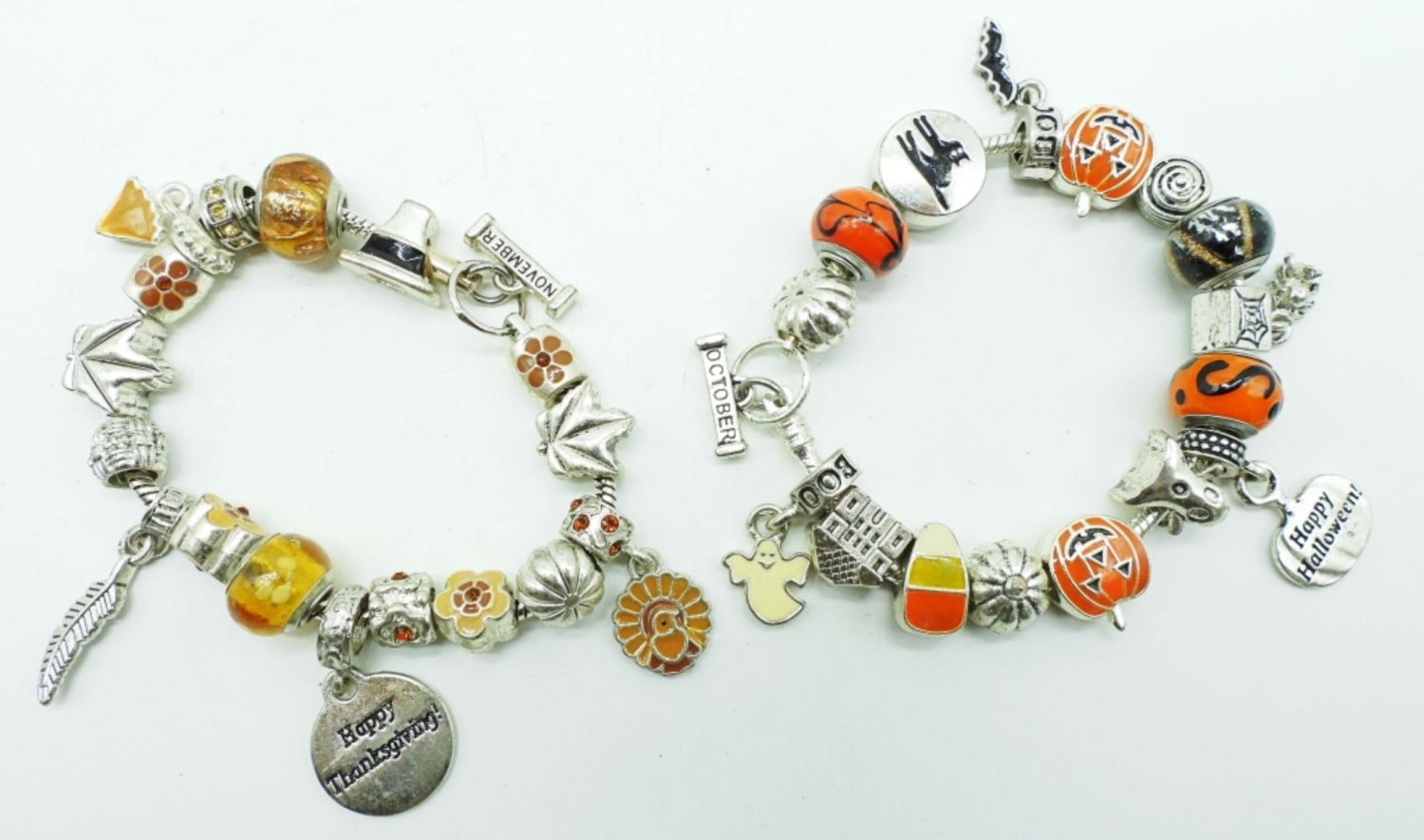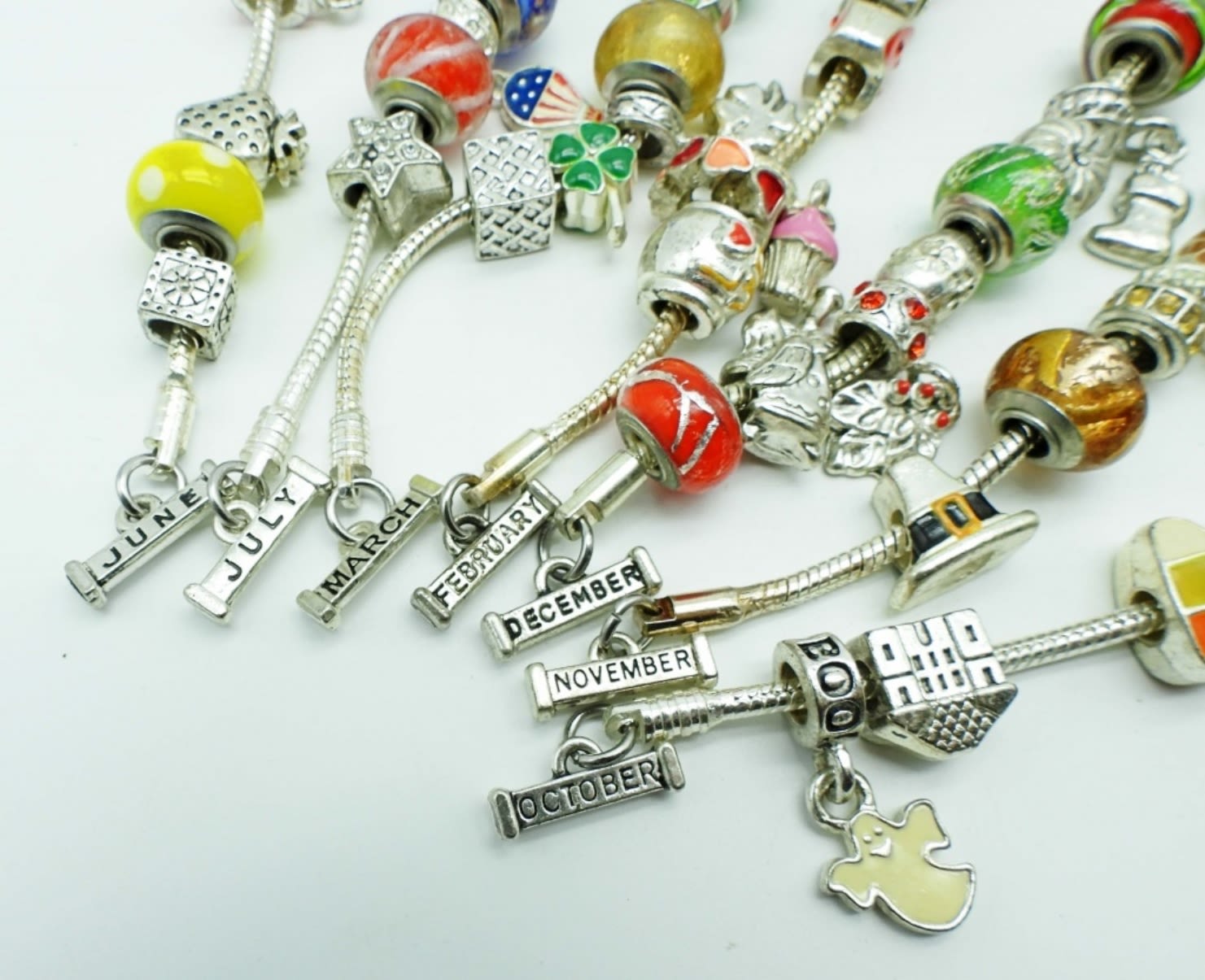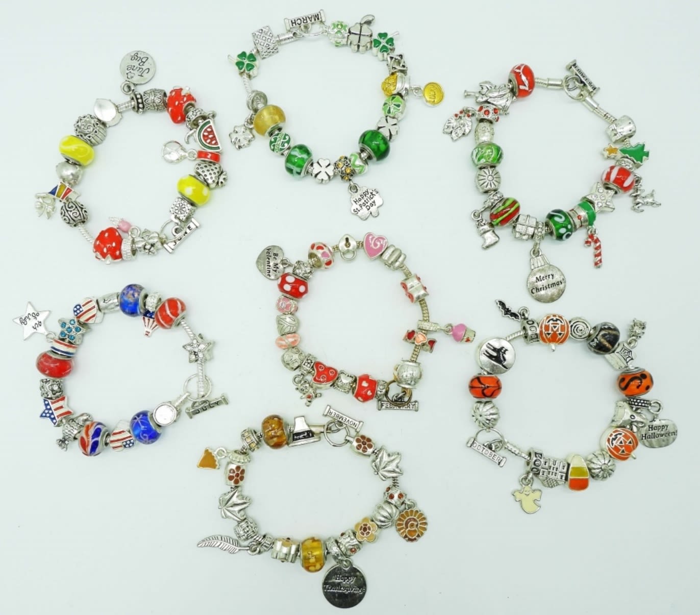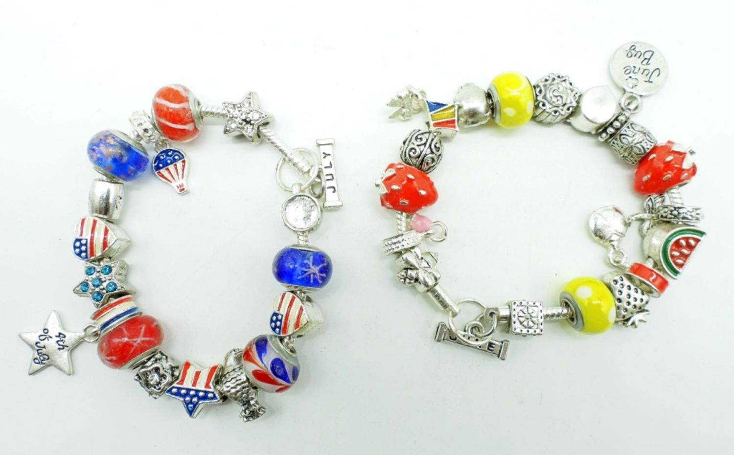 ALL ARE 8IN LONG, EACH CHARM BRACELET IS A DIFFERENT MONTH, HAVE TOGGLE CLASP WITH THE MONTH ON THEM, YOU WILL BE GETTING DEC- CHRISTMAS CHARMS, FEB- VANENTINES CHARMS,MARCH, ST PATRICKS DAY,JUNE- SUMMER