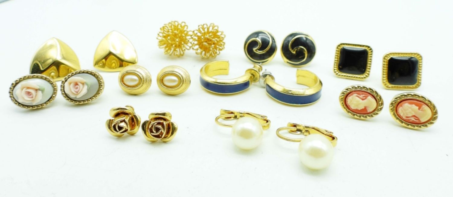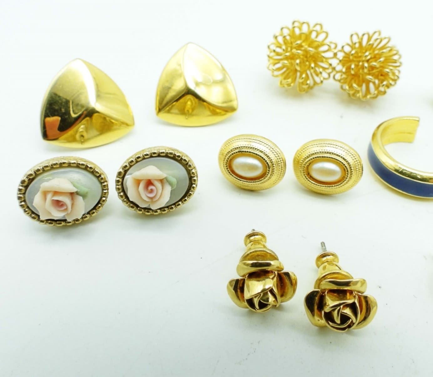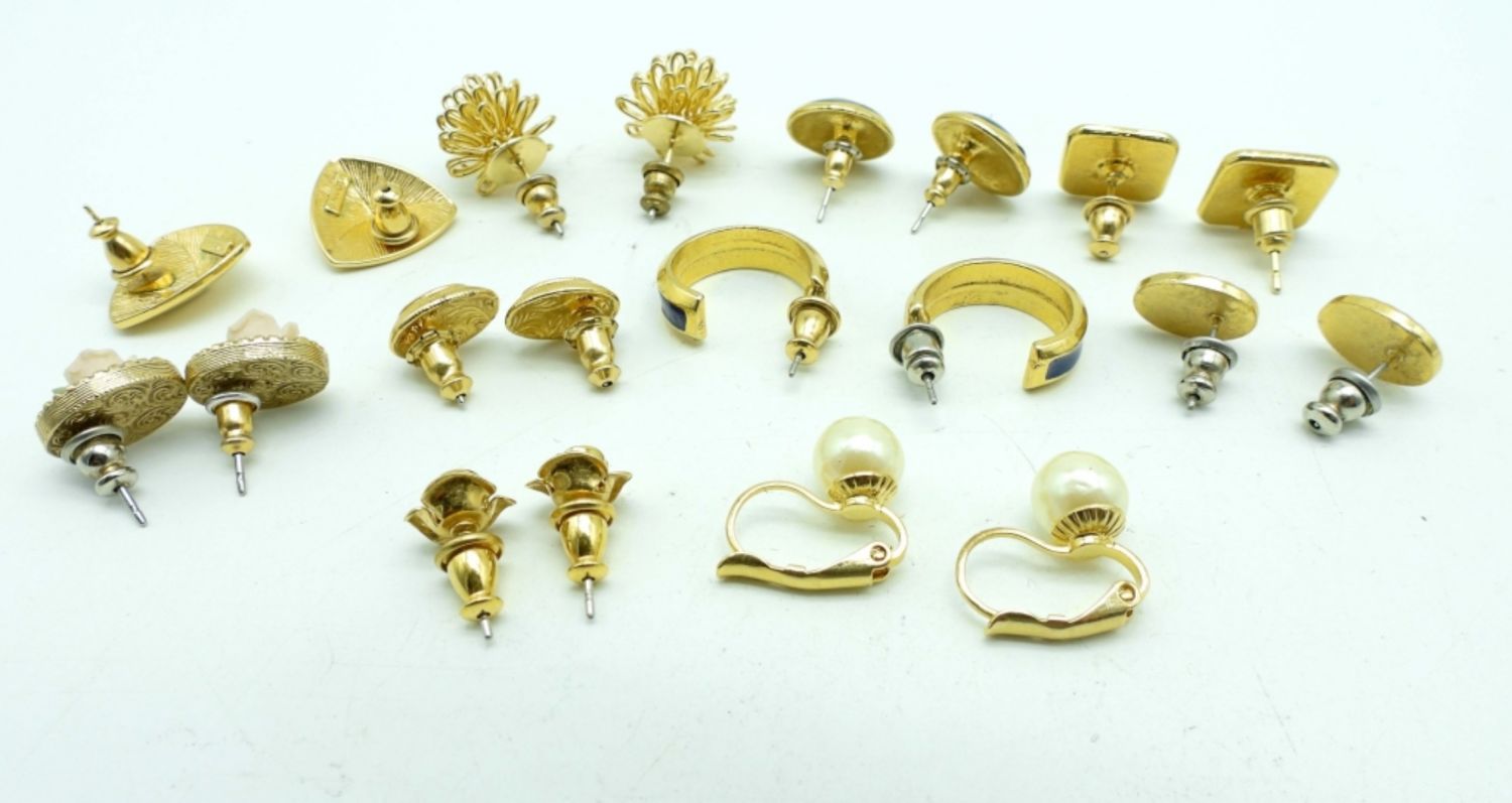 GOLD TONE, ALL DIFFERENT STYLES, ALL HAVE BACKINGS, ONE ALL GOLD TONE TRIANGLE MONET BRAND
