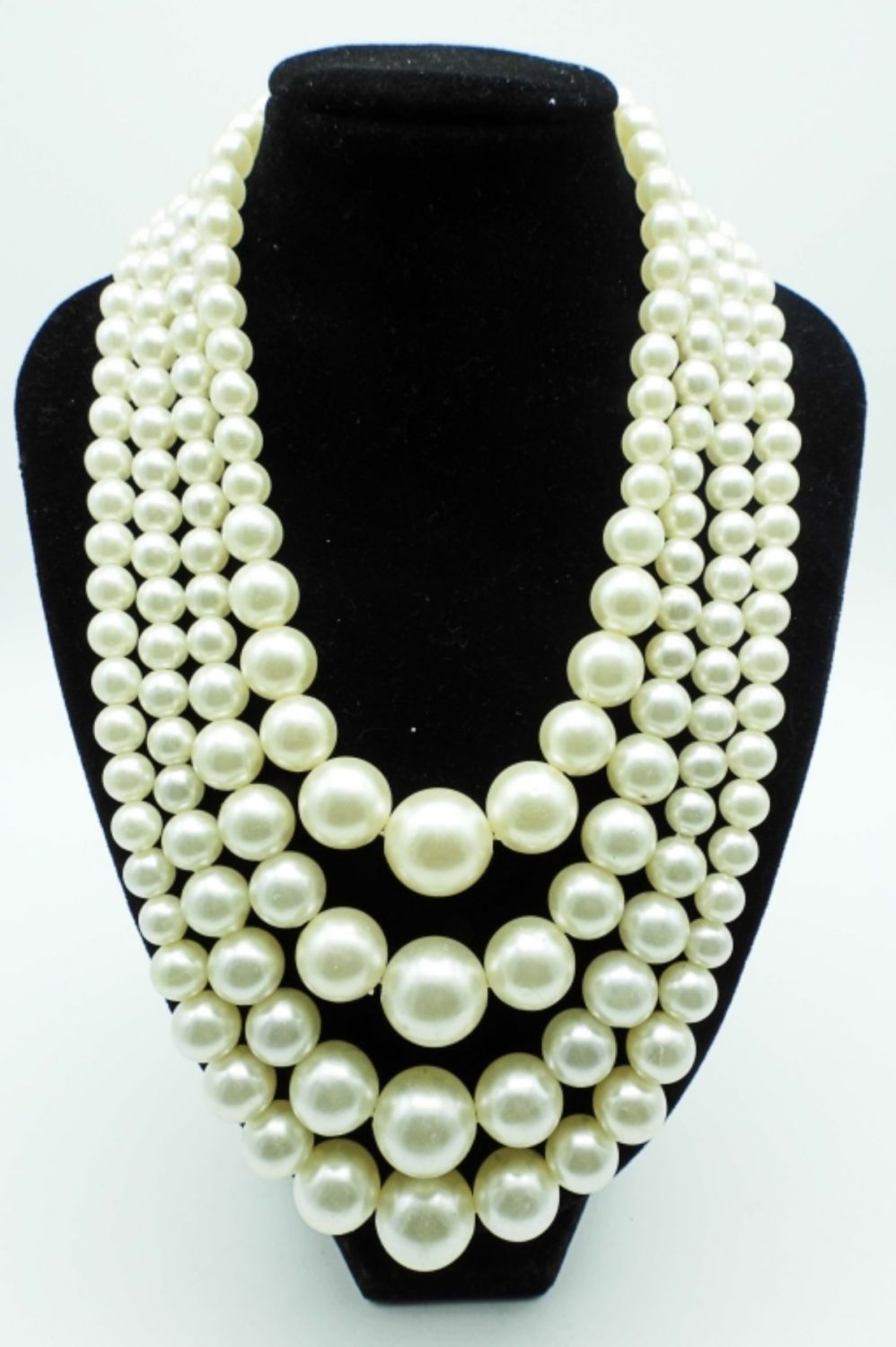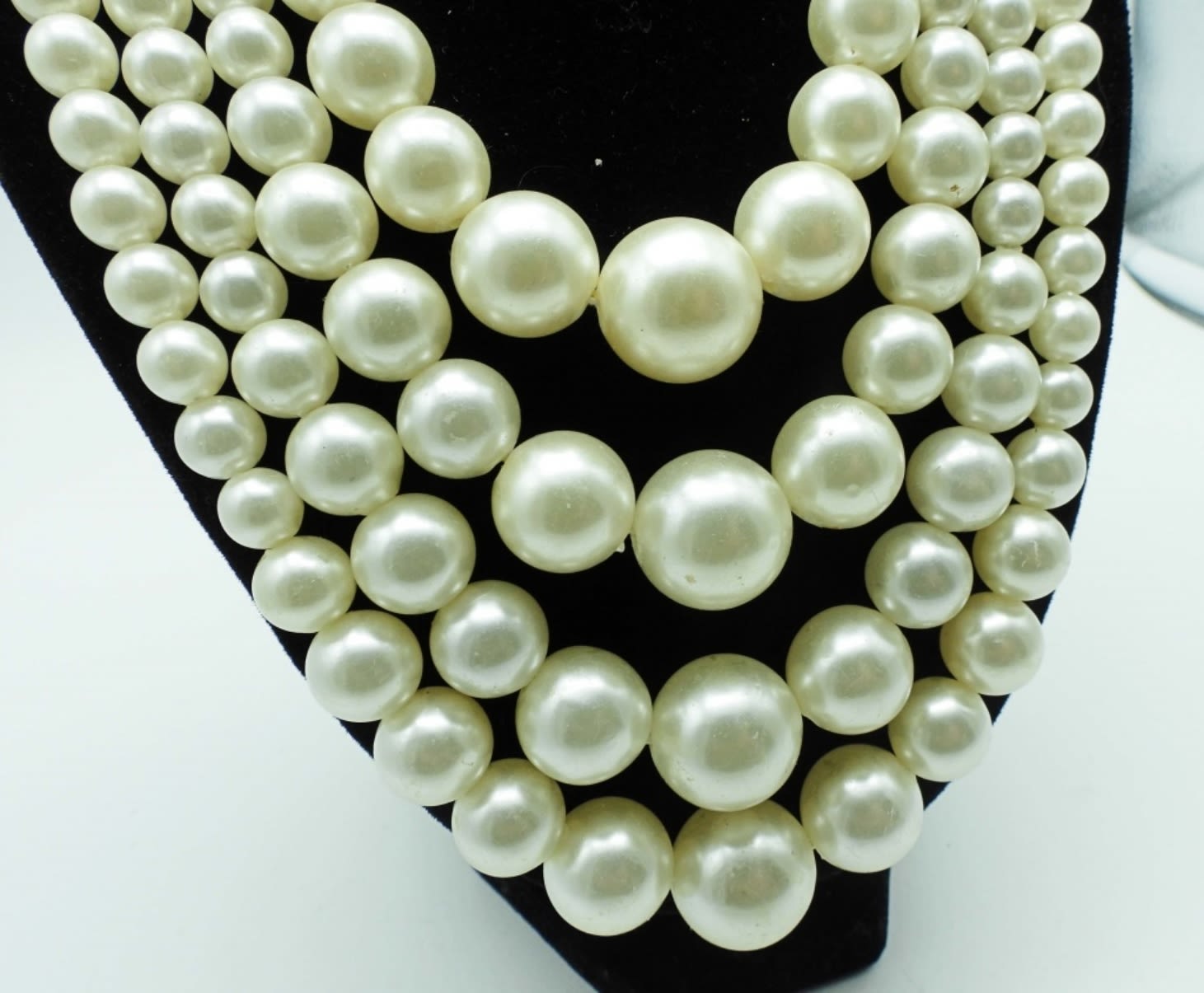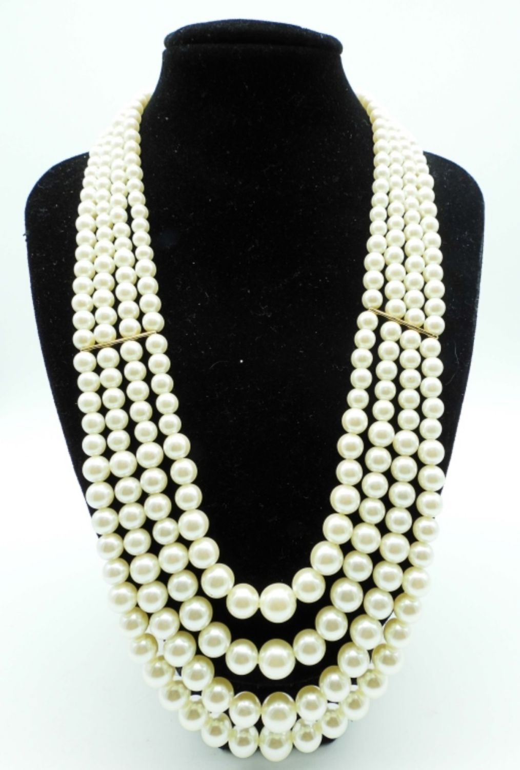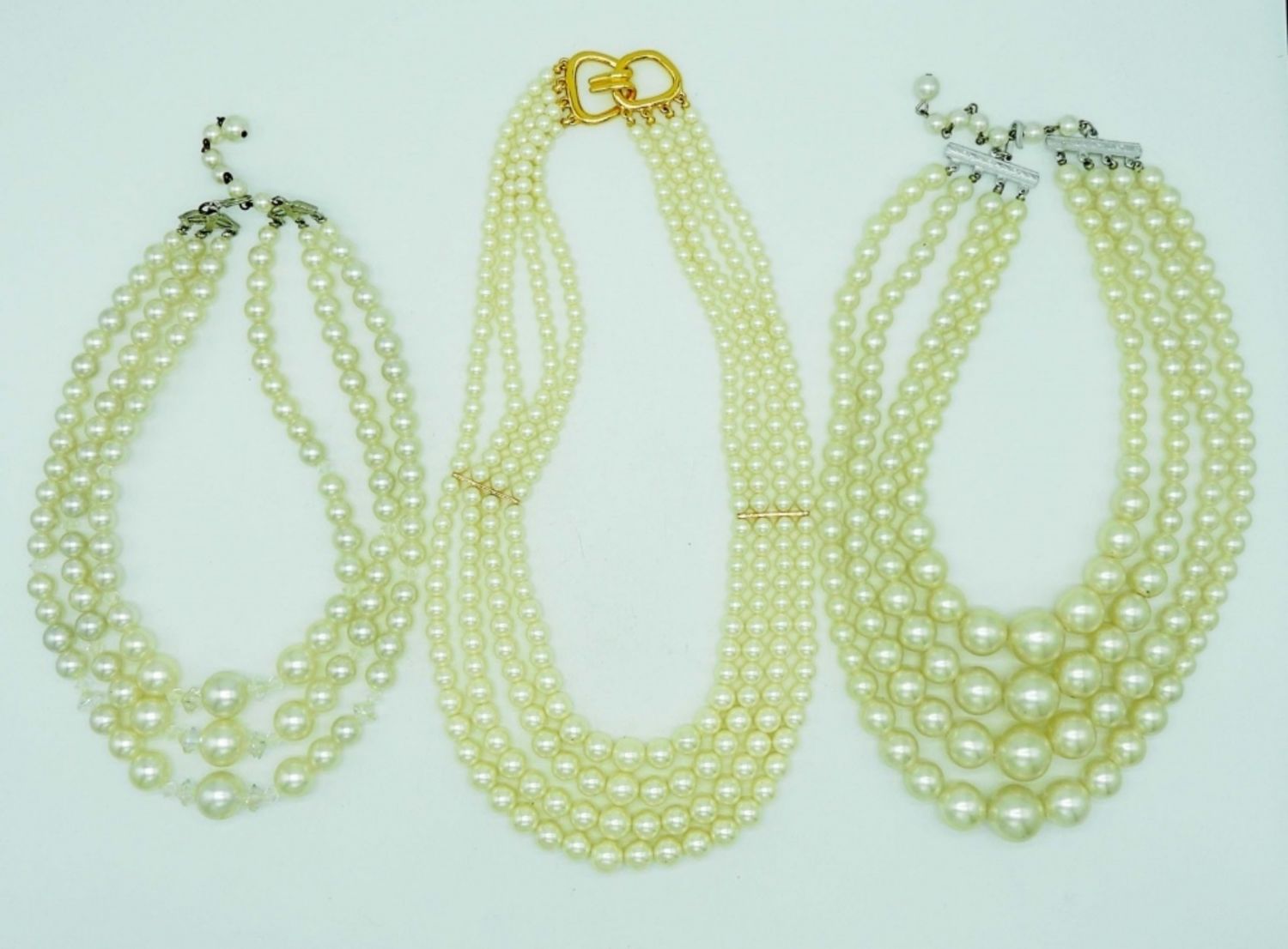ALL 18IN LONG AND BIB STYLE, 1-GOLDTONE FAUX PEARLS, PEARLS ARE LAYERED, 2- SILVERTONE FAUX PEARLS, LAYERED STYLE
