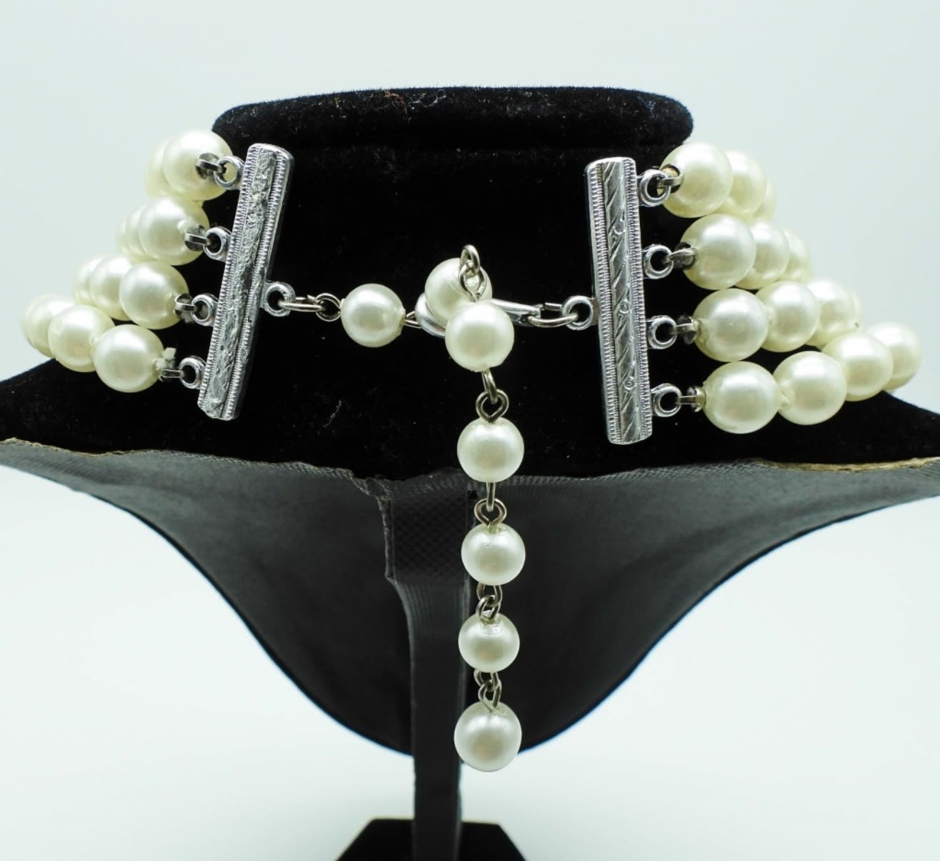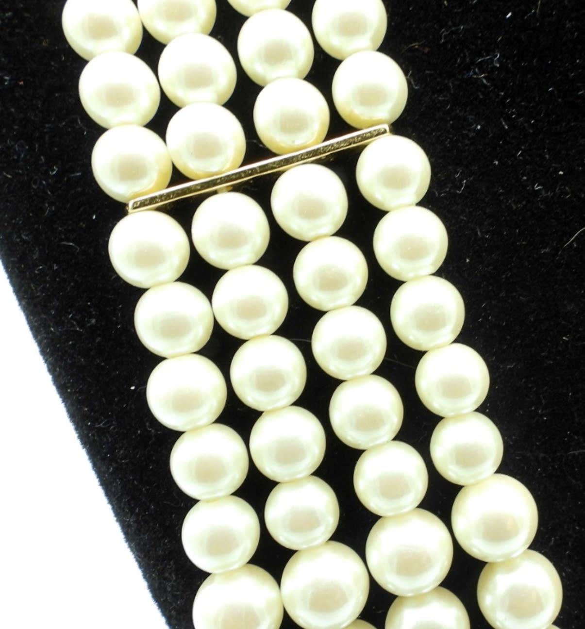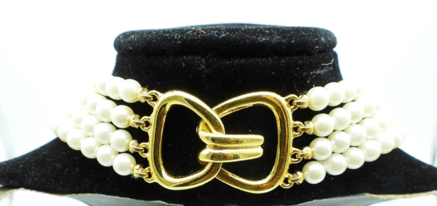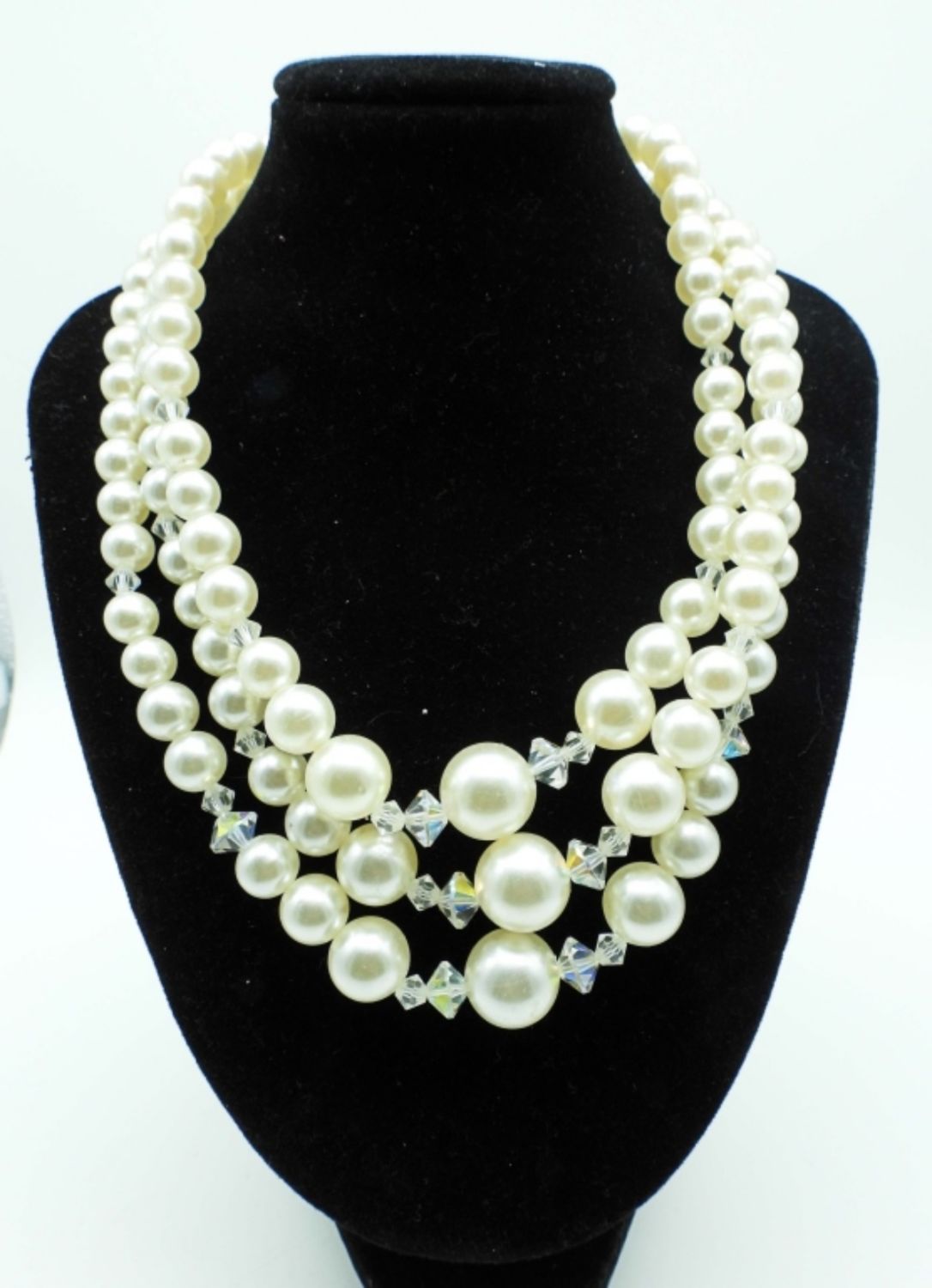 ALL 18IN LONG AND BIB STYLE, 1-GOLDTONE FAUX PEARLS, PEARLS ARE LAYERED, 2- SILVERTONE FAUX PEARLS, LAYERED STYLE