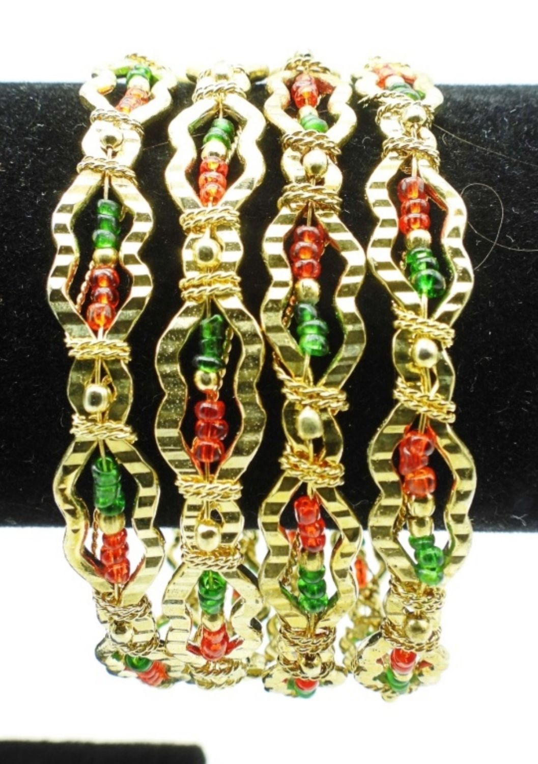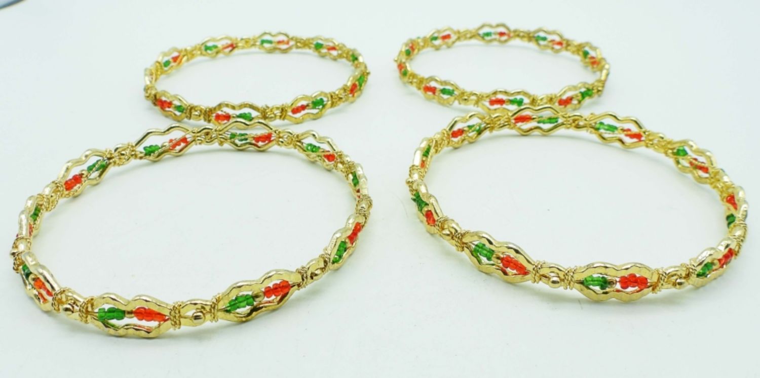 HAVE RED AND GREEN TINY BEADS ALONG THE BANGLE WITH GOLDTONE WIRE GOING AROUND,