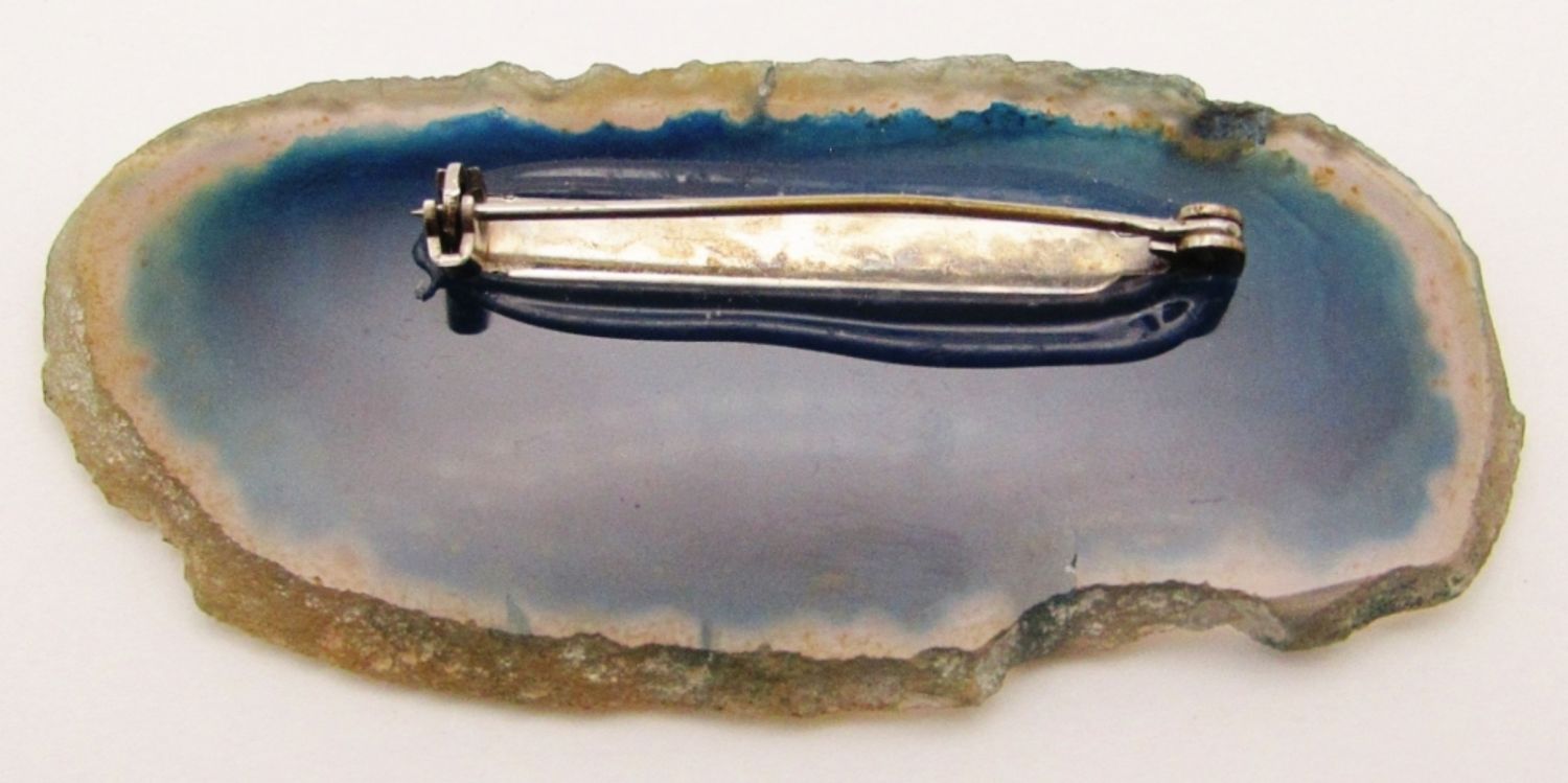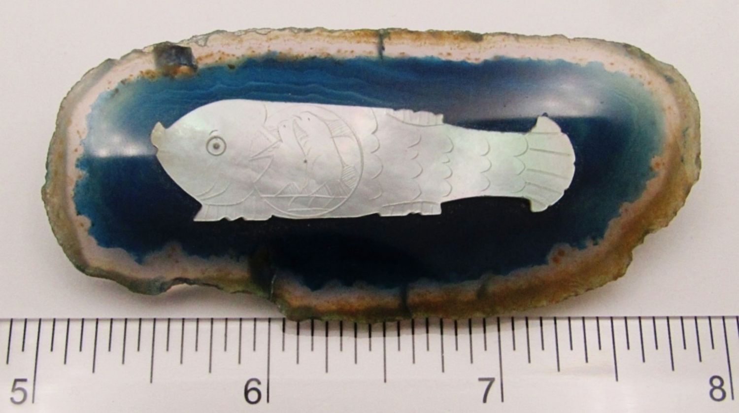 Blue Agate Slice with Antique Chinese Mother of Pearl Fish Gaming Counter; 3″.