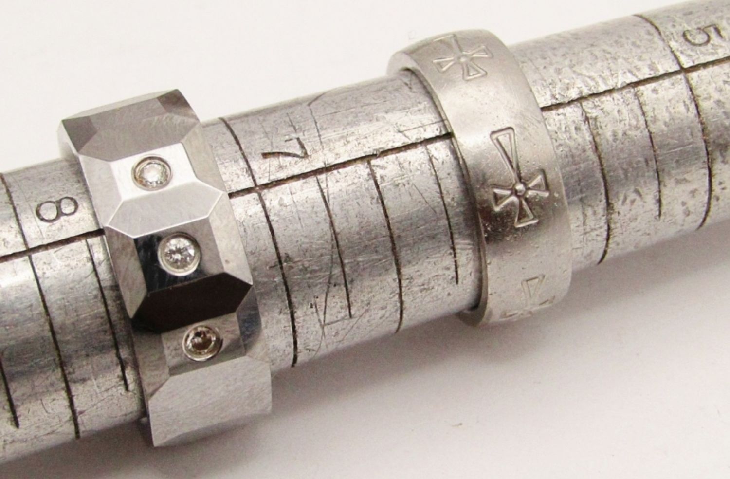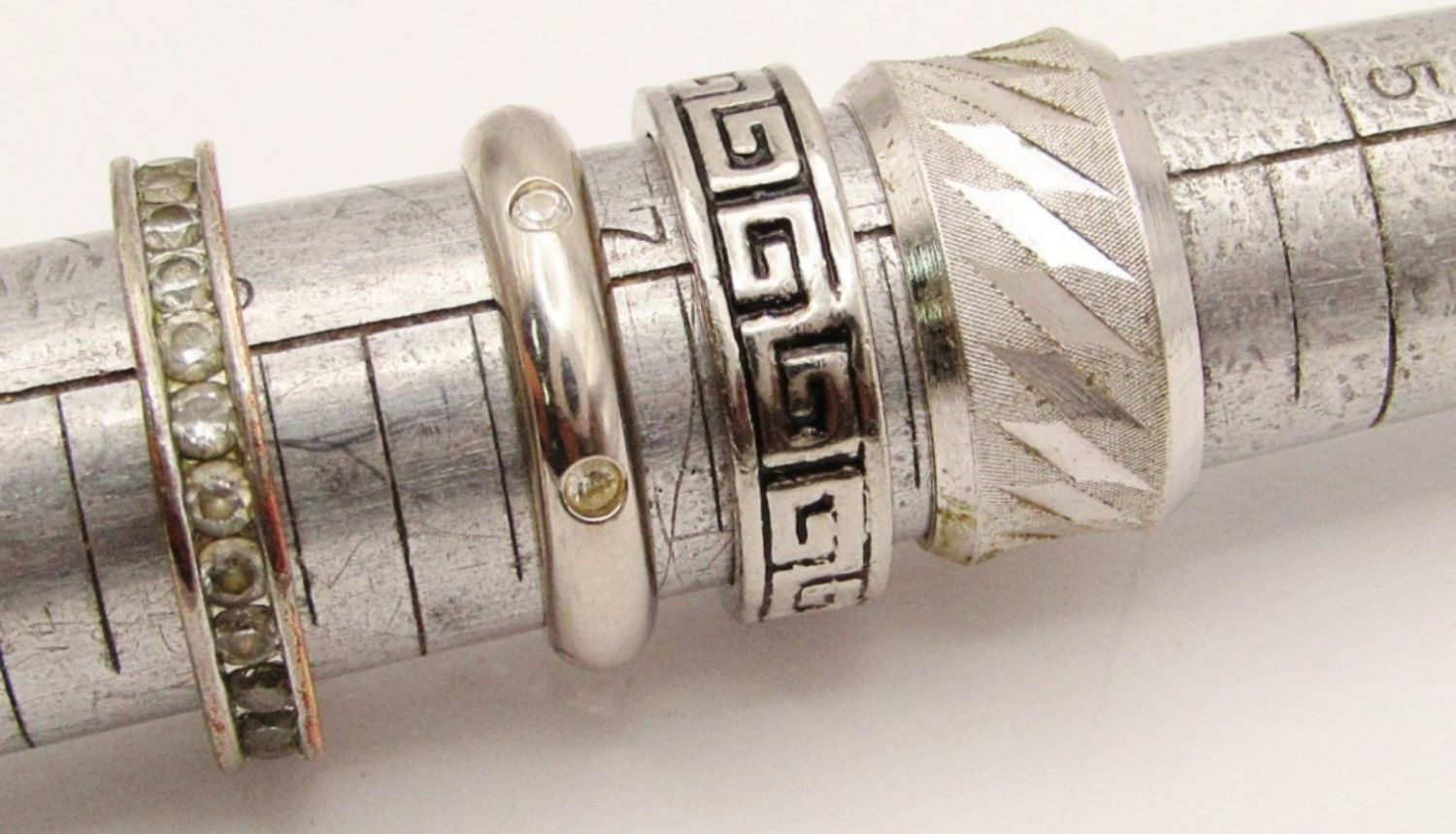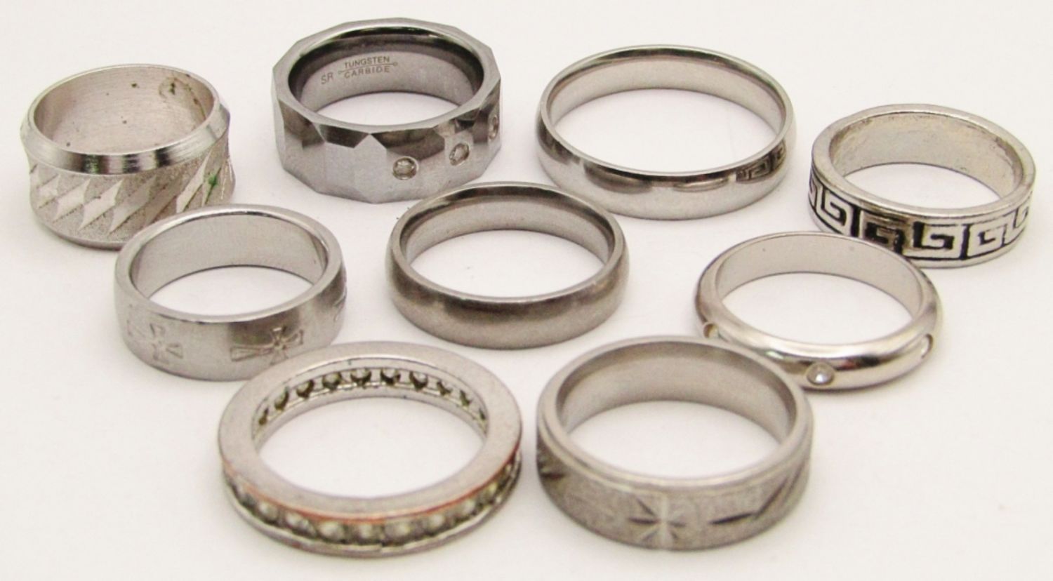 SIZES: 6, 6, 6.75, 7, 7, 7.5, 7.5, 8, 13. (3) WITH STONES- NONE MISSING, (4) WITH ETCHINGS, & (2) PLAIN.