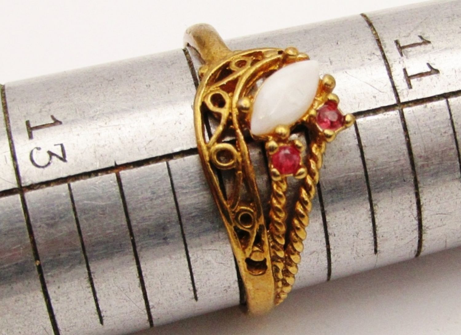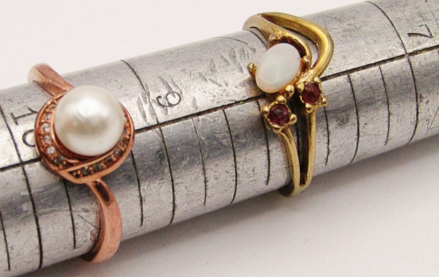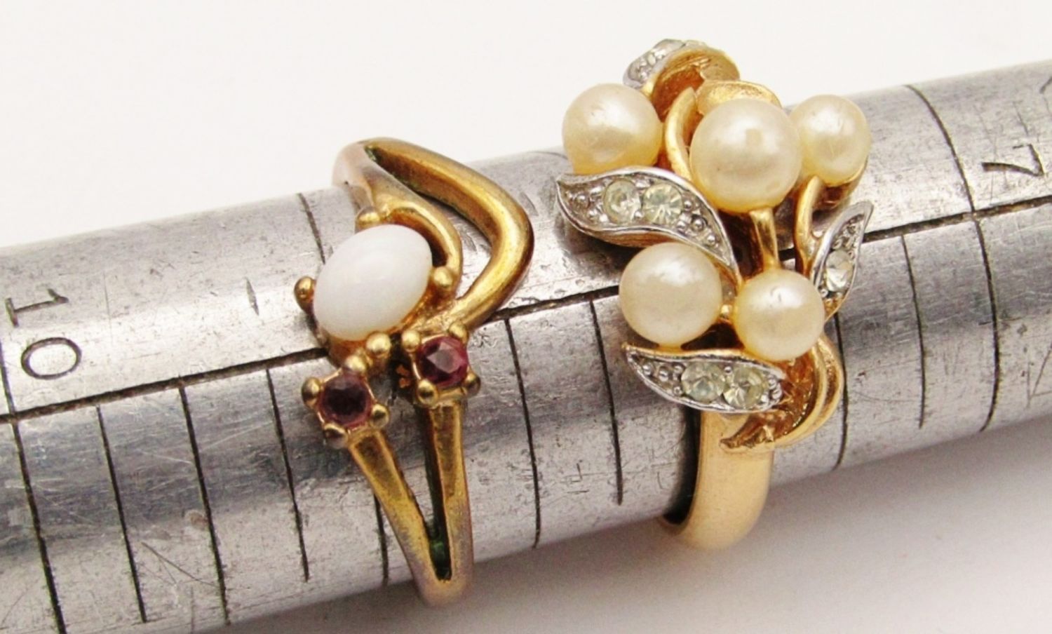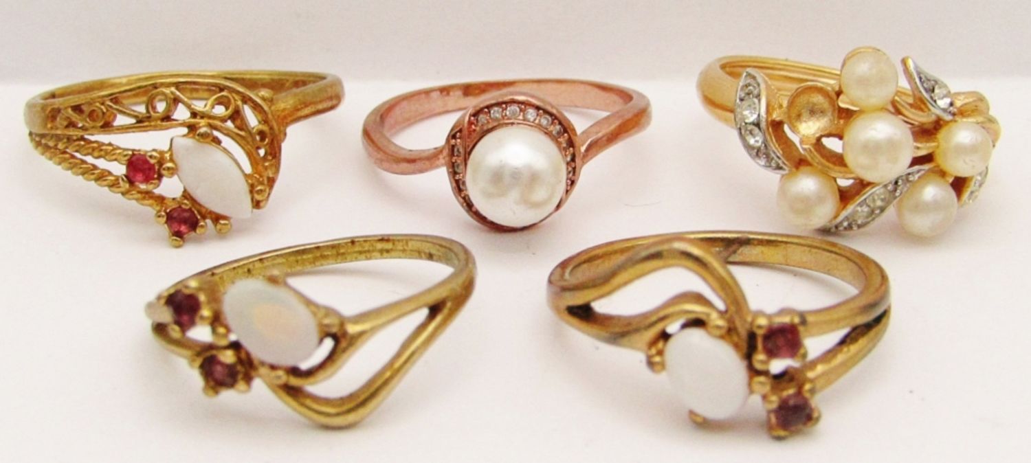 SIZES: 7.5, 8, 9, 9.5, 12. ALL W/ GEMS: (1) AVON W/ ADJUSTABLE INNER BAND- MISSING A PEARL, (2) MATCHING