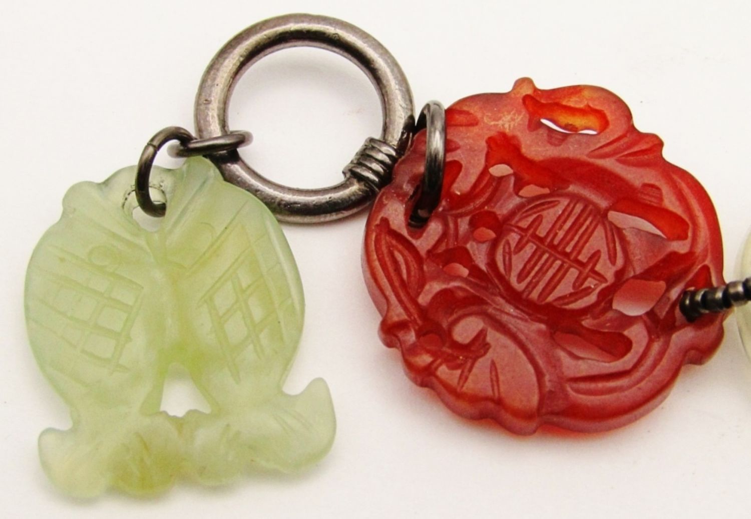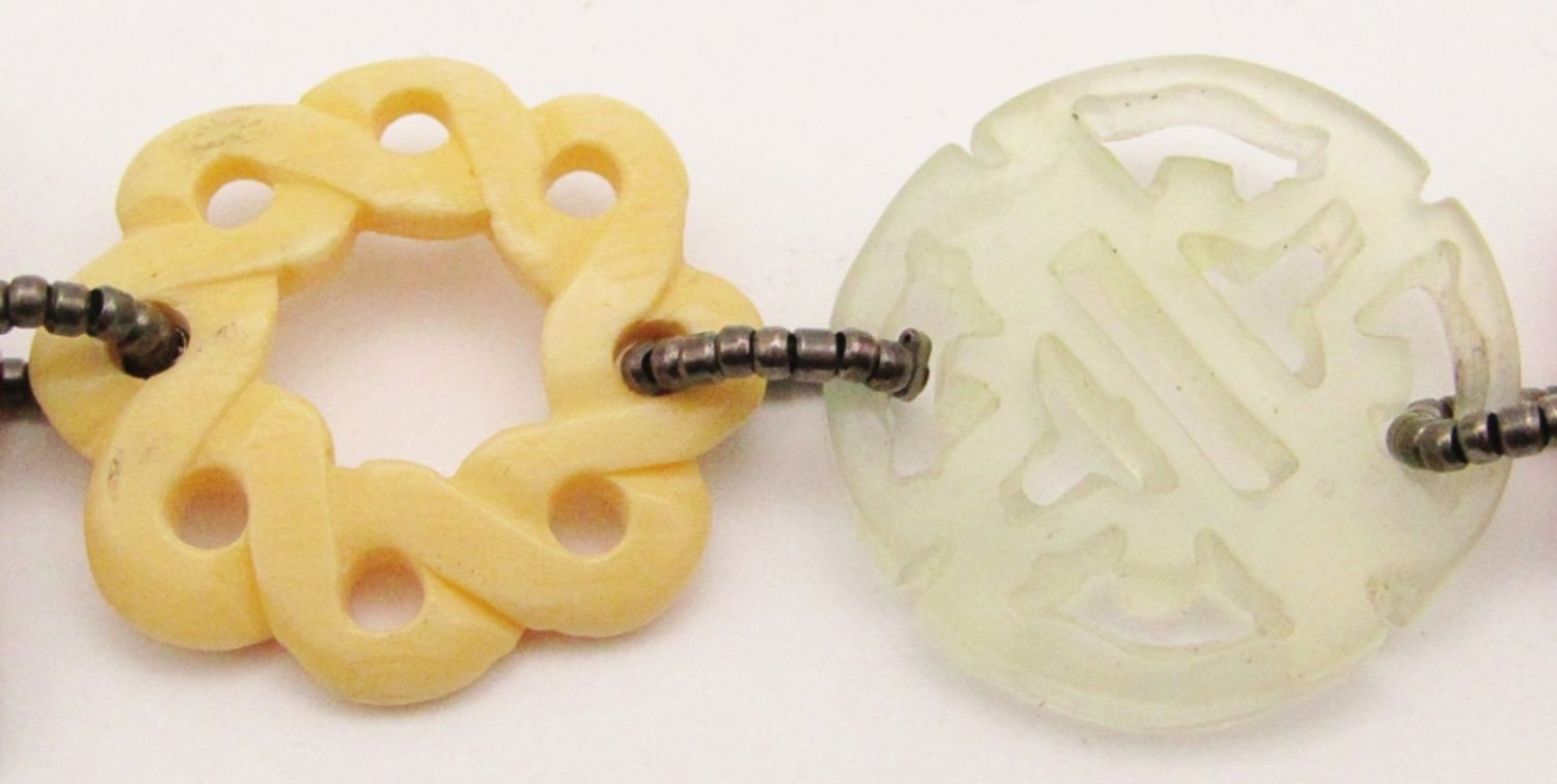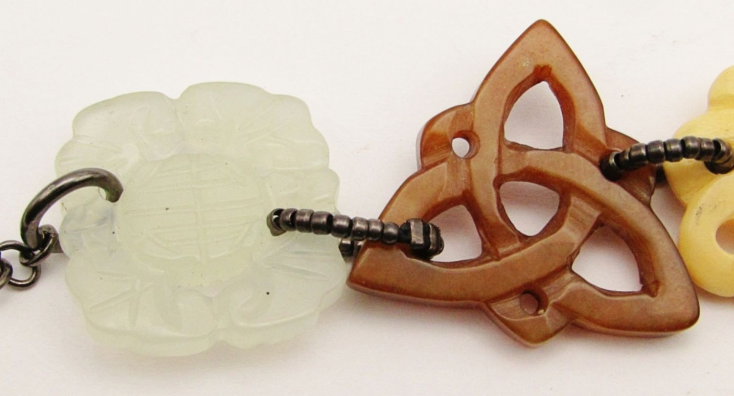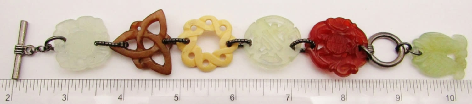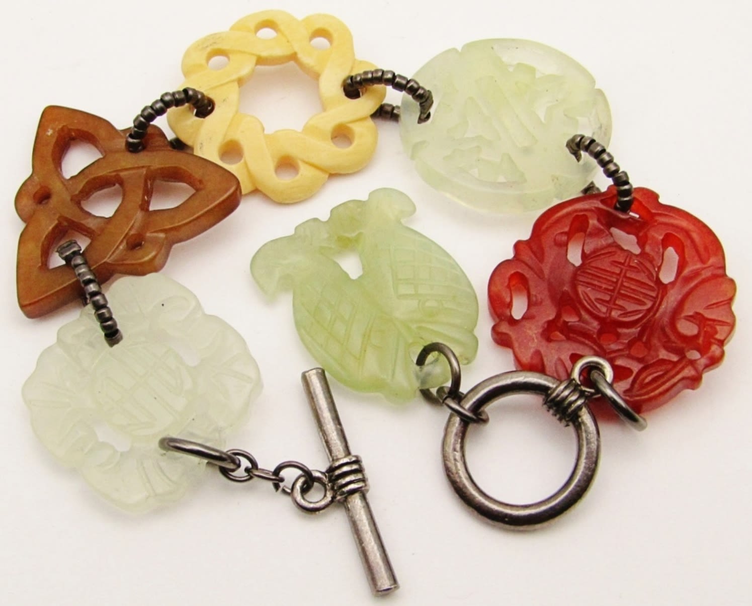 Pale Green Flower, Light Brown Jadeite, Faux Ivory Celtic Braid, White Jade, Carnelian/Red Jade, Icy Light Green Fishes; 8 1/2IN LENGTH W A TOGGLE CLASP
