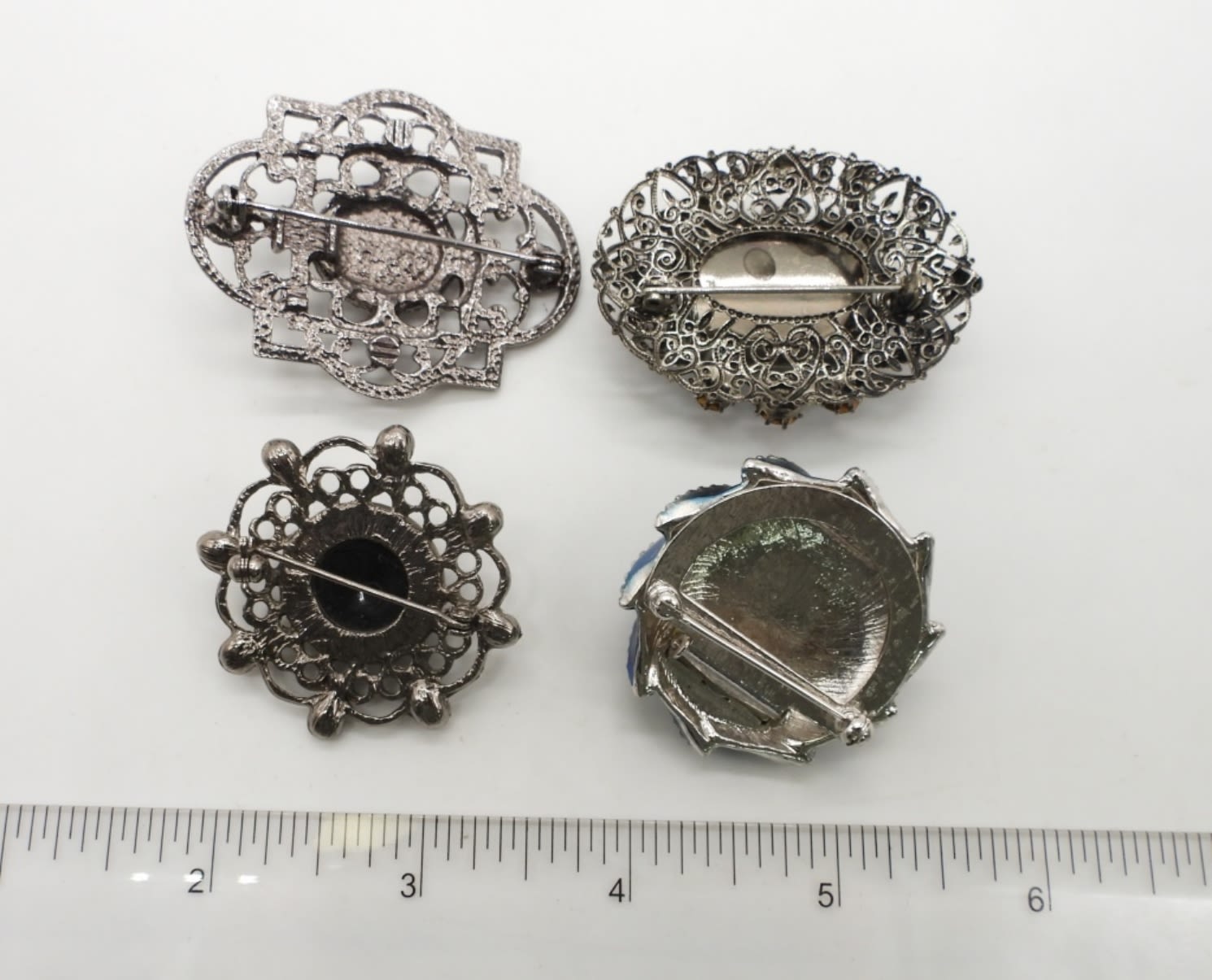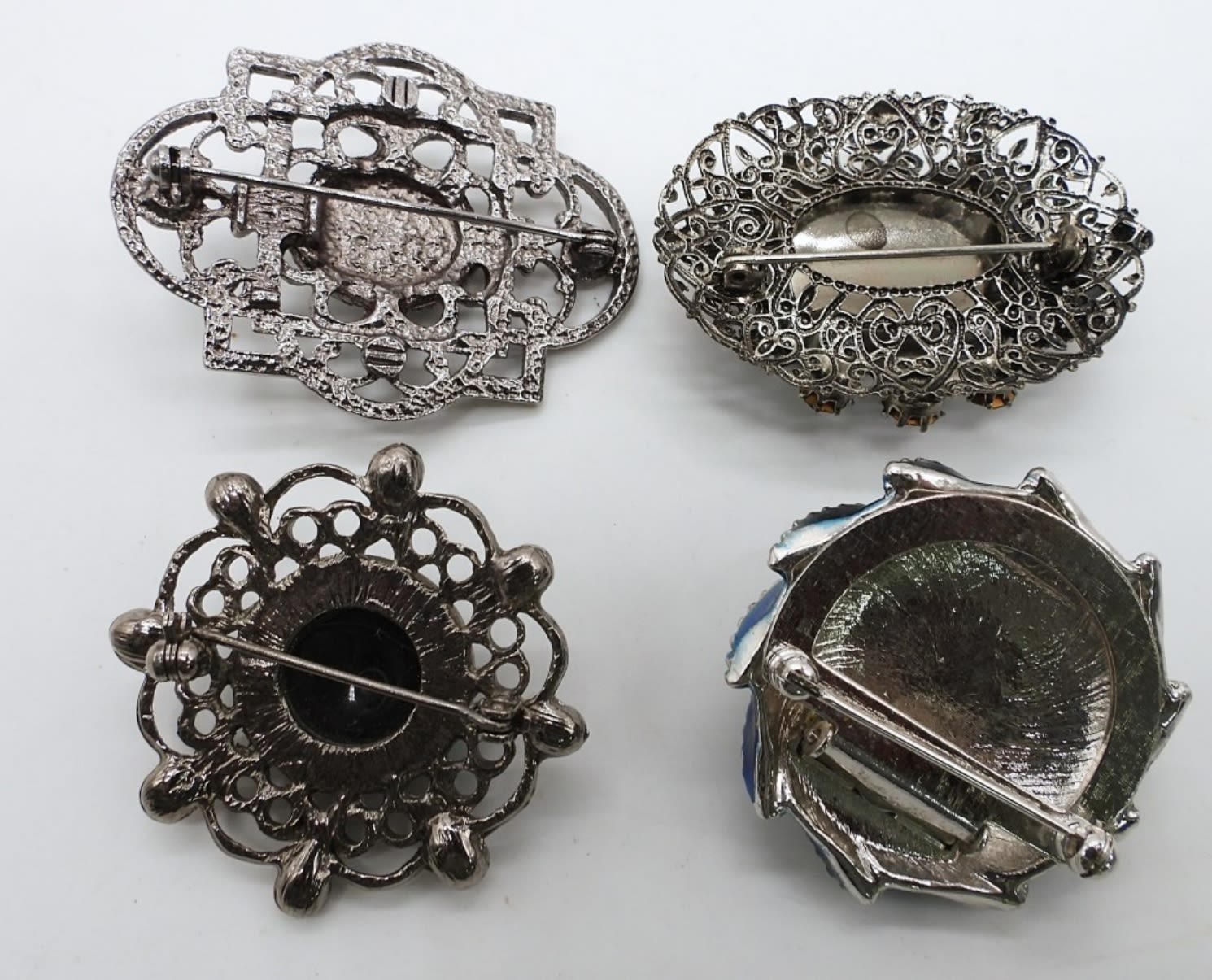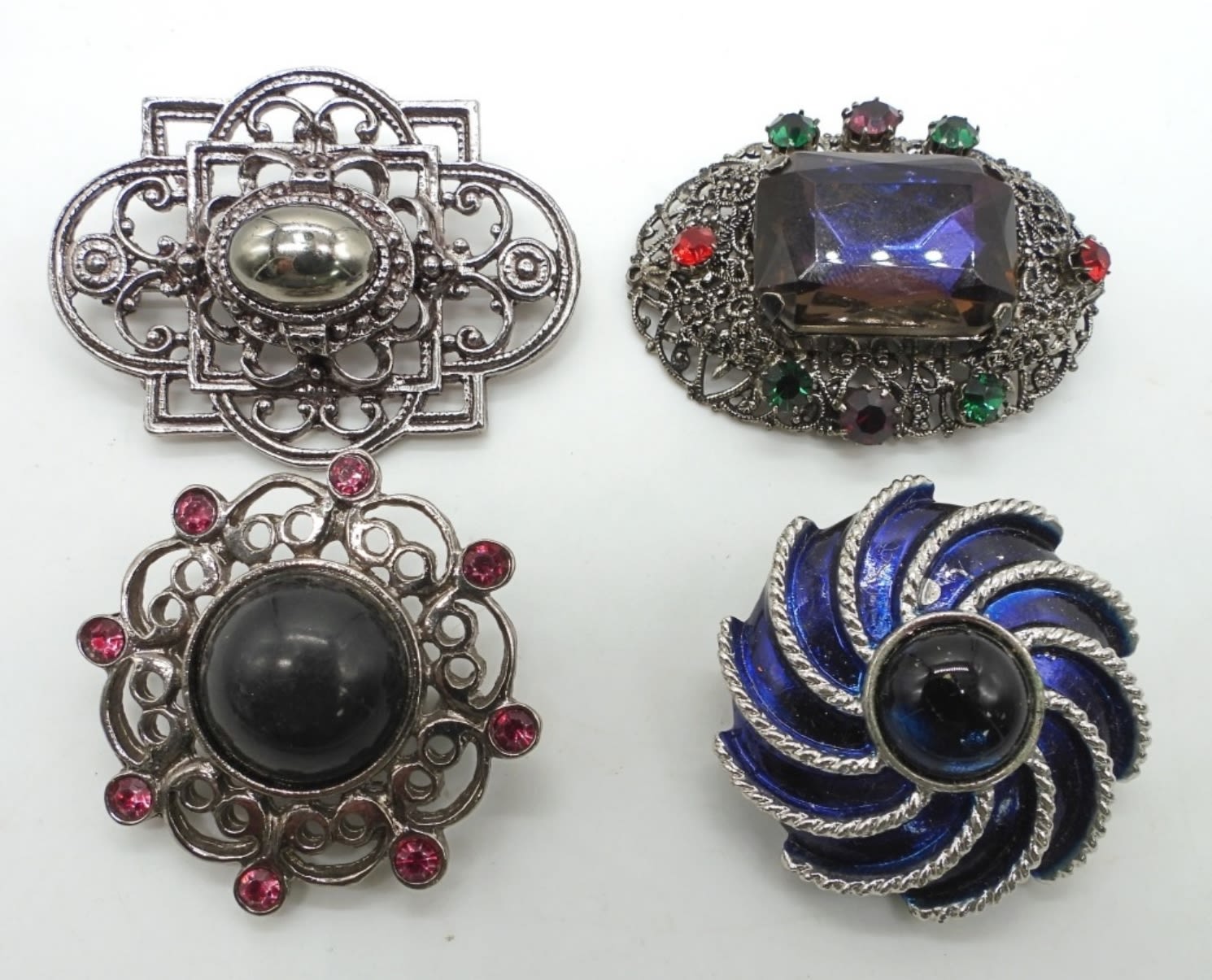 ALL ARE 2IN LONG OR LITTLE UNDER,1 OVAL W/PURPLE GEM IN THE MIDDLE WITH RED AND GREEN STONES AROUND, 1 WITH A HEMATITE STONE IN THE MIDDLE, 1 CIRCLE WITH A BACK ONYX AND PINK STONES, AND ON CIRCLE WITH BLUE STONE