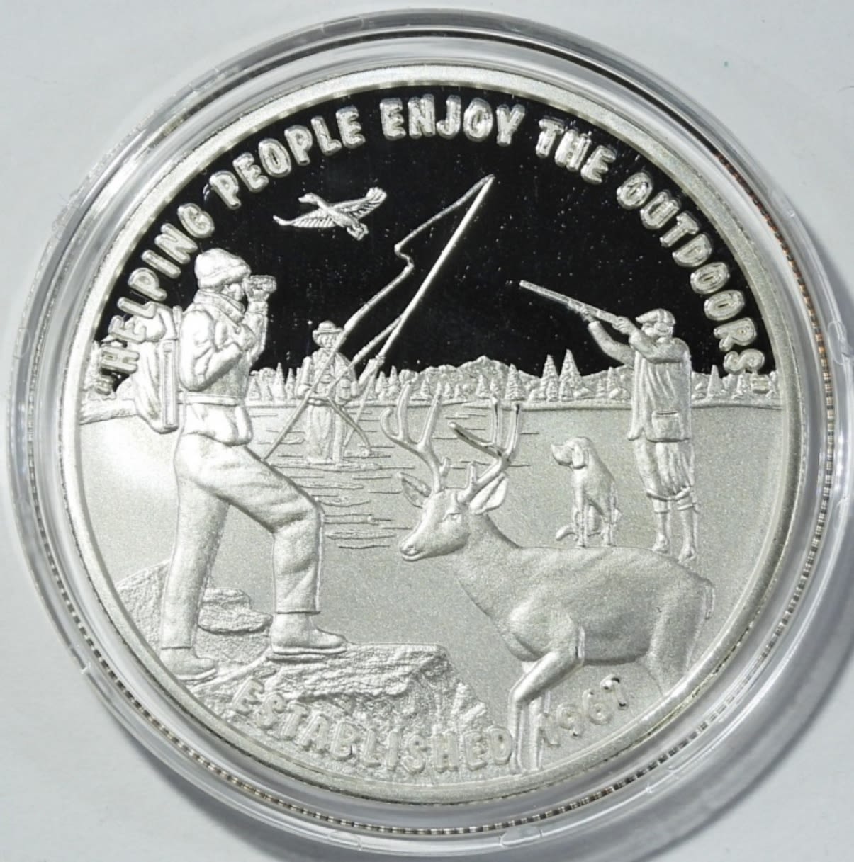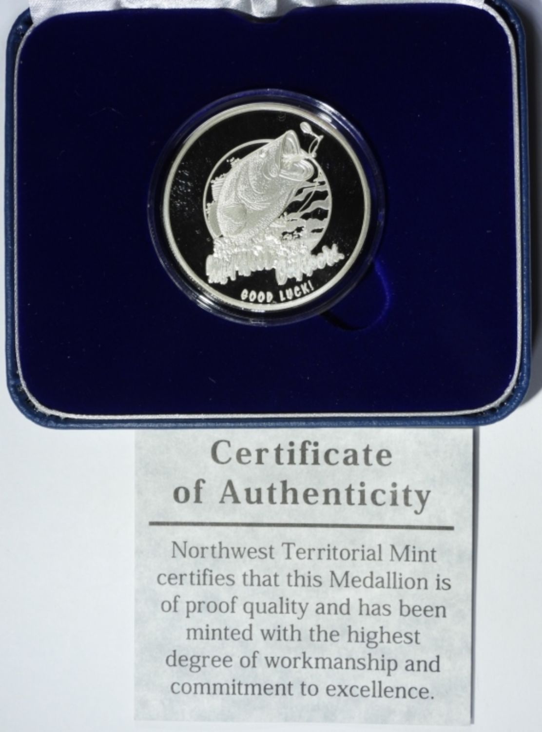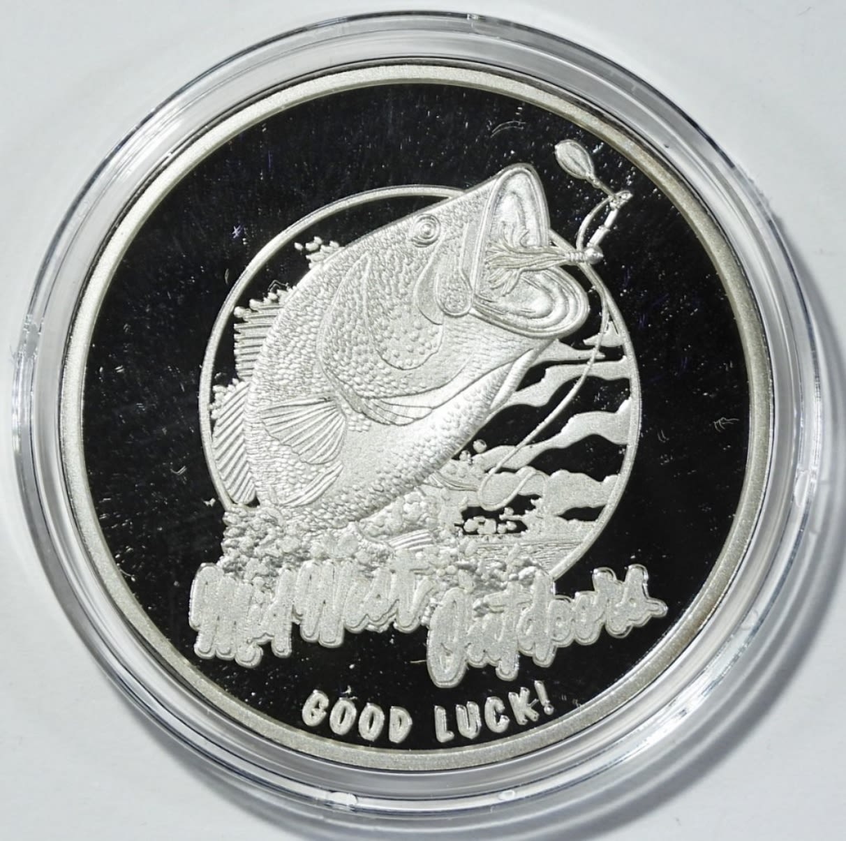 MIDWEST OUTDOORS GOOD LUCK MEDALLION “HELPING PEOPLE ENJOY THE OUTDOORS” IN DISPLAY BOX WITH COA. NORTHWEST TERRITORIAL MINT.