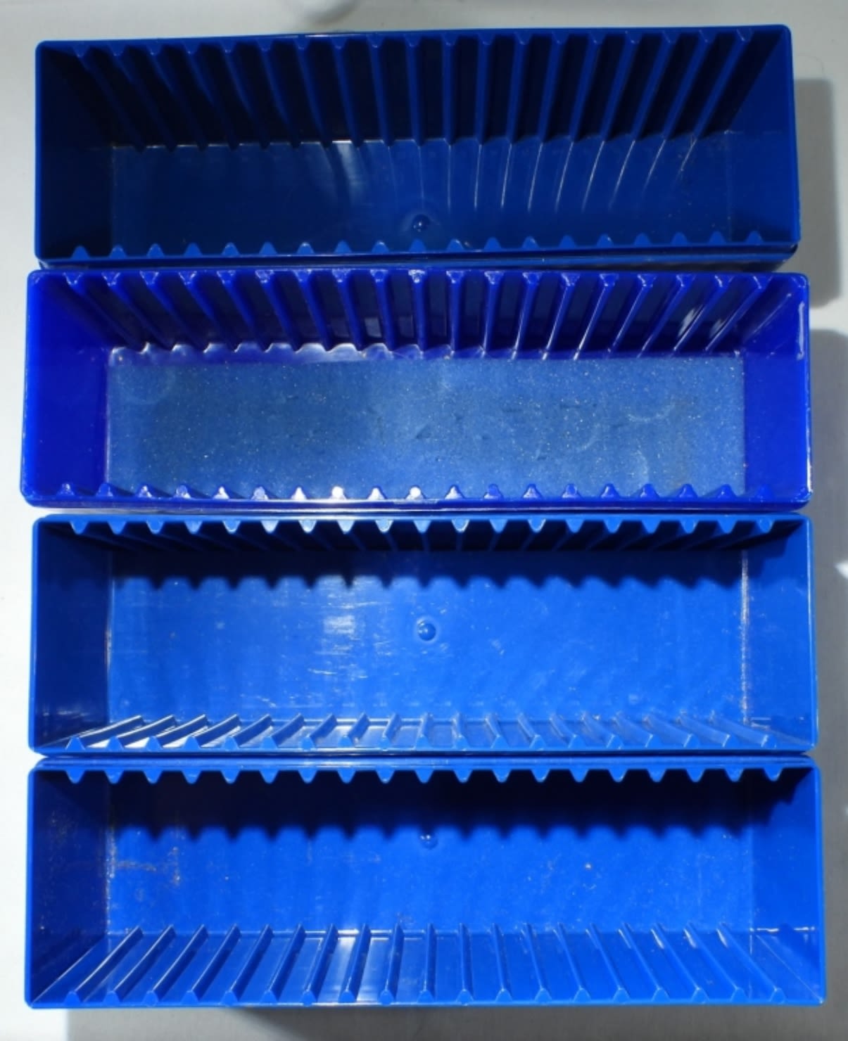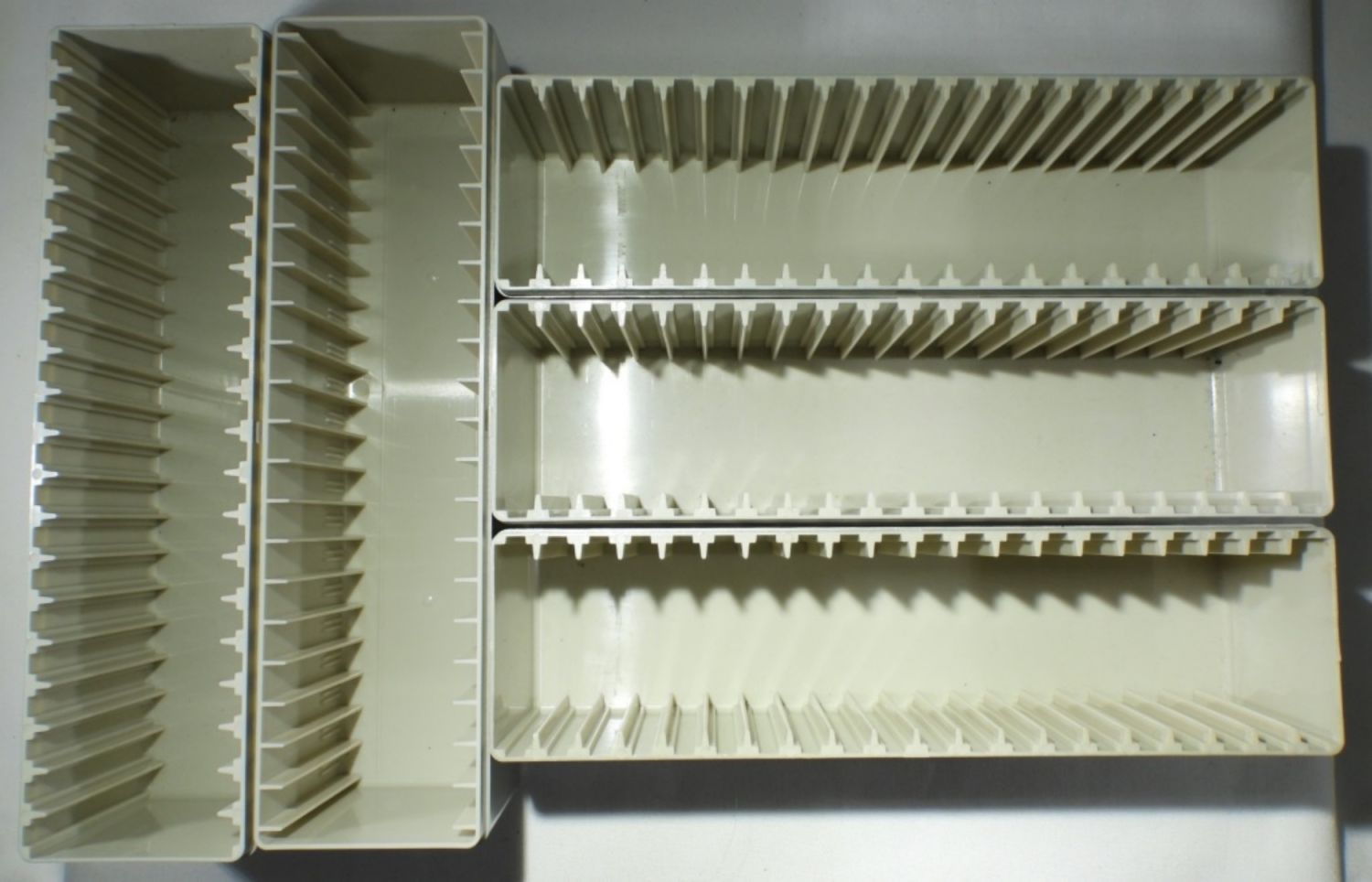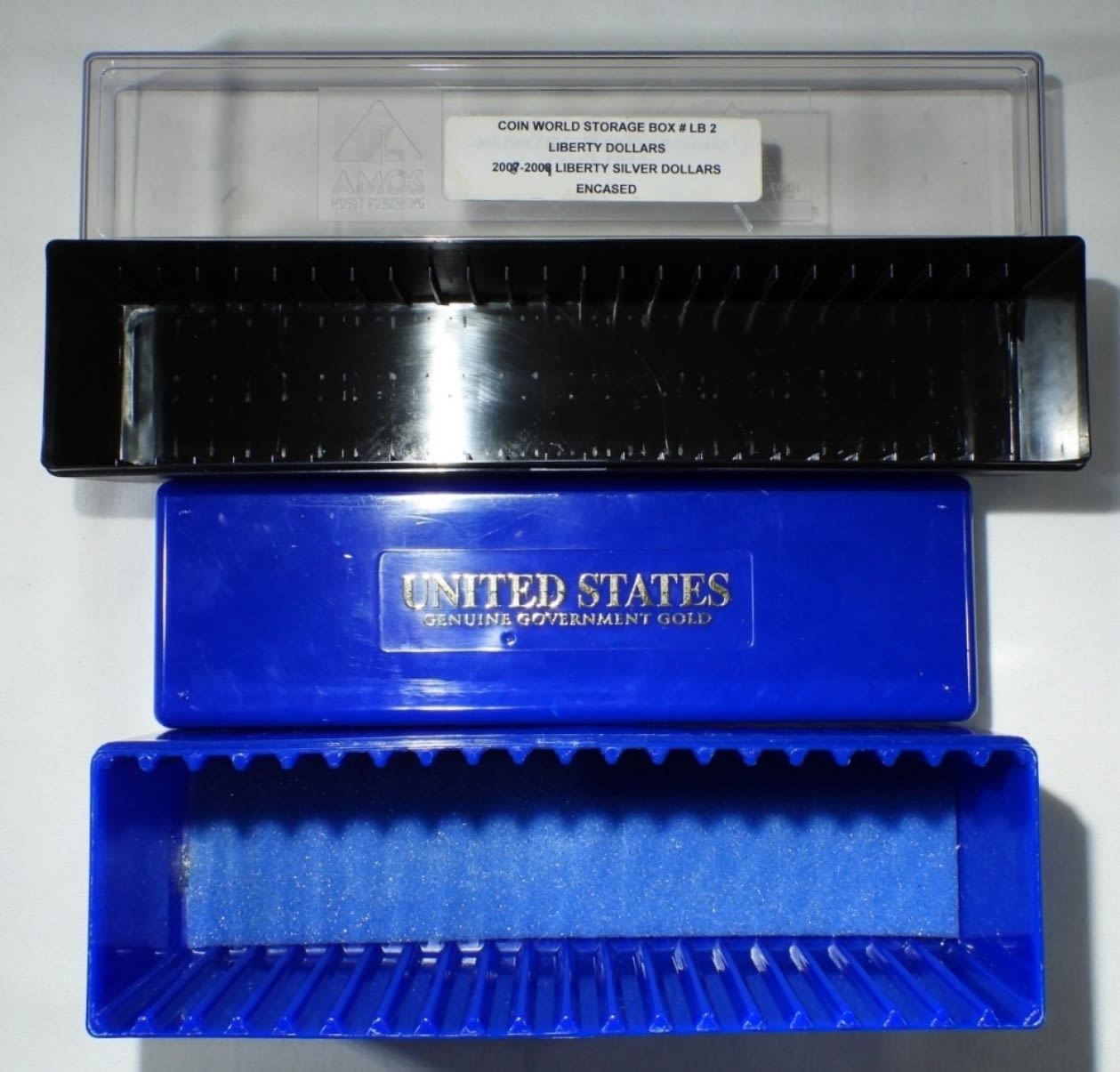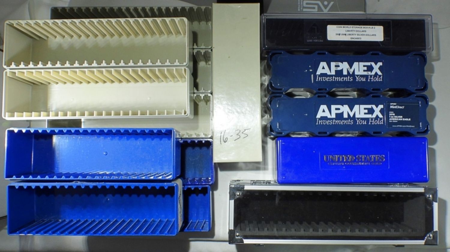 EMPTY STORAGE BOXES. (2) AMPEX COIN BOXES & 13 SLAB COIN BOXES: (9) MISSING LIDS, (4) MISCELLANEOUS BRANDS – (1) NICE CARDBOARD.