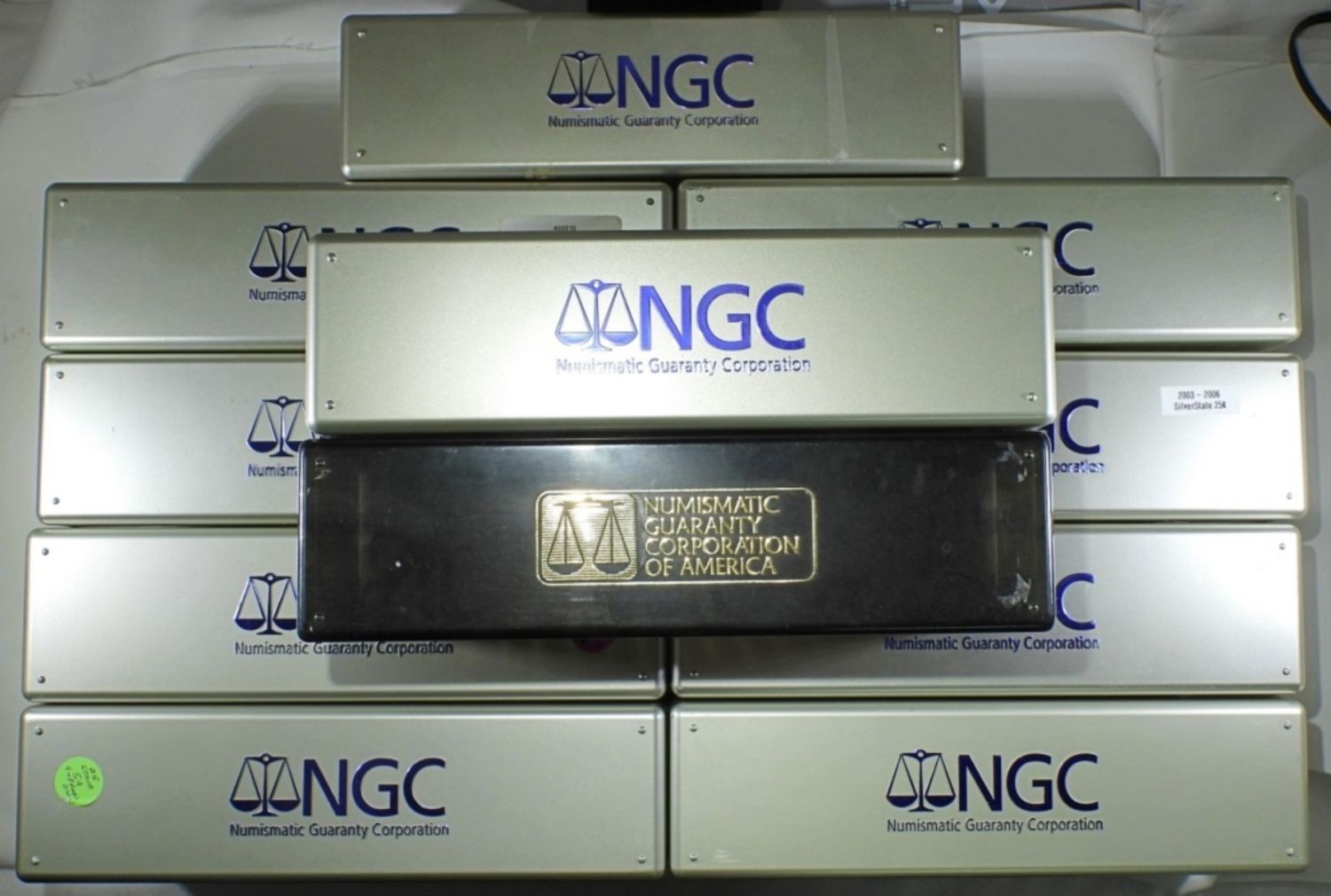 EMPTY NGC 20-COIN SLAB STORAGE BOXES. (10) SILVER, (1) TRANSPARENT BLACK