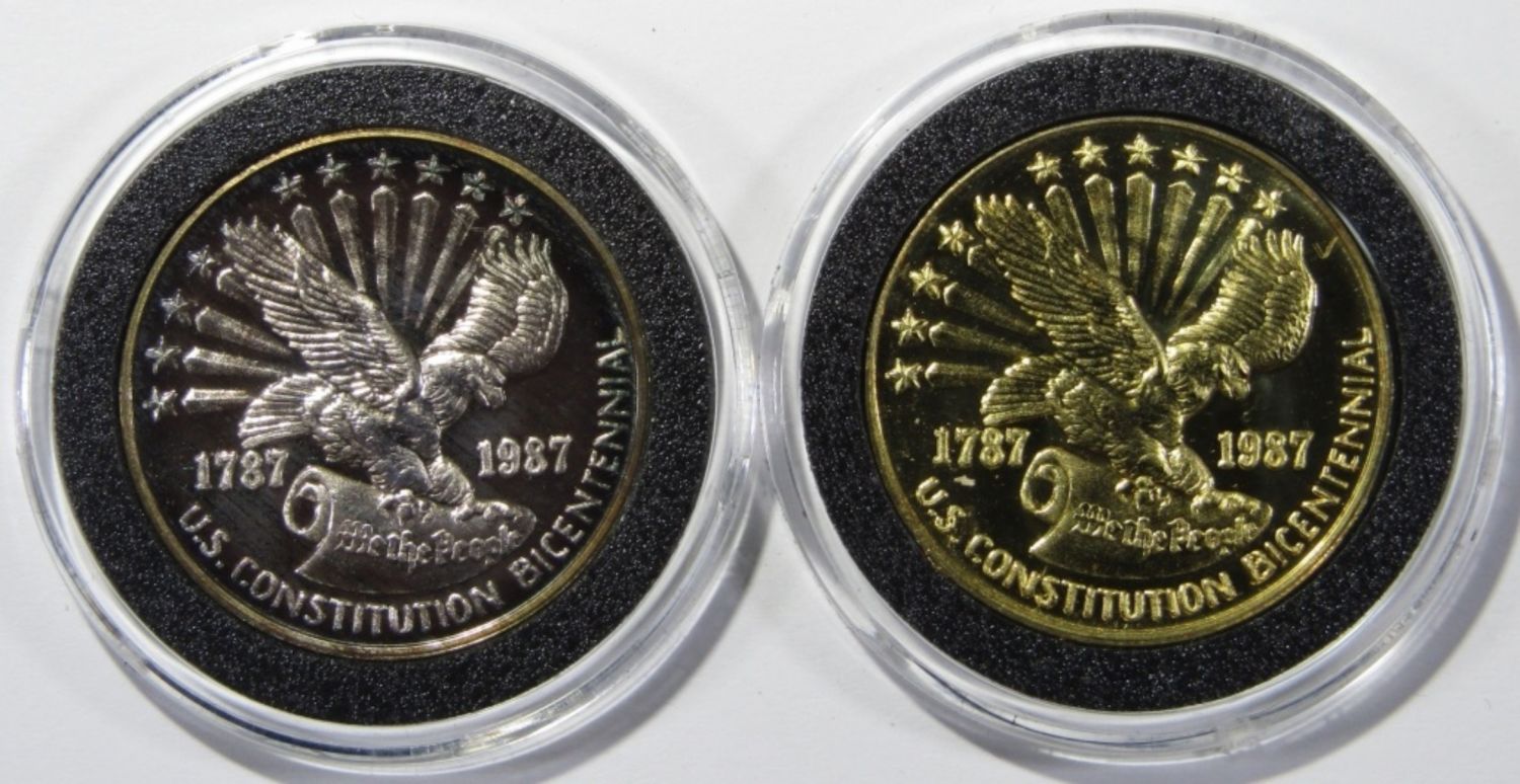 (2) 1/2 oz .999 SILVER CONSTITUTION BICENTENNIAL ROUNDS. ONE ELECTROPLATED WITH 24K GOLD. IN DISPLAY BOX WITH COA. UNITY MINT.
