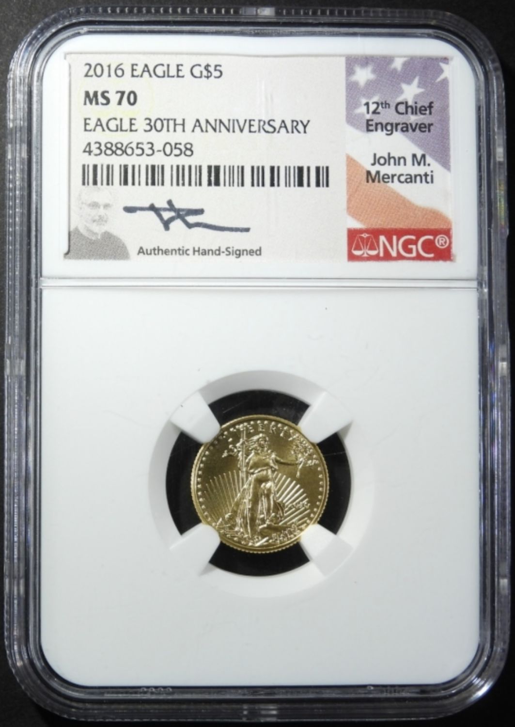 EAGLE 30TH ANNIVERSARY, JOHN MERCANTI SIGNED. 1/10 oz .999 GOLD
