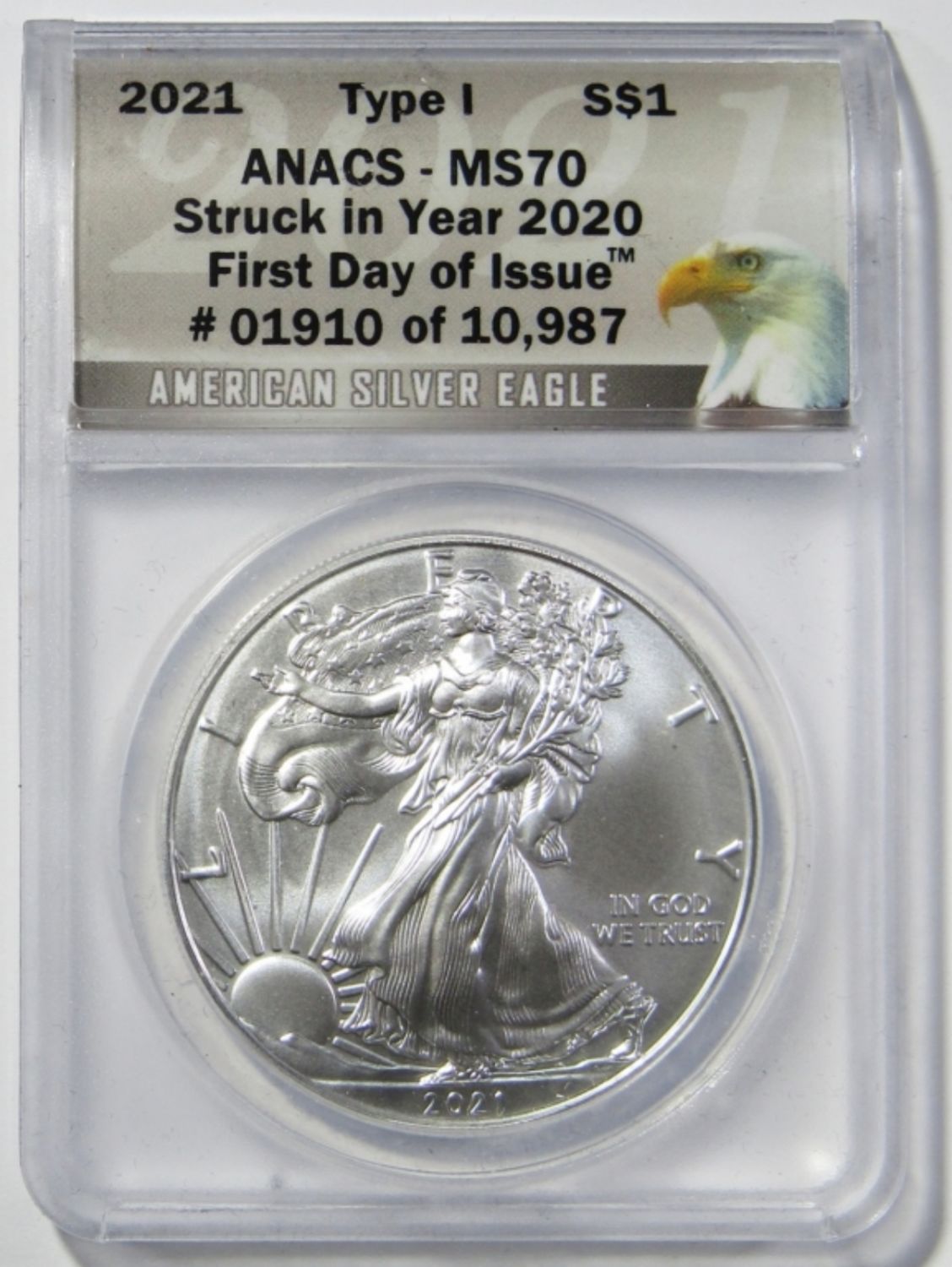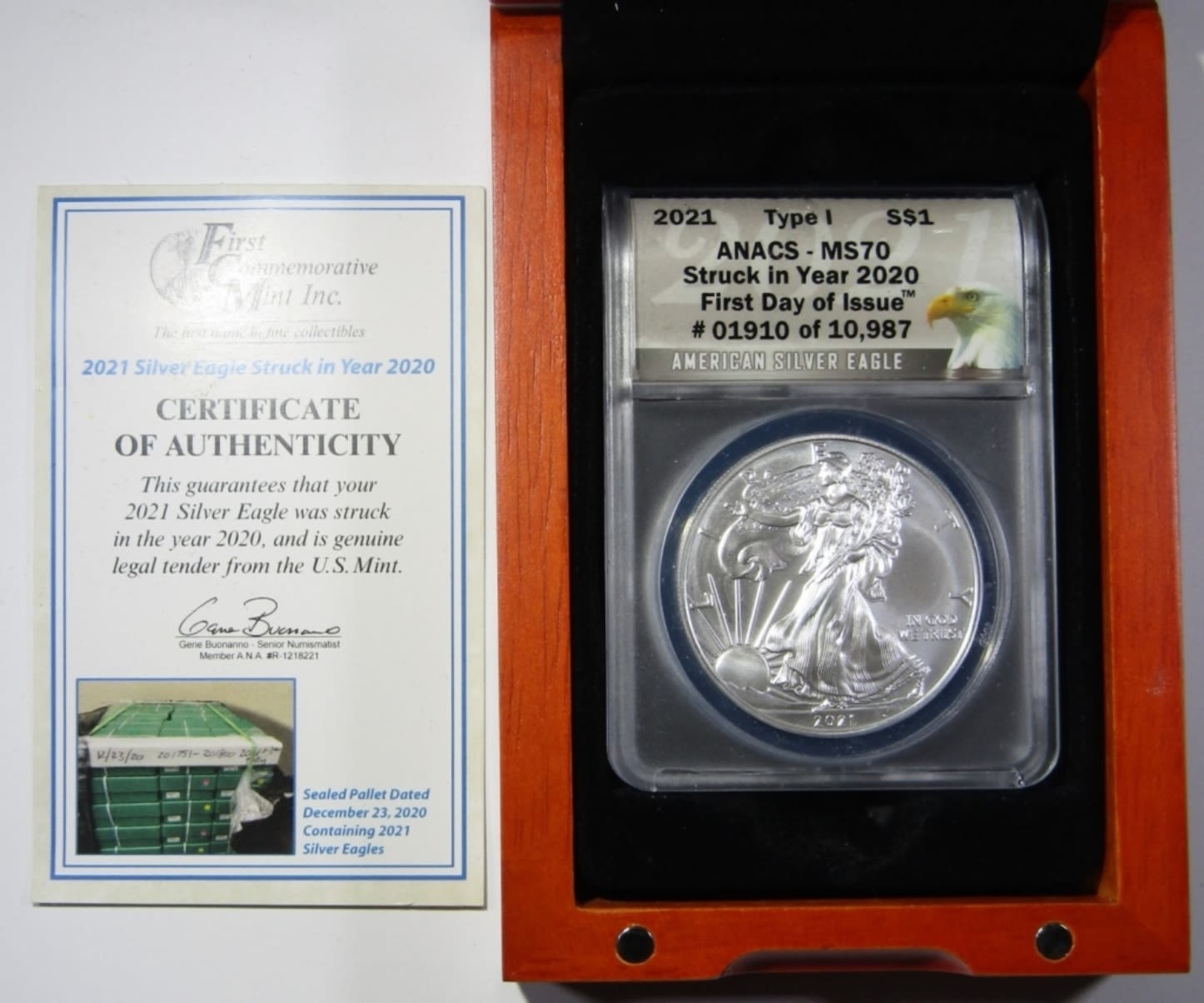 FIRST DAY OF ISSUE. STRUCK IN YEAR 2020. IN WOODEN DISPLAY CASE WITH FIRST COMMEMORATIVE MINT COA.