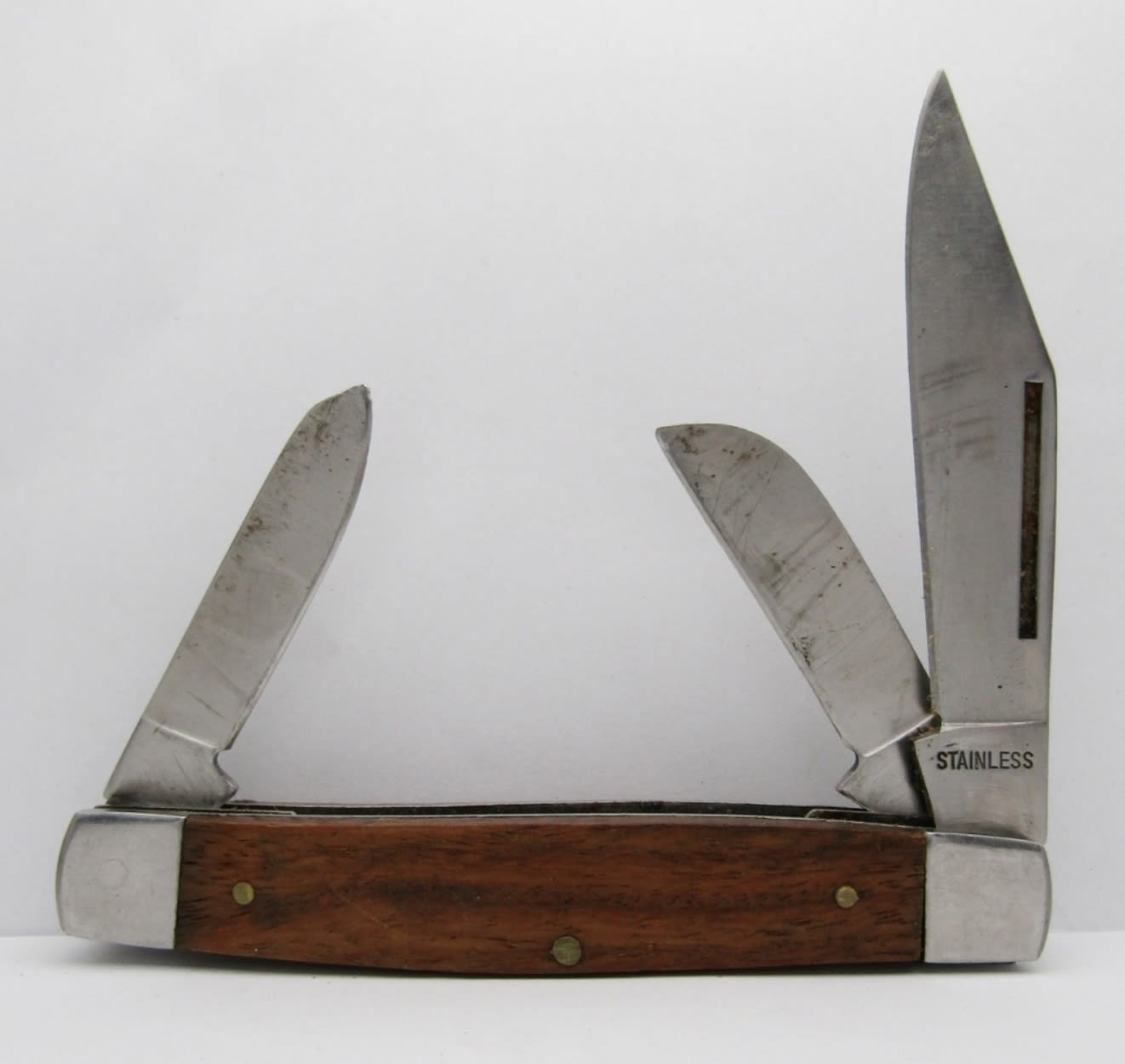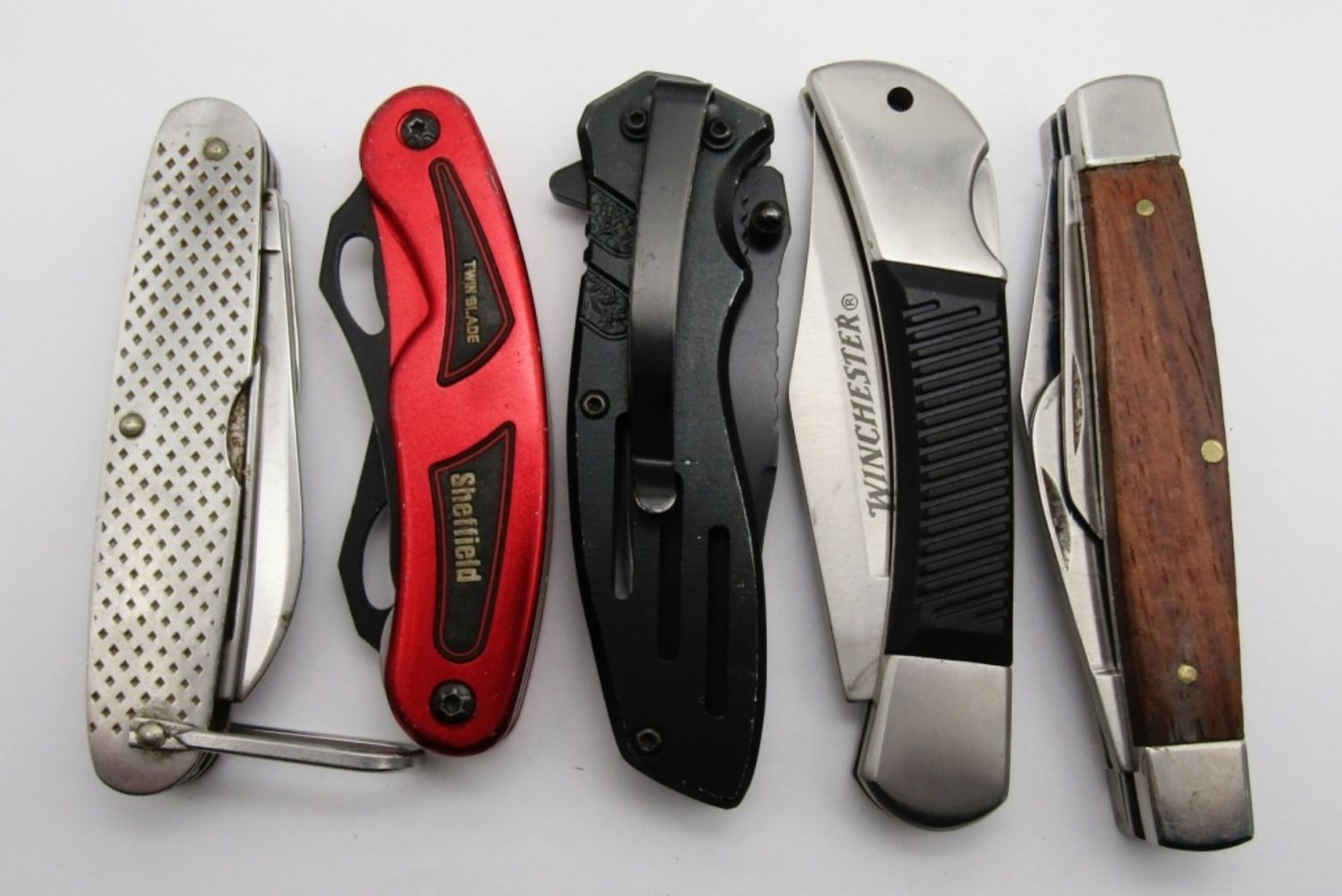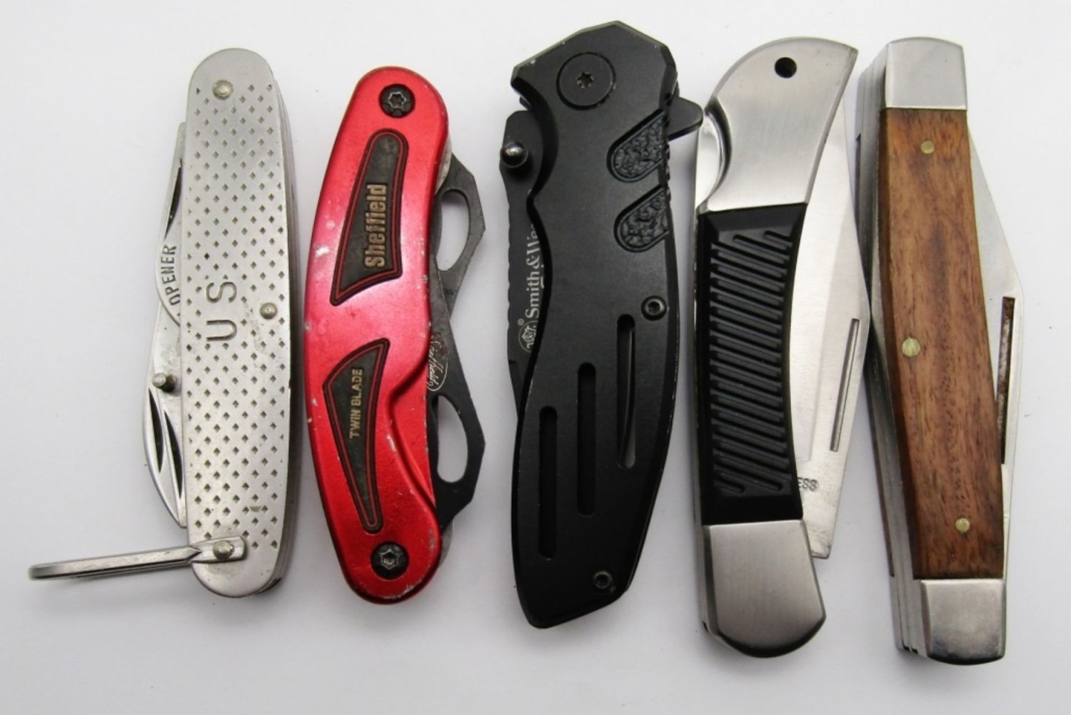 3-Blade Stainless With Wood Handle, 4-Blade Camillus US, Single Blade Smith & Wesson Extreme Ops, Twin Blade Sheffield; Lightly Used/Used Conditions.