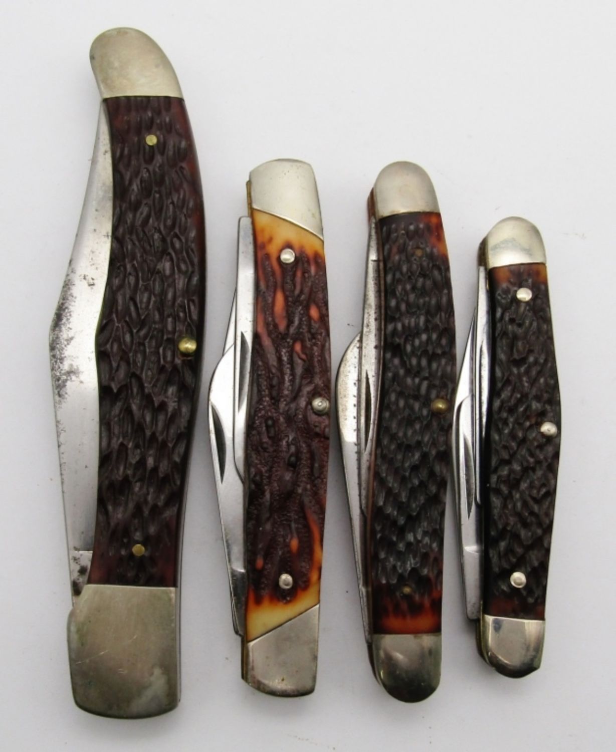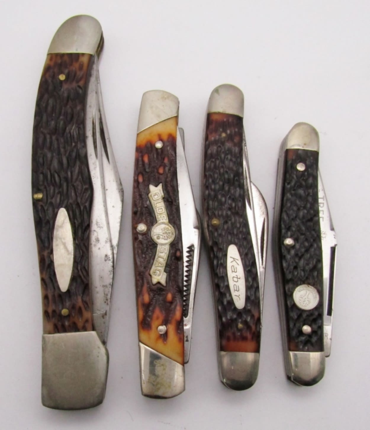 2-Blade Western USA 062, 3-Blade Olde Stag Tree Brand 15321, 3-Blade Kabar, 3-Blade Boker Tree Brand USA 85193; Lightly Used/Used Conditions.