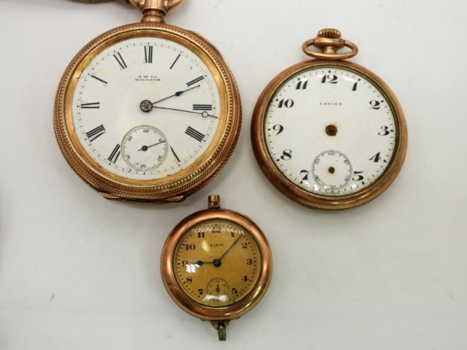AM. WALTHAM SIZE 16, ELGIN LADIES SIZE 6, LANCET SIZE 12 – ALL FOR PARTS / REPAIR