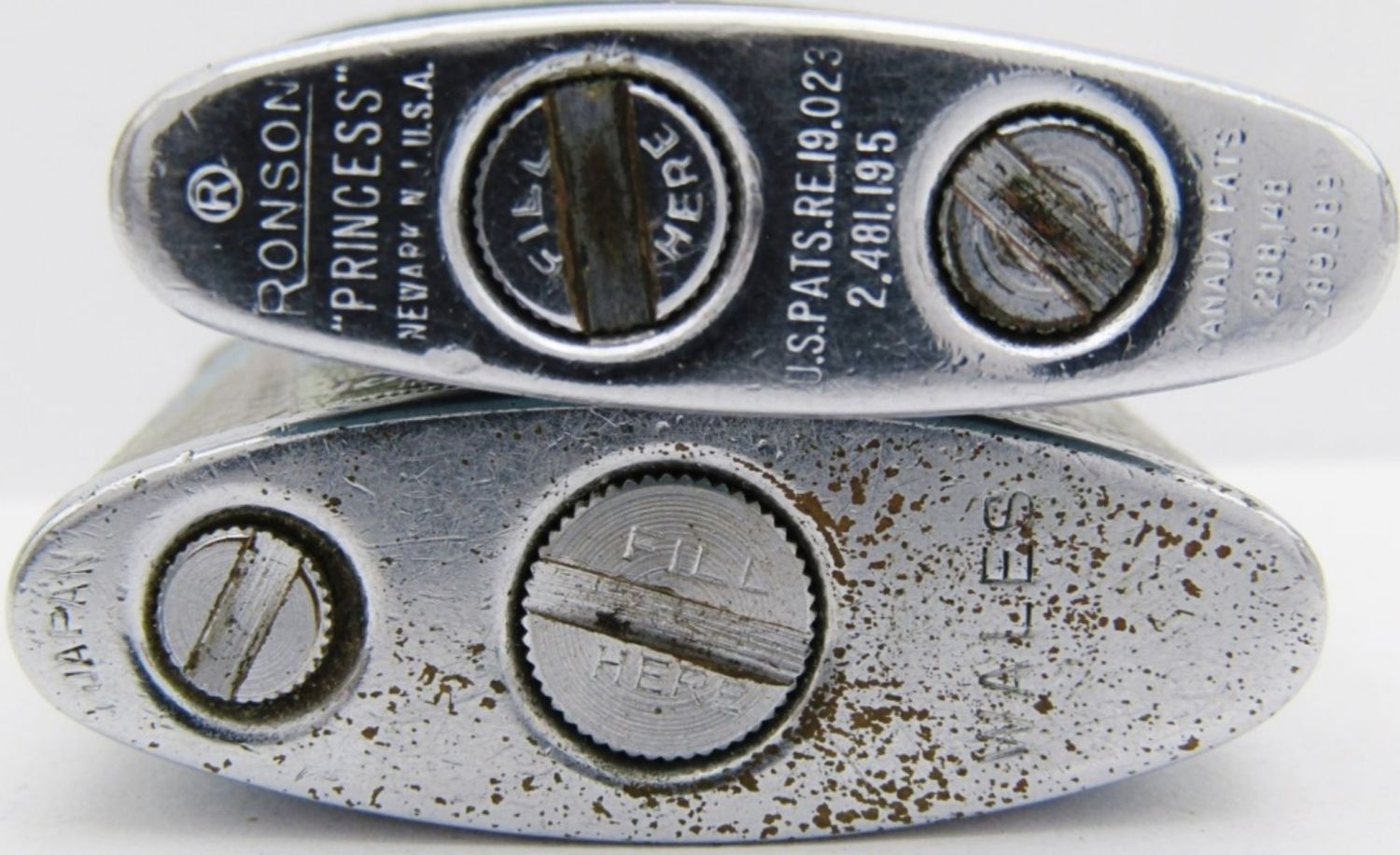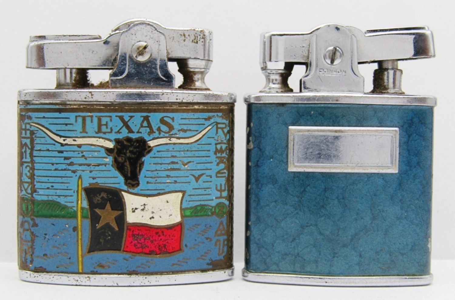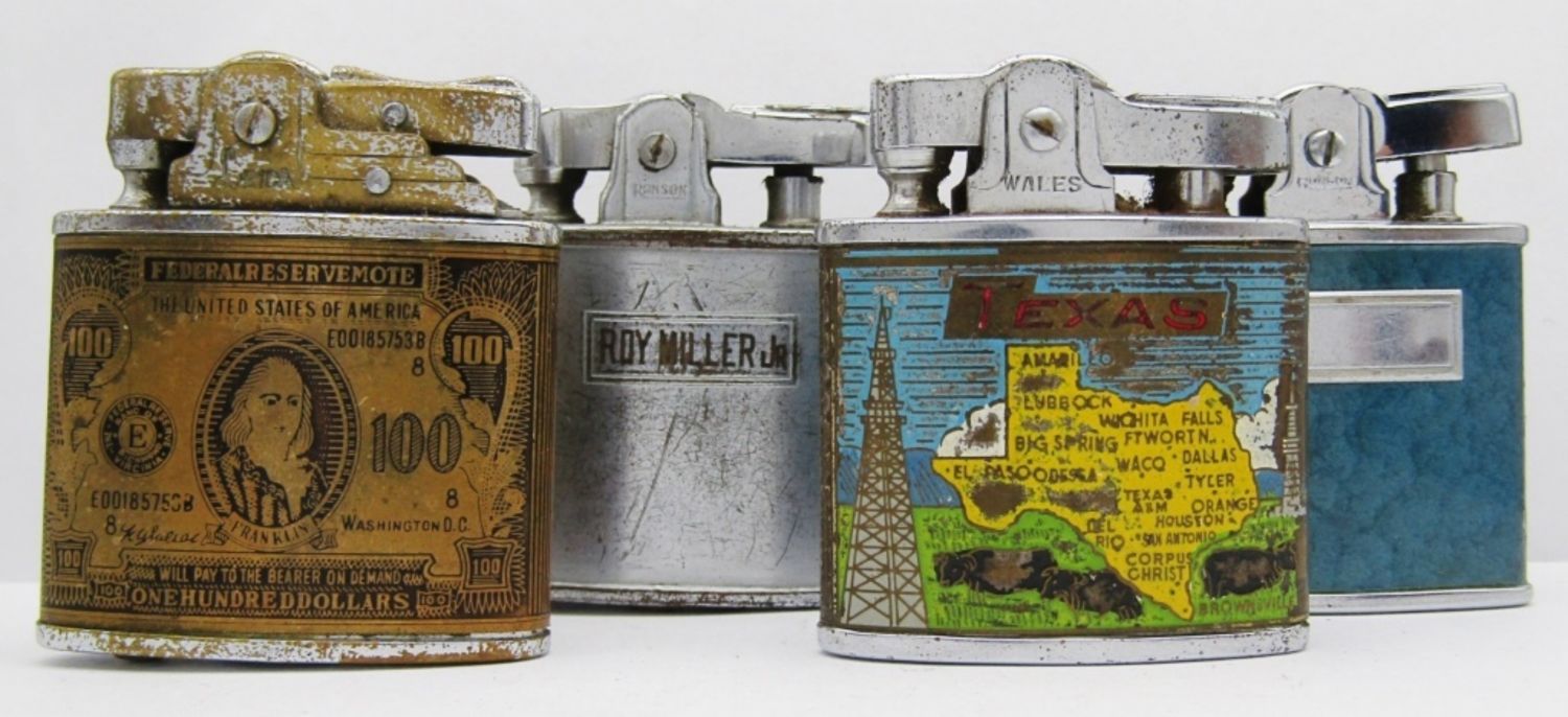 Leica Super Lighter ($100 Design), Wales Japan (Texas State & Flag), Ronson Princess (Blue), Ronson Art Metal Wks (Roy Miller Jr.); All used conditions.