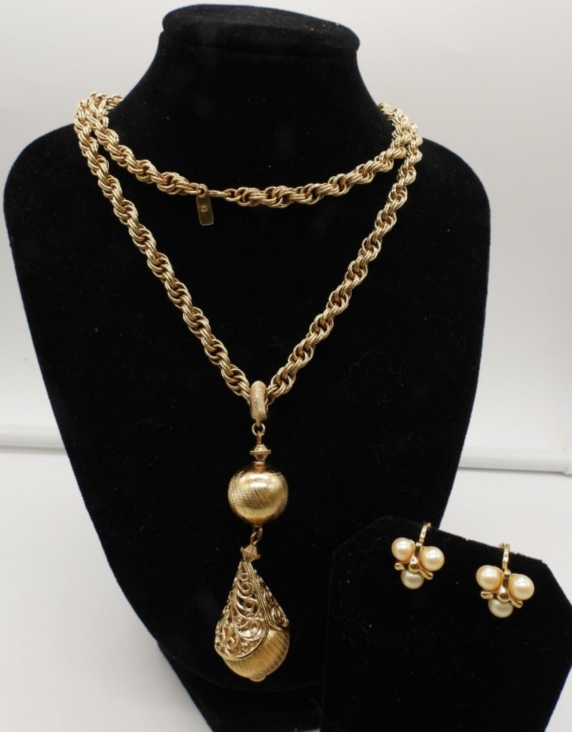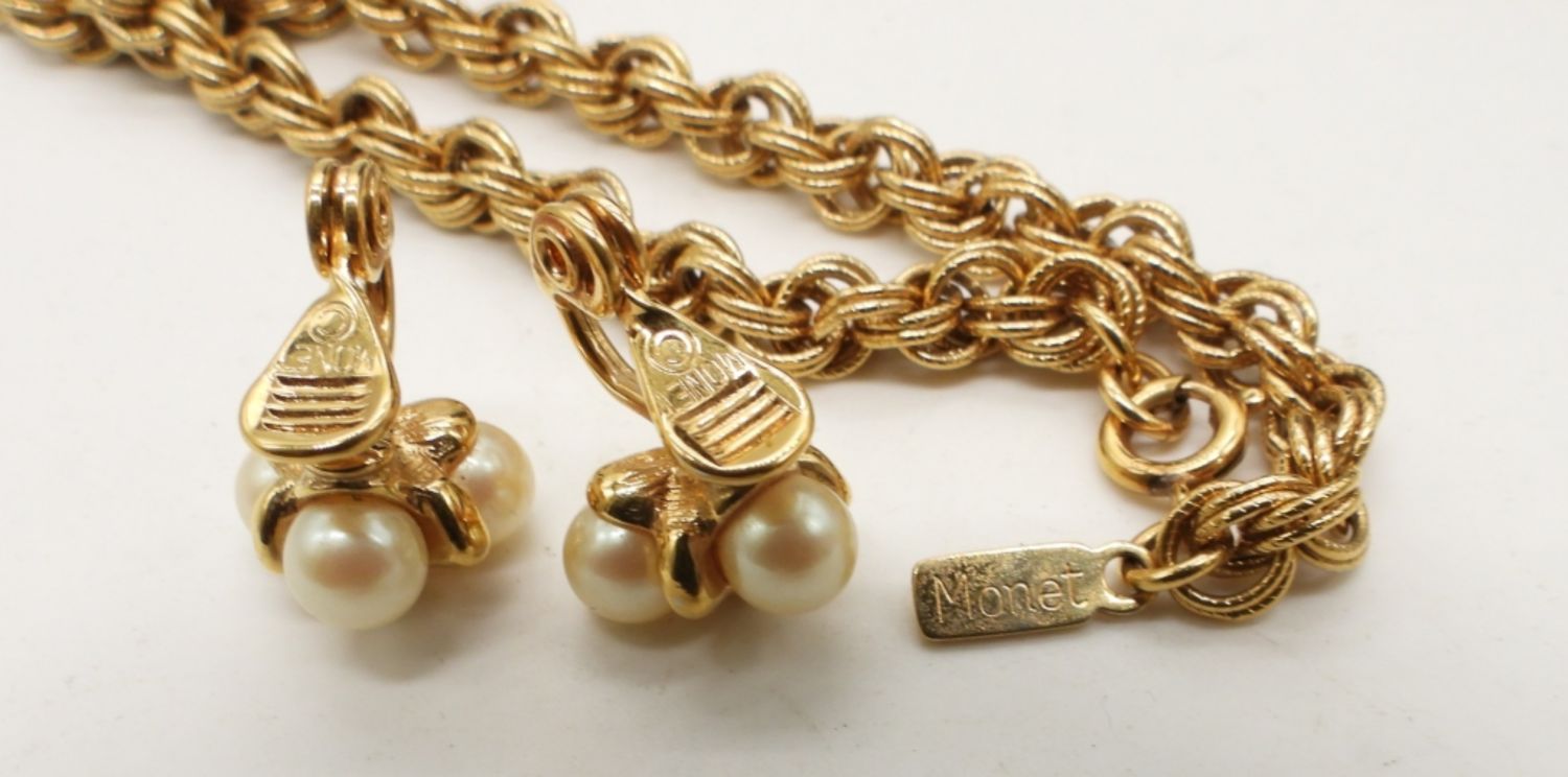 30IN LONG W/PENDANT GOLD TONE WHEAT CHAIN, SPRING CLASP, GOLD TONE W/FAUX PEARL STUD CLIP-ONS, ALL STAMPED WITH MONET