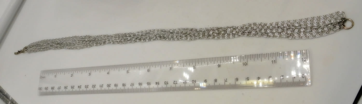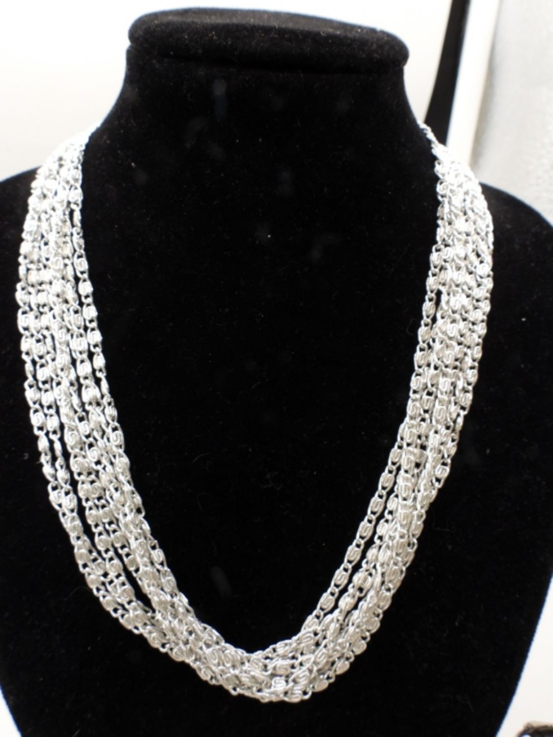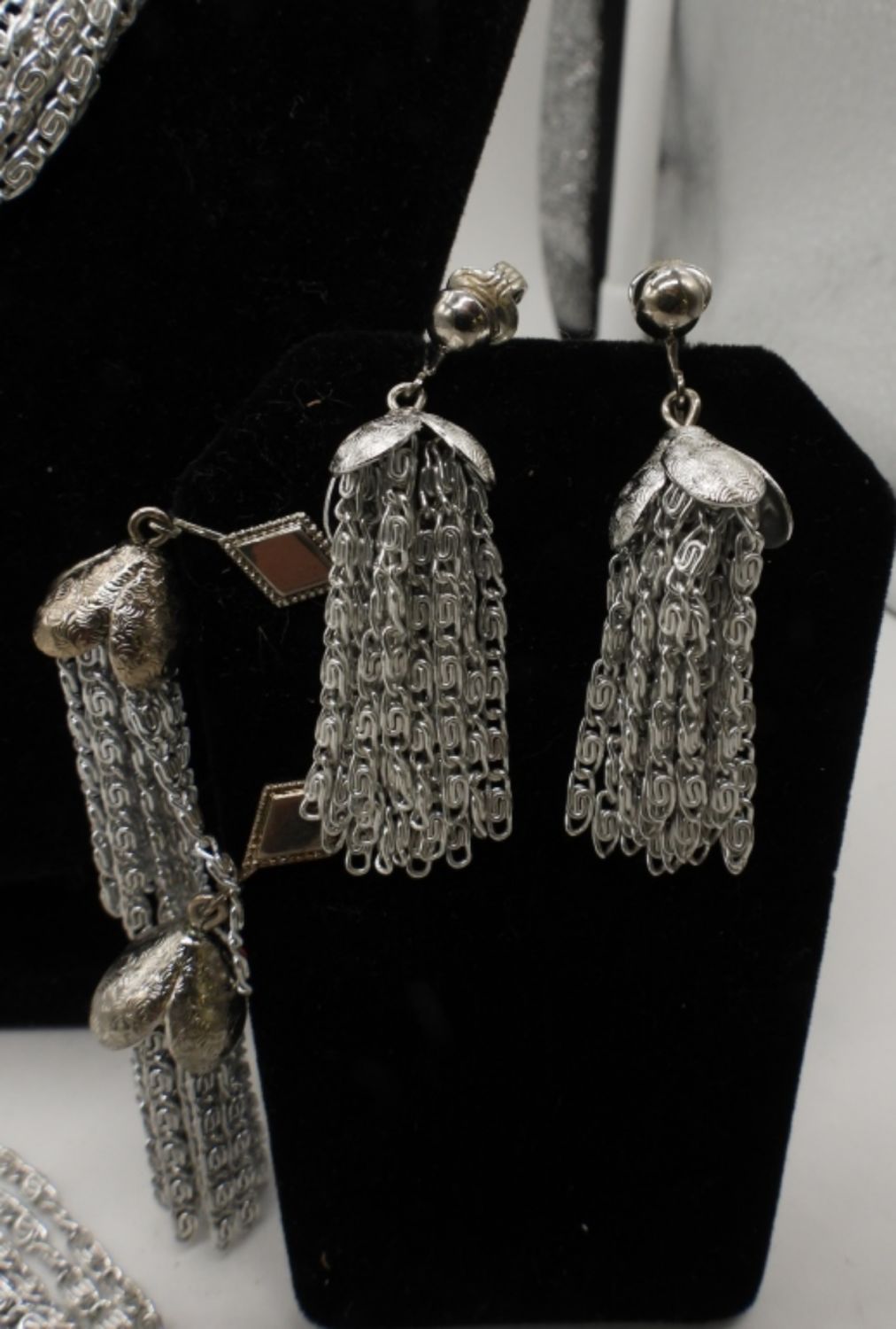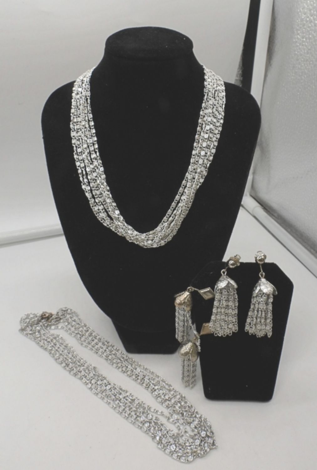 BOTH CHOKERS ARE 16IN LONG, SILVER TONE, OPEN BOX CLASP, WITH MARKER ON CLASP, 2 PAIRS OF DANGLED CLIP-ON EARRINGS ALSO STAMPED SARAH COV ON BACK OF CLIPS