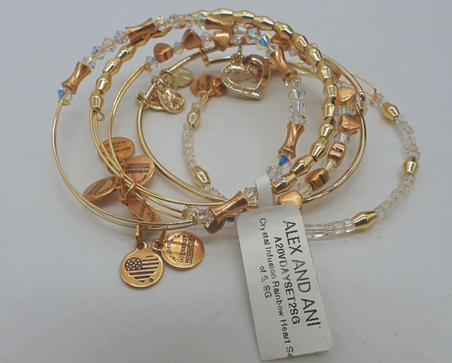 GOLD TONE, HAS CLEAR CRYSTALS AND GOLD TONE HEARTS, ALONG WITH A RAINBOW HEART CHARMS