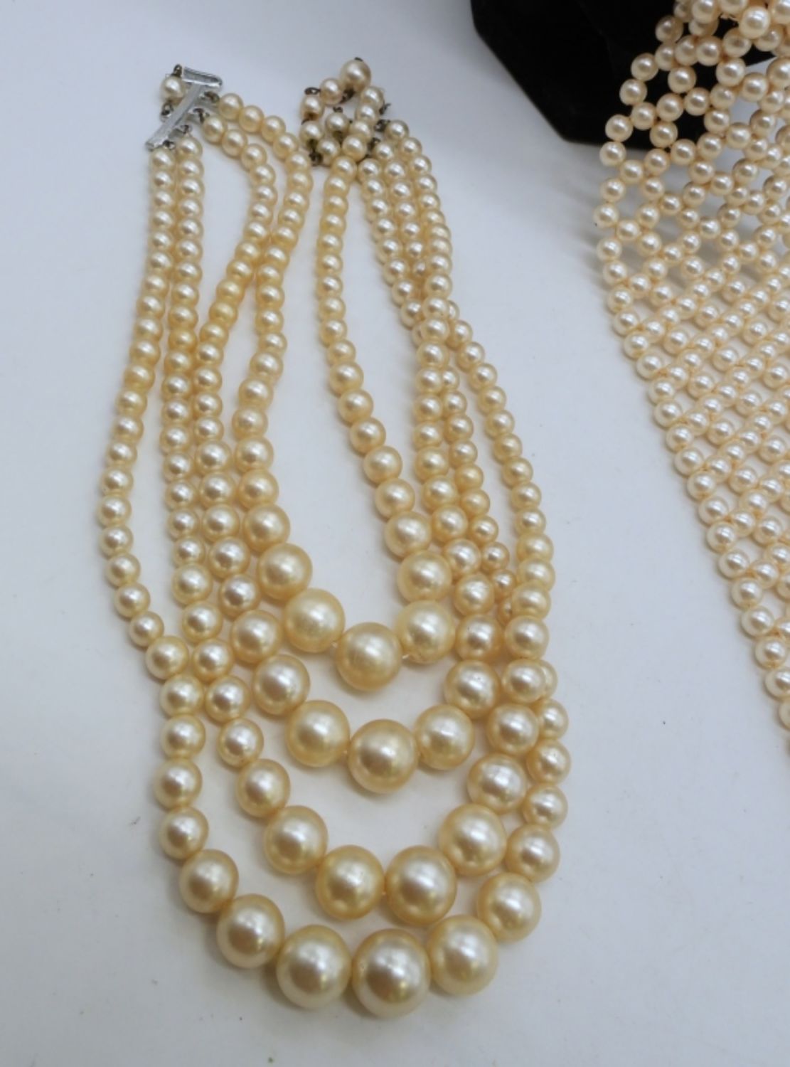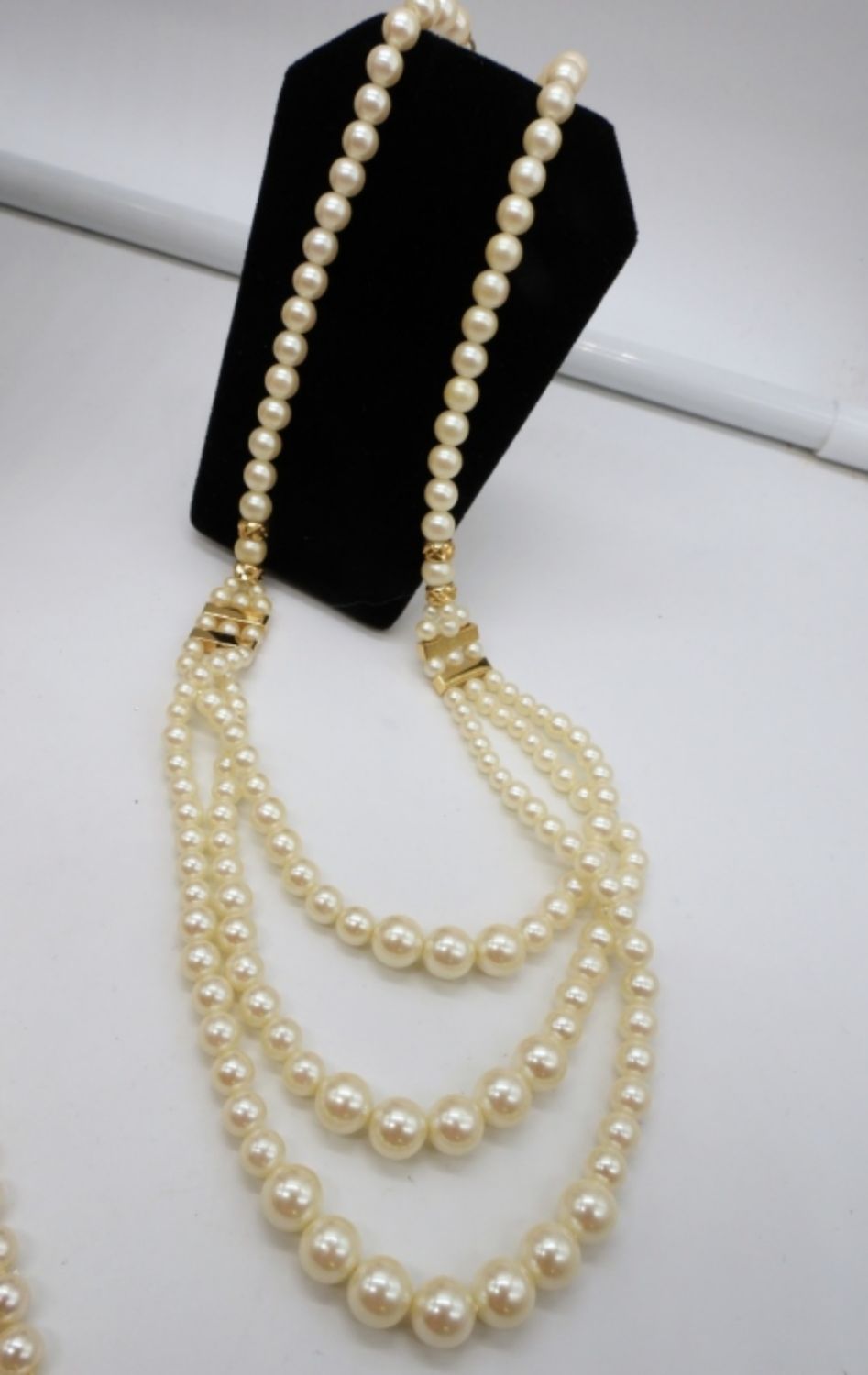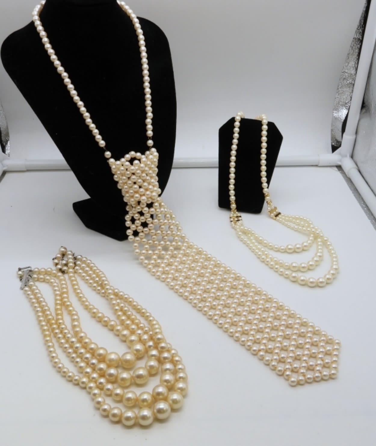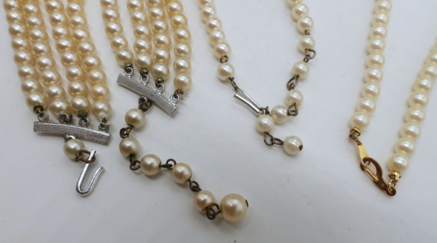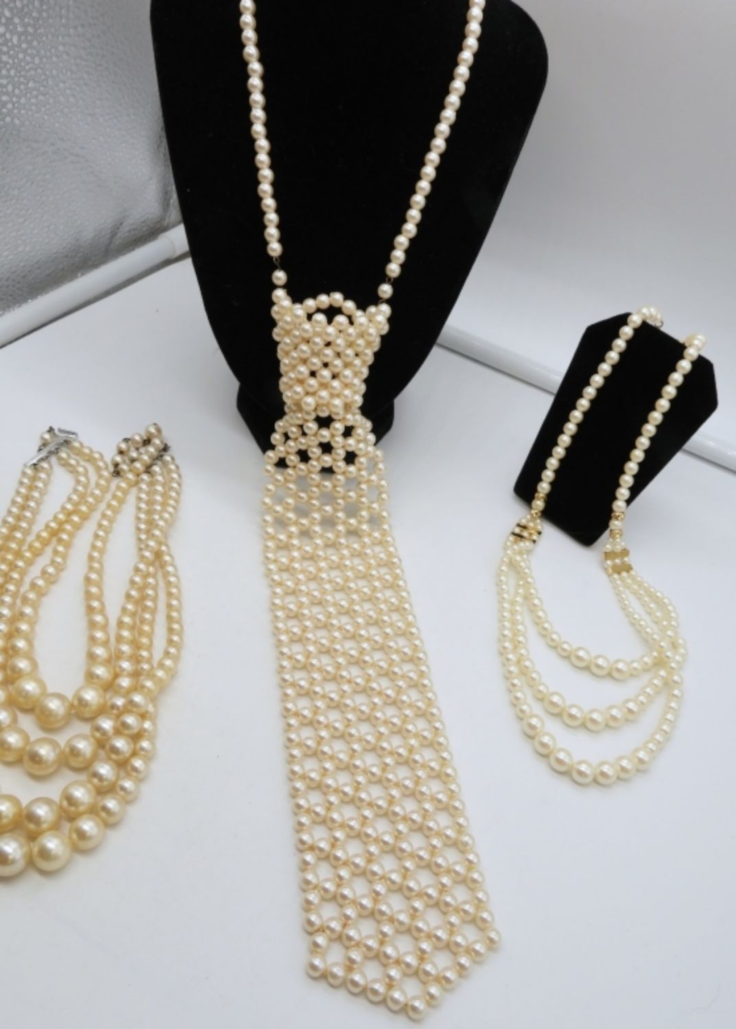 1- 17IN LONG FAUX PEARL TIE CHOKER, 1- 18IN LONG GOLD TONE FESTOON STYLE, 1- SILVER TONE 17IN LONG LAYERED STYLE