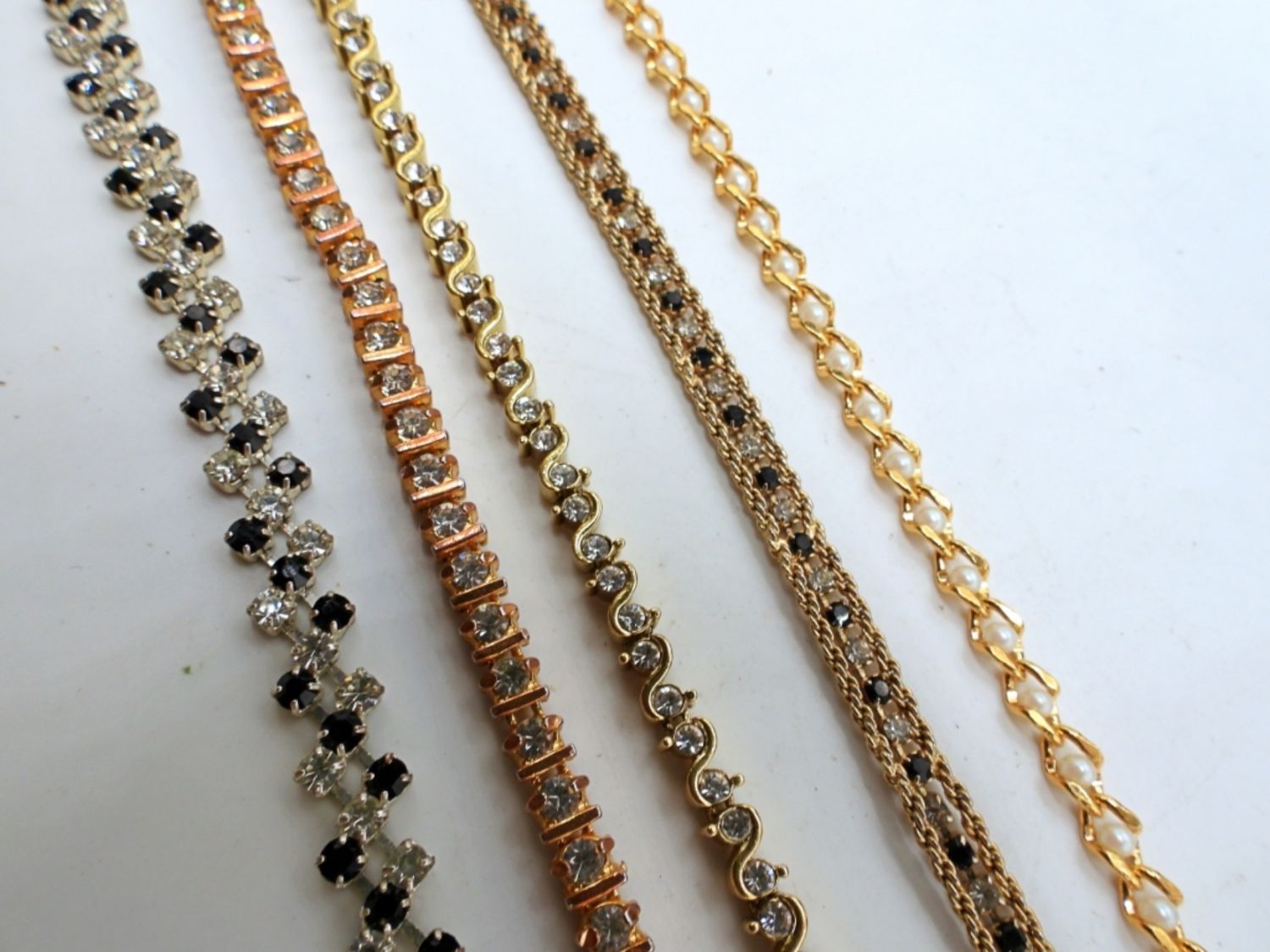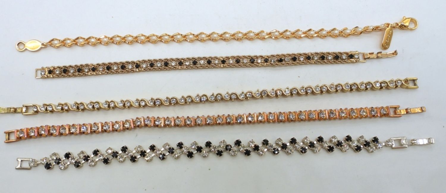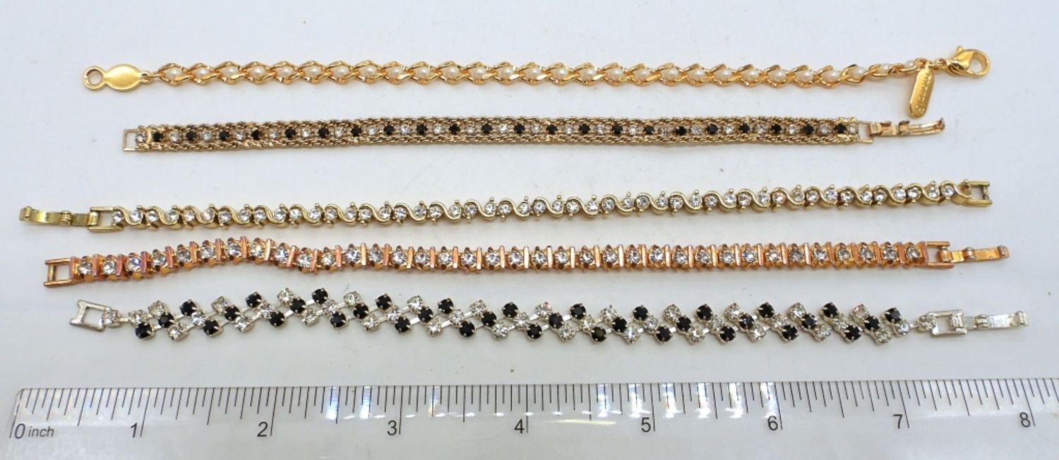 1- 7IN LONG GOLD TONE W/ CLEAR AND BLACK STONES, 2- 8IN GOLD TONE/ CLEAR STONES, 1- 8IN SILVER TONE CLEAR AND BLACK STONES, 1- 8IN GOLD TONE WITH TINY FAUX PEARLS