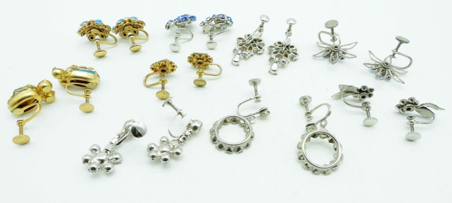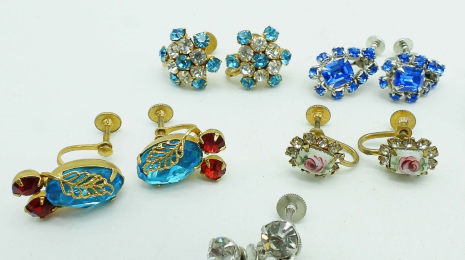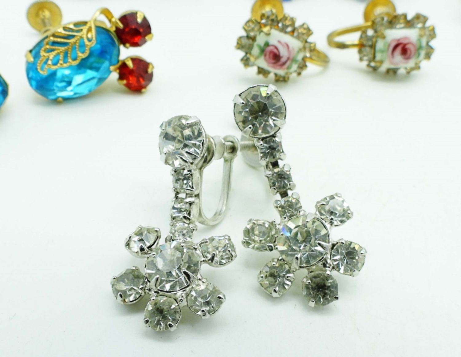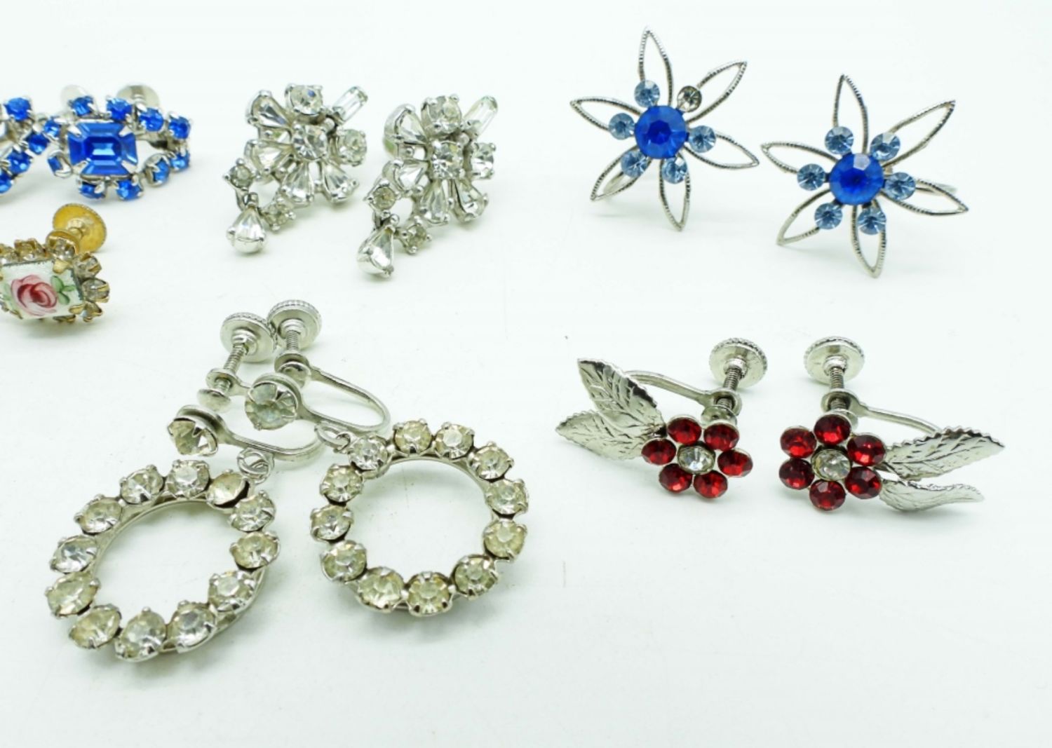 3 PAIRS OF CLEAR RHINESTONE SILVER TONE 2 PAIRS OF BLUE RHINESTONES SILVER TONE, 1 PAIR OF RED AND BLUE RHINESTONES GOLD TONE, 1 PAIR OF WHITE AND BLUE RHINESTONES GOLD TONE, 1 PAIR OF RED RHINESTONE SILVER TONE AND 1 PAIR OF PAINTED FLOWER W/CLEAR STONES AROUND IT