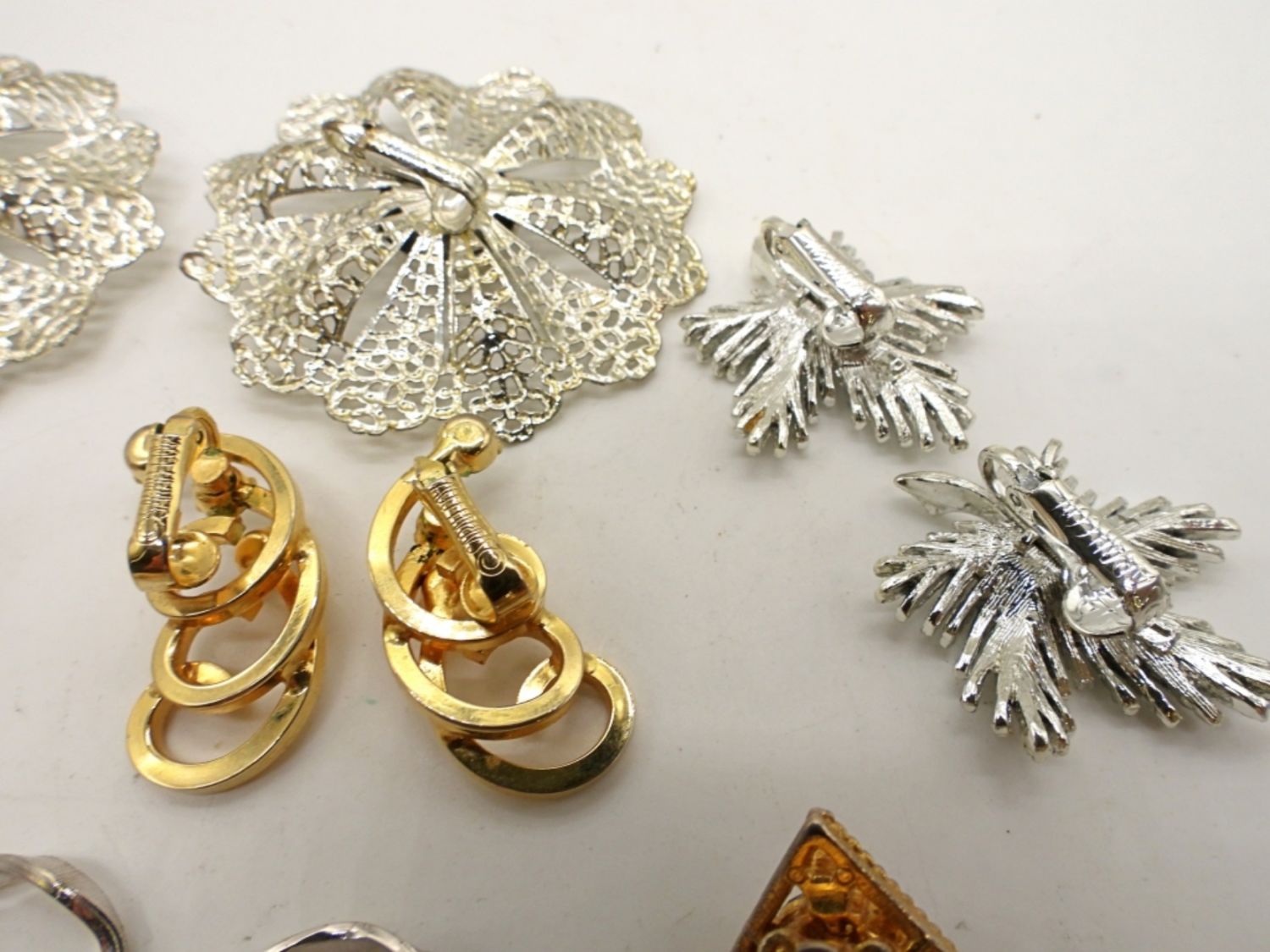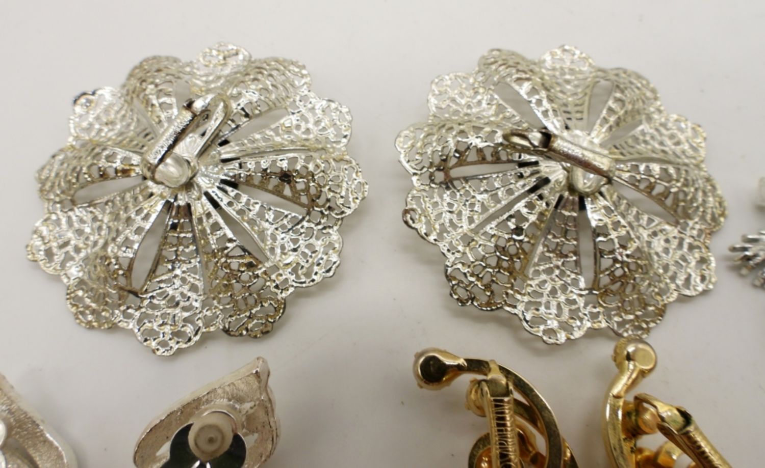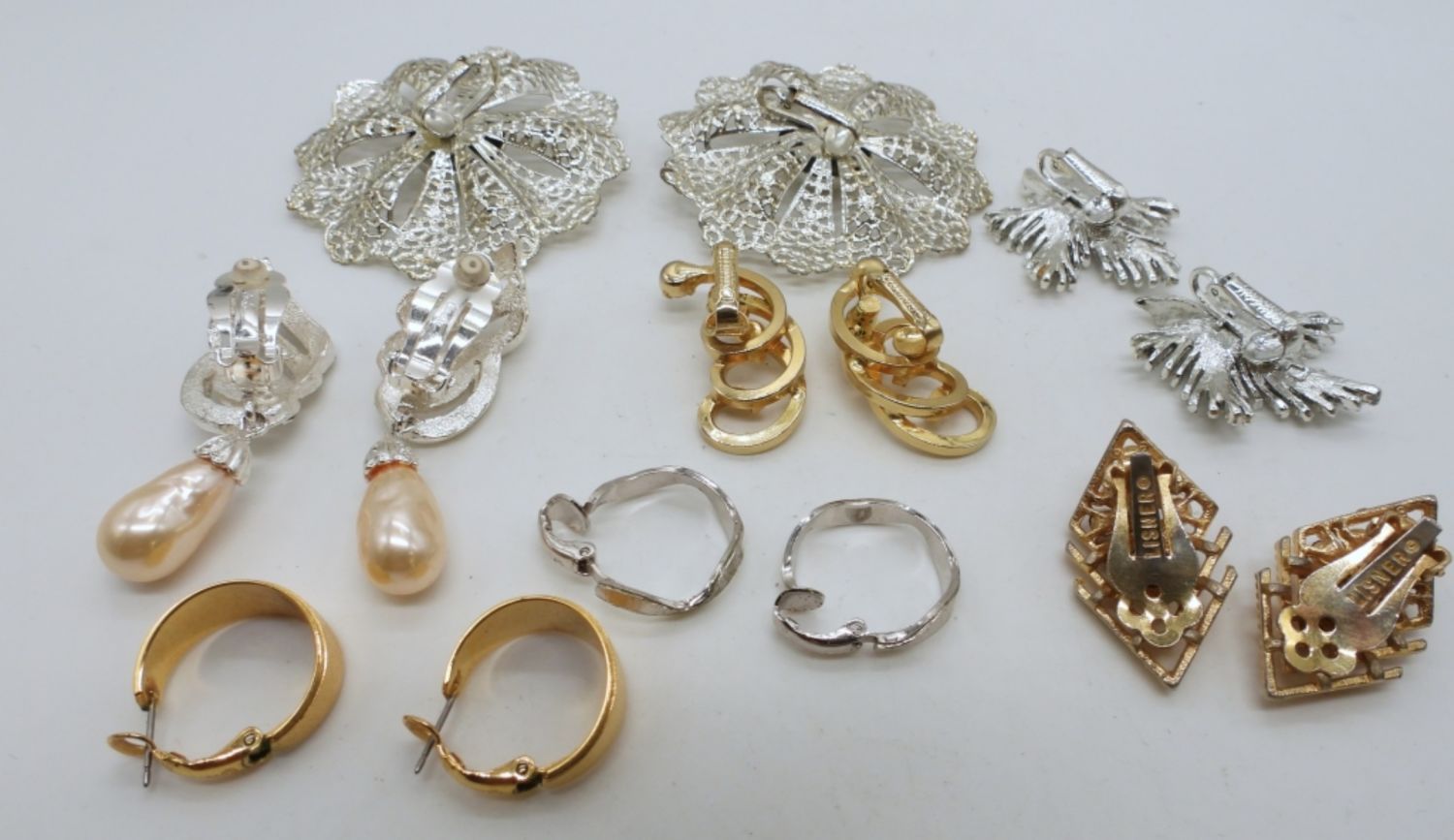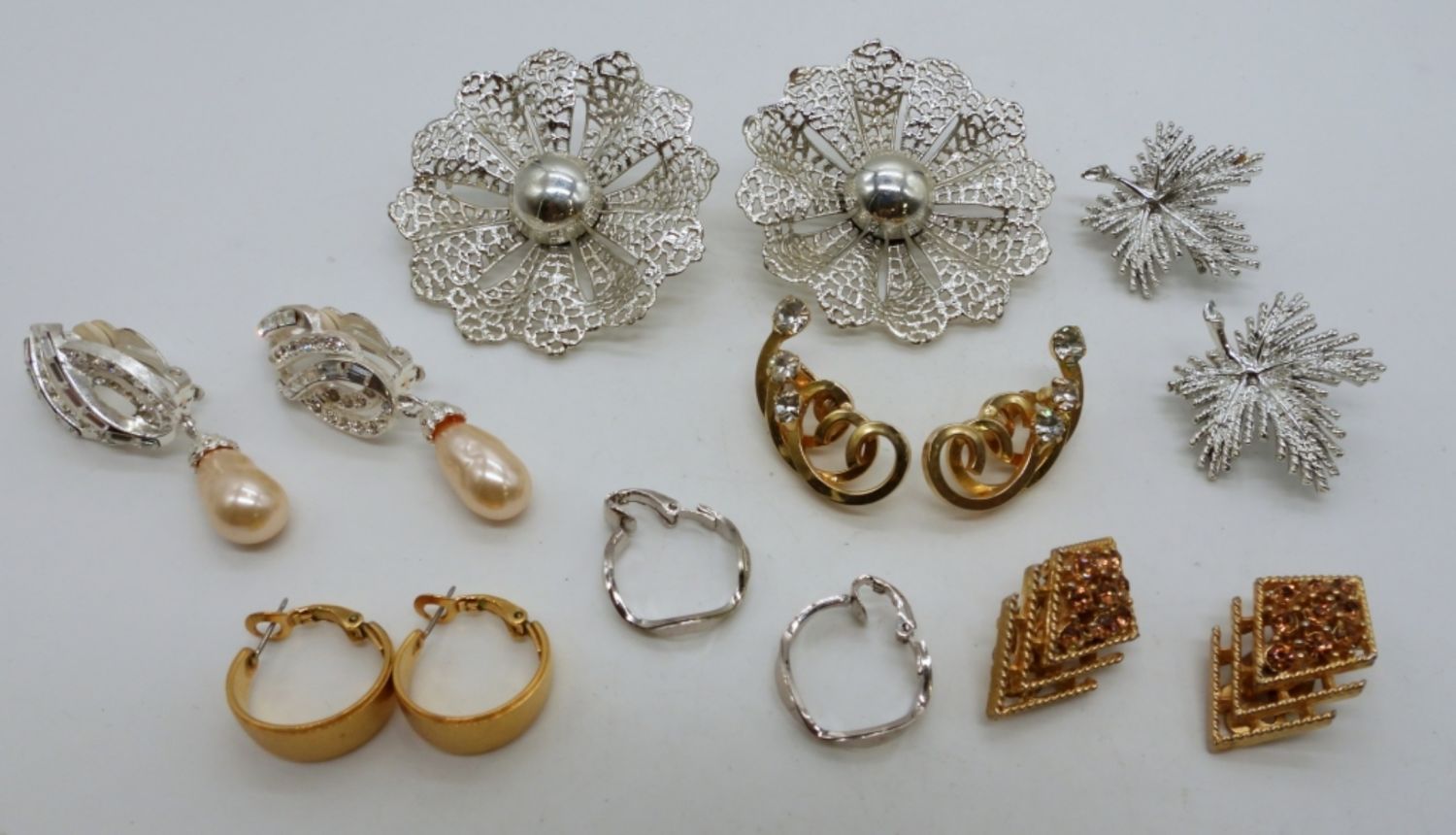 3- SARAH COV (SILVER TONE LARGE FLOWER AND MAPLE LEAF PAIR, GOLD TONE WAVE DESIGN WITH CLEAR STONES, 2- TRIFARI SILVER TONE & GOLD TONE HOOPS, 1 LISNER GOLD TONE WITH YELLOW STONES, 1- CARO SILVER TONE CLEAR STONES AND FAUX PEARL, ALL ARE STAMPED BY MAKER