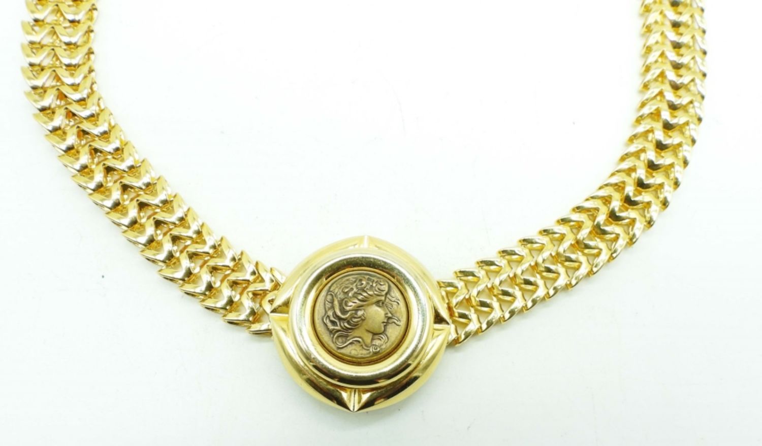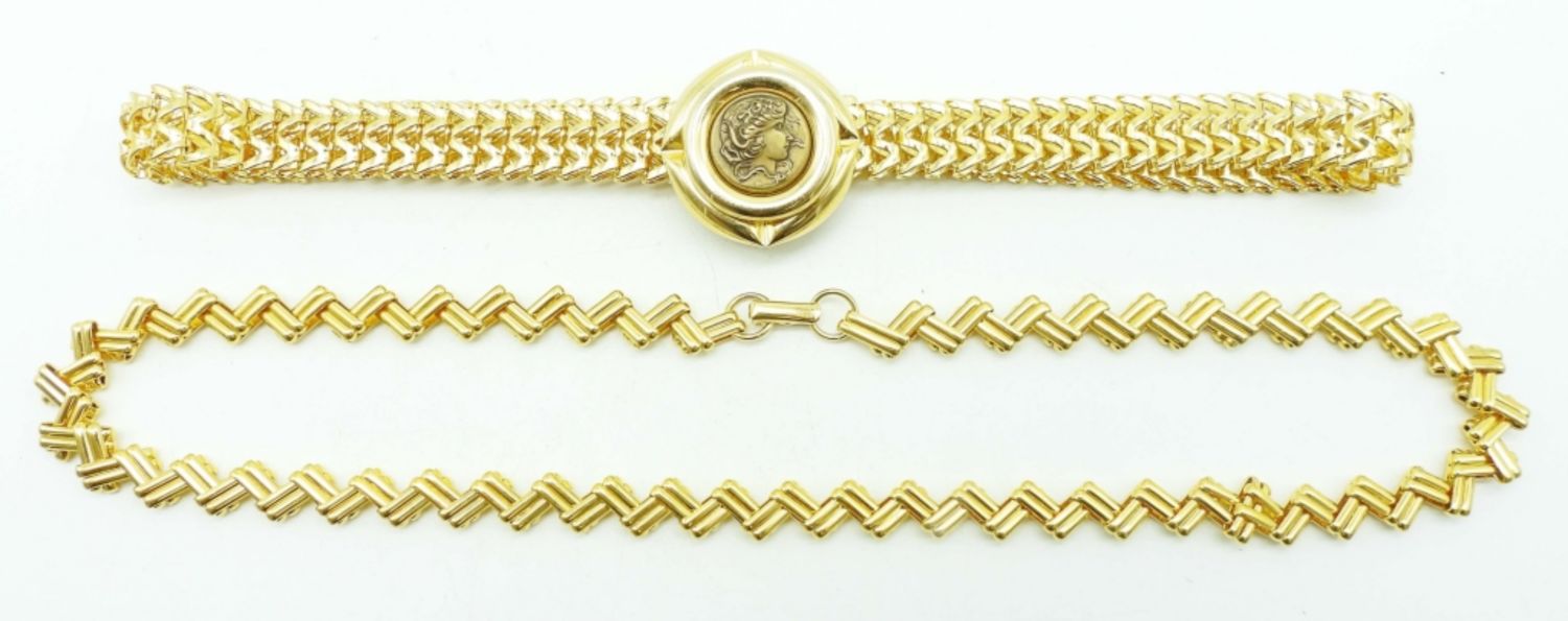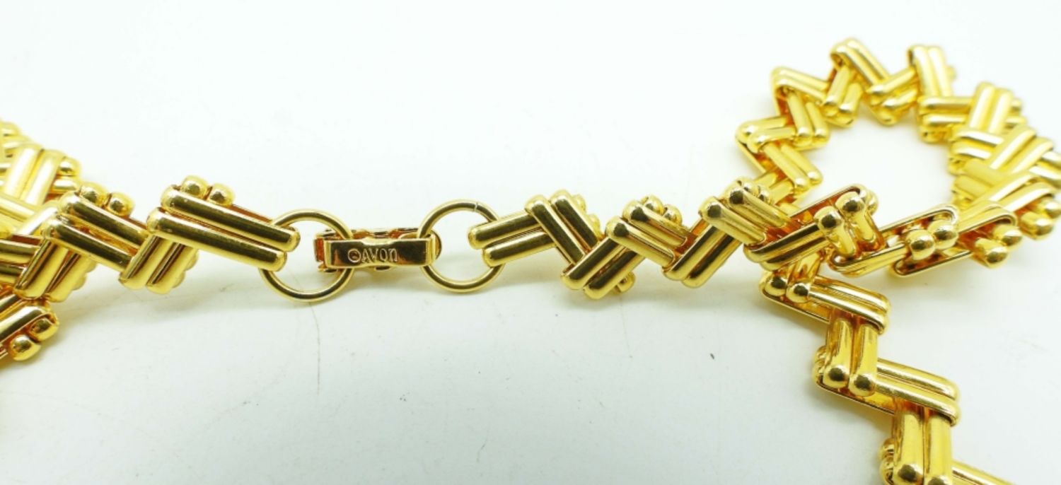 18IN LONG GOLD TONE W/ OPEN BOX CLASP AVON BRAND AND STAMPED, CAMEO STYLE CHOKER 16IN LONG