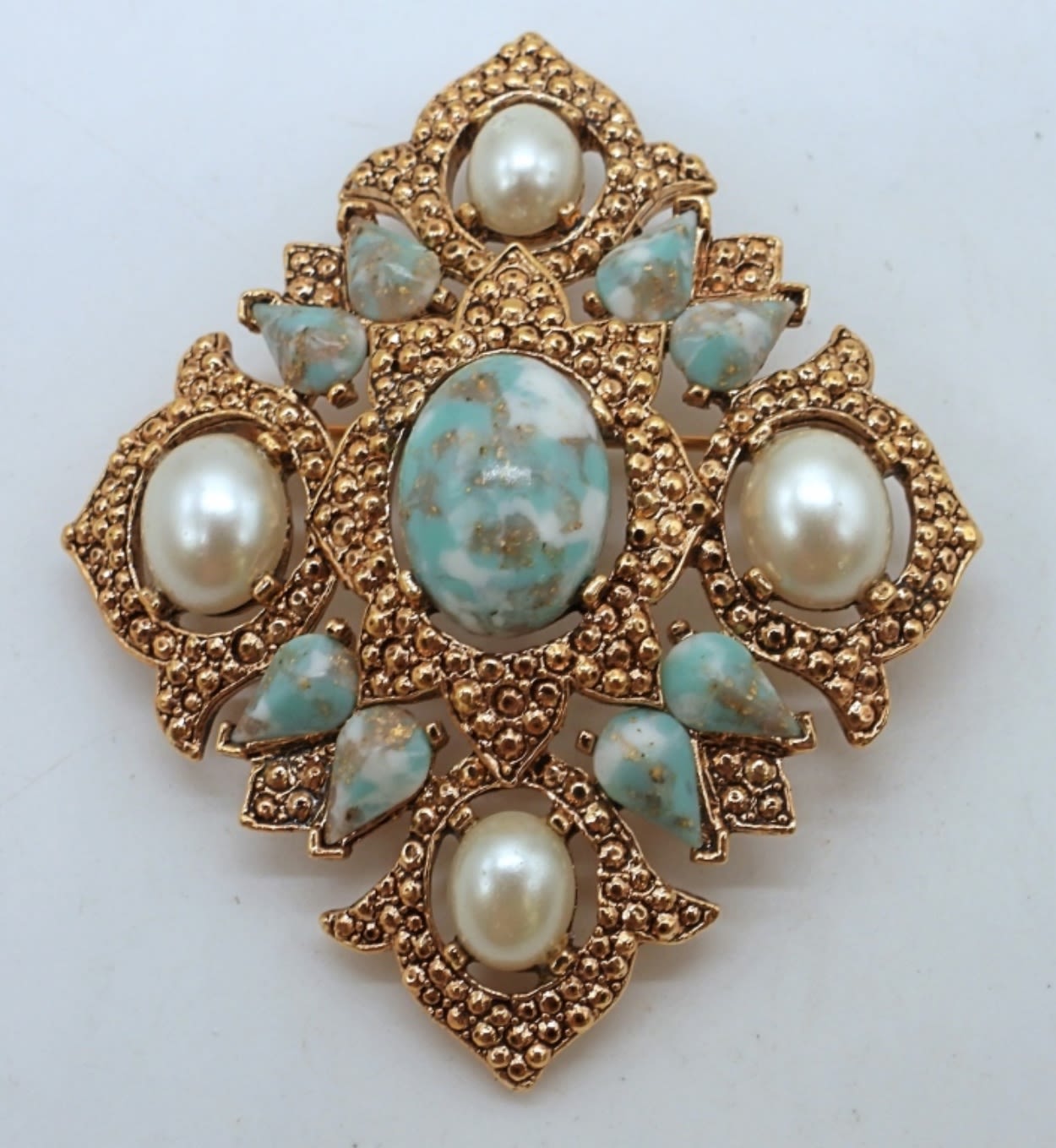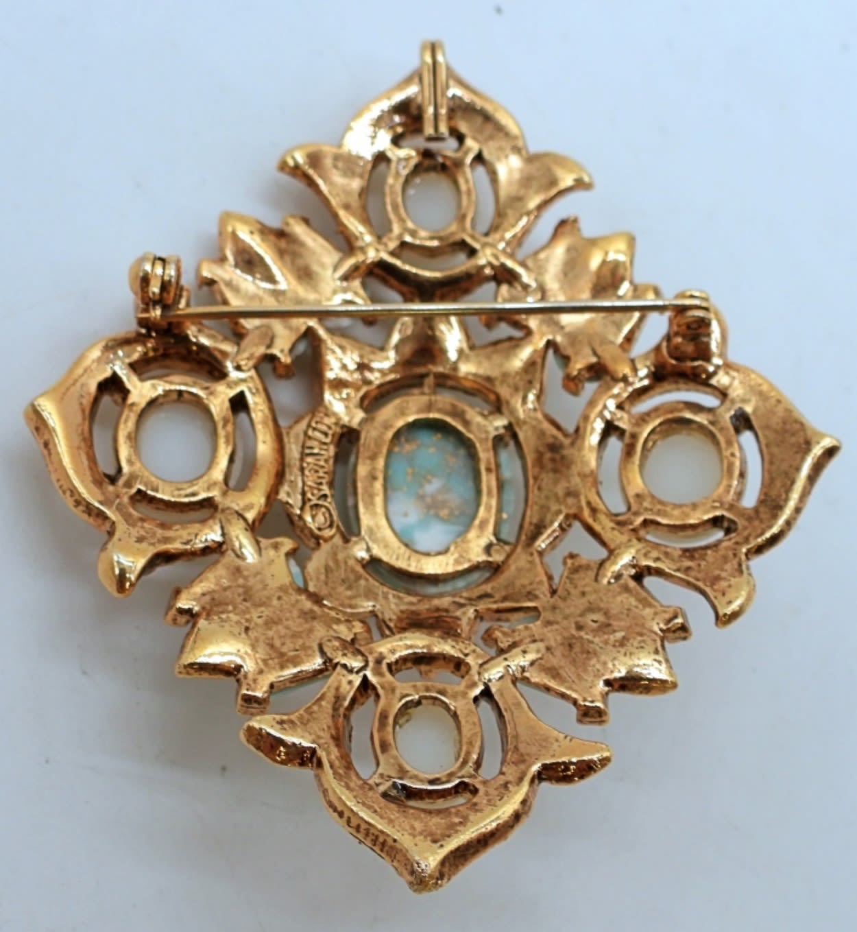 3IN LONG, GOLD TONE W/ FAUX PEARL AND BLUE/ WHITE NATURAL STONES, STAMPED W/ SARAH COV ON THE BACK