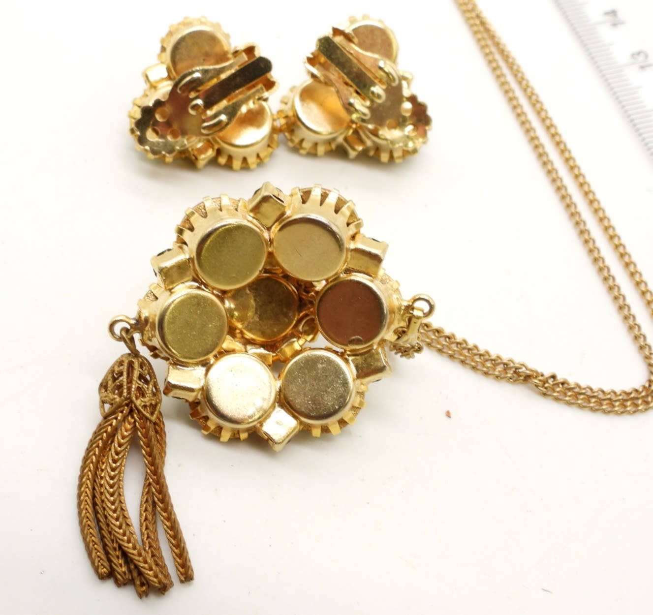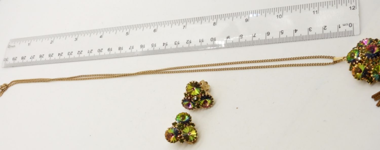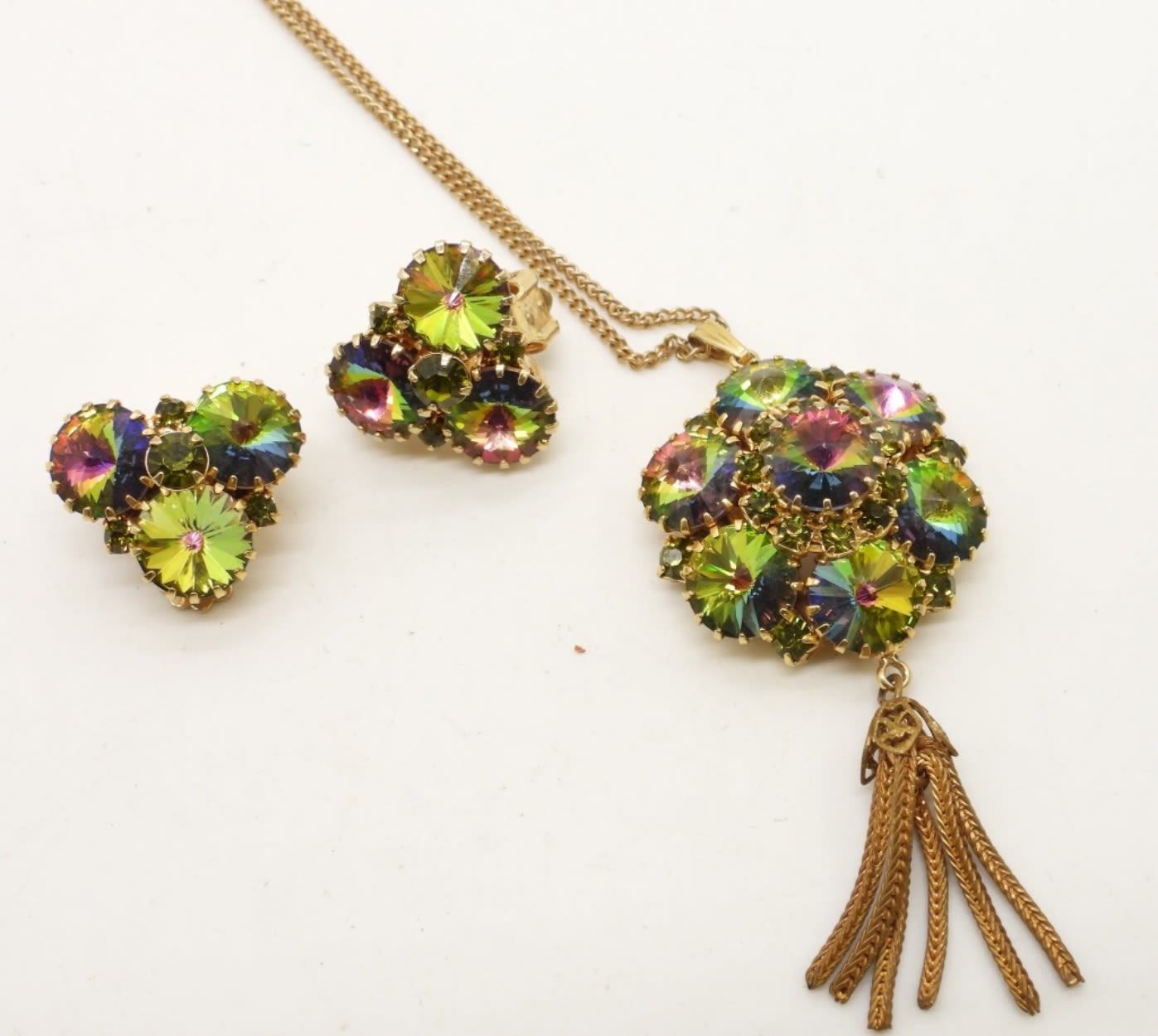 GOLD TONE, WITH AURORA BOREALIS RHINESTONES TASSEL AT THE END OF THE PENDANT, 36IN LONG WITH PENDANT, MATCHING CLIP-ON EARRING